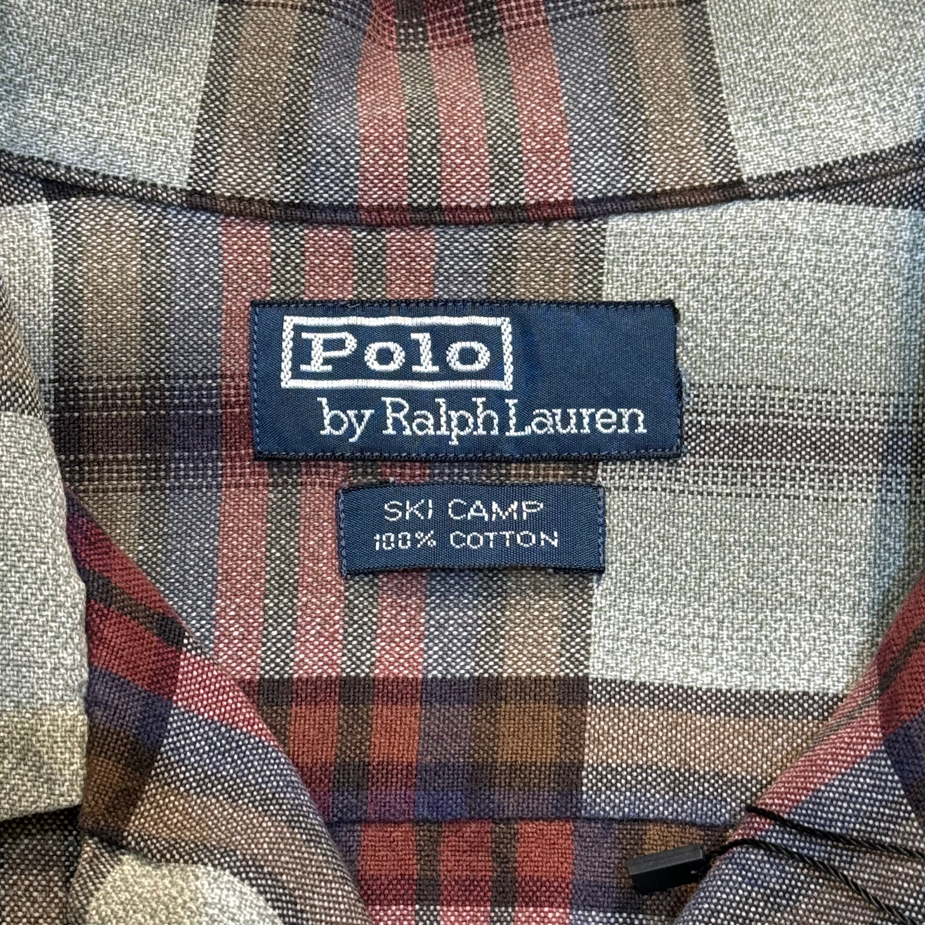 "M位" 90年代 Polo Ralph Lauren ポロラルフローレン 長袖 "SKI CAMP"オープンカラーシャツ 赤 灰 レッド グレー 古着 古着屋 高円寺 ビンテージ n51021