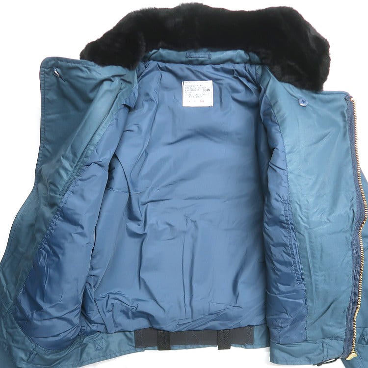 ■説明:未使用のためコンディション良好です。カナダ軍屈指の名作のフライトジャケット。中綿の入るヘビーアウター。襟に黒ボアと裾リブがつき、風の侵入を防ぐフライトジャケットらしいディテールです。青みの強いエアフォースブルーが非常にクールです。
