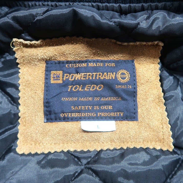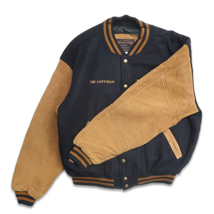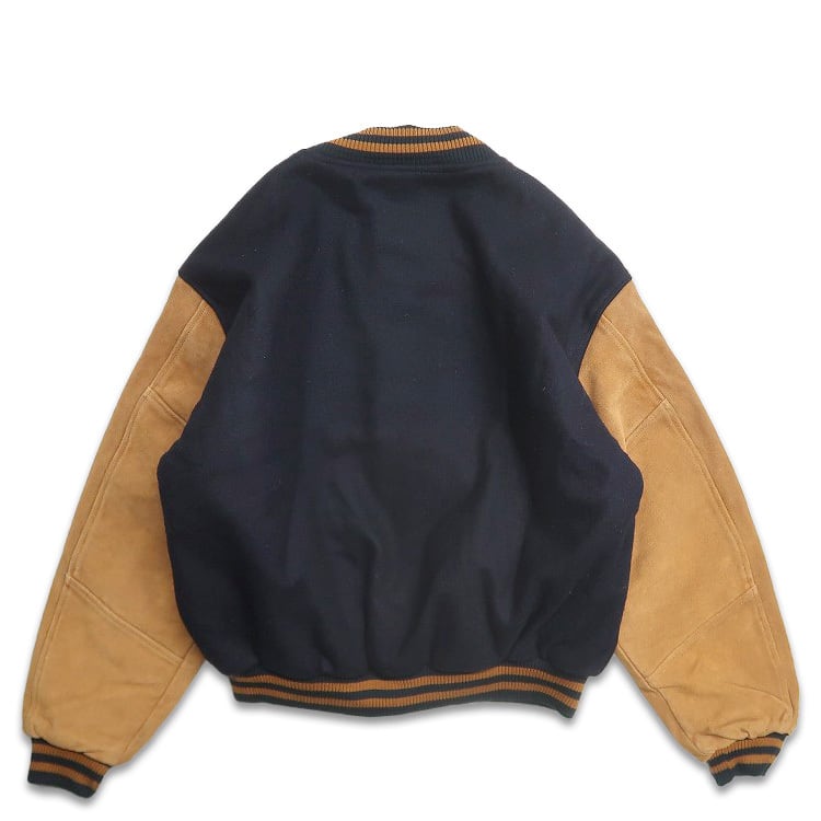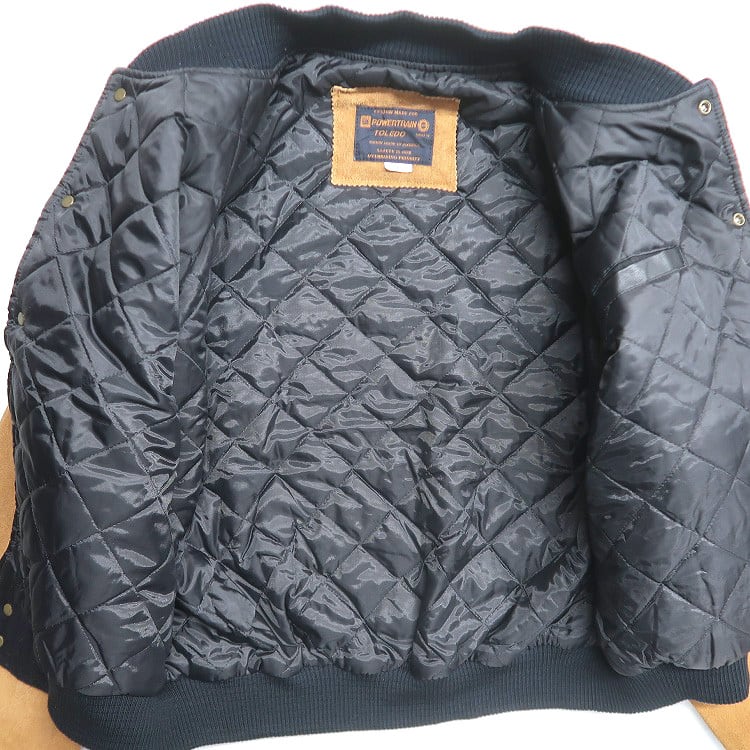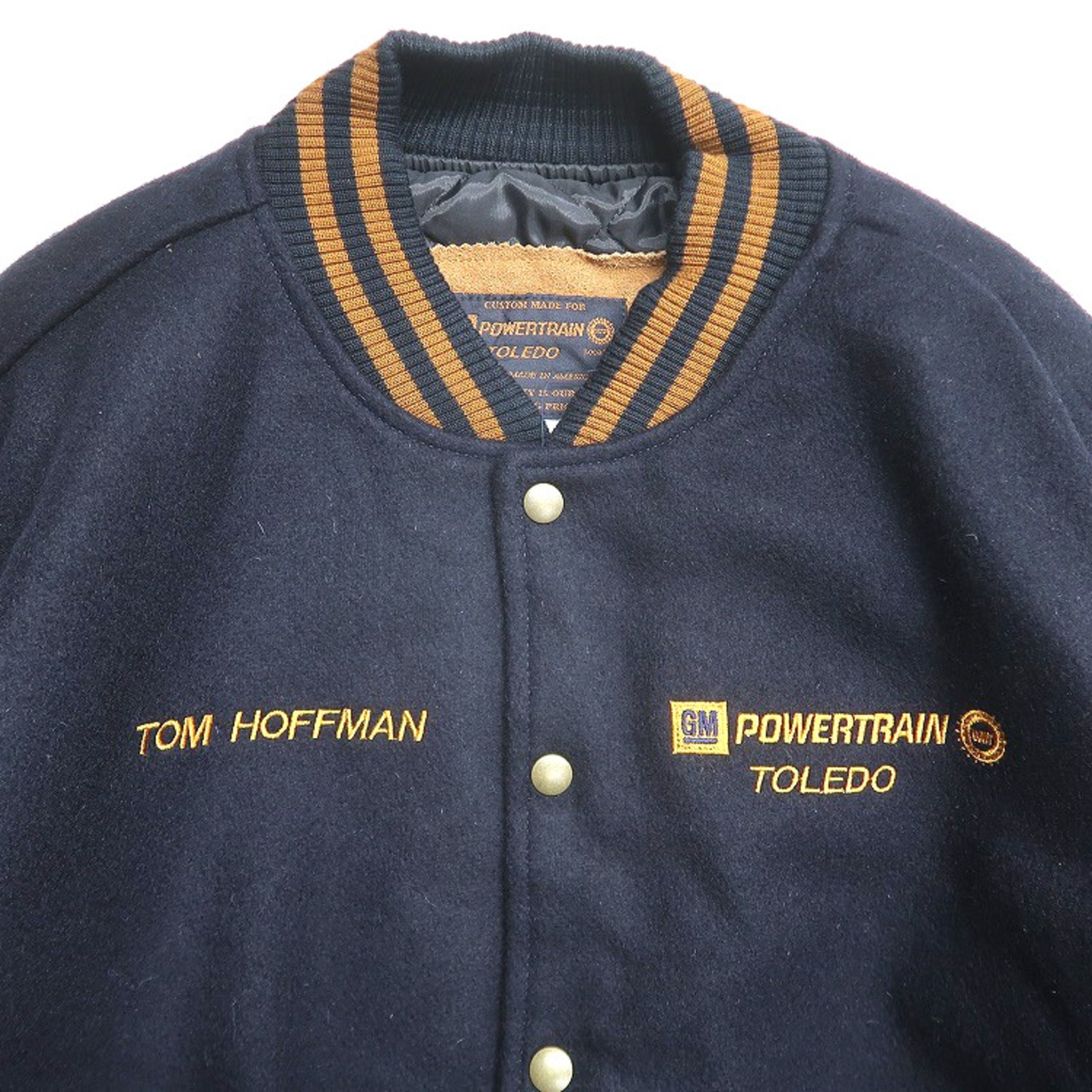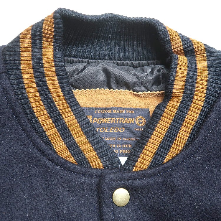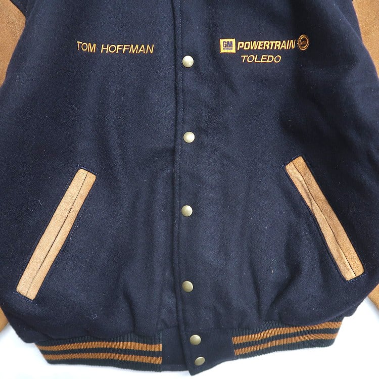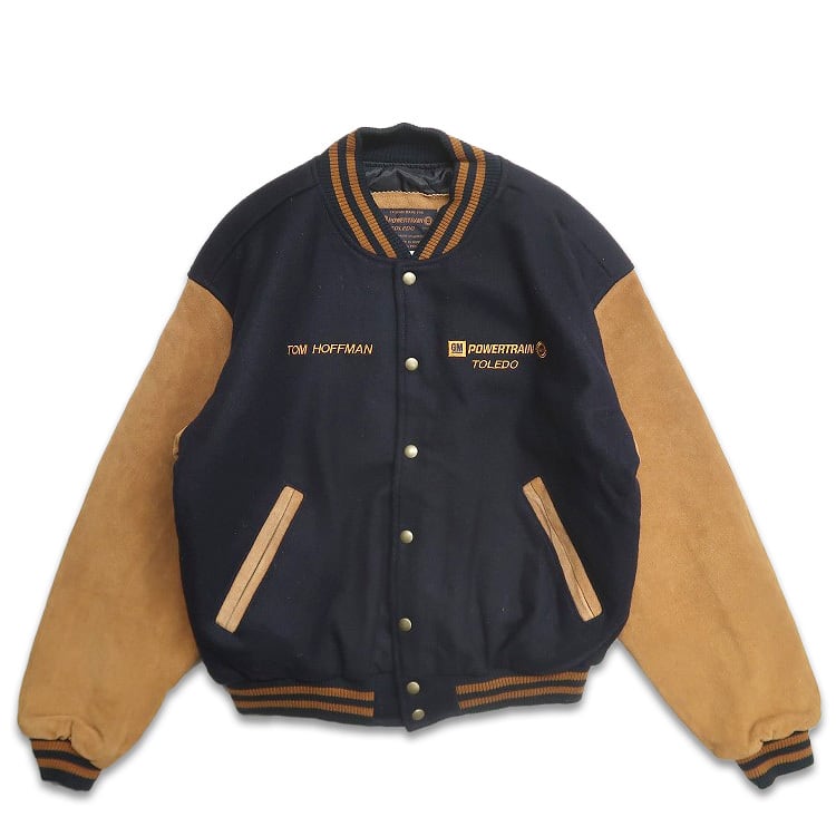 古着 USA製 POWERTRAIN GMパワートレイン・トレド 刺繍 ウール 袖レザー スウェードレザー 切り替え スタジャン 刺繍 ネイビー ベージュ 表記:L gd408210n w51225 | 古着屋SLAT オンラインショップ 【古着通販】|東京 高円寺 レギュラー・ヴィンテージ古着