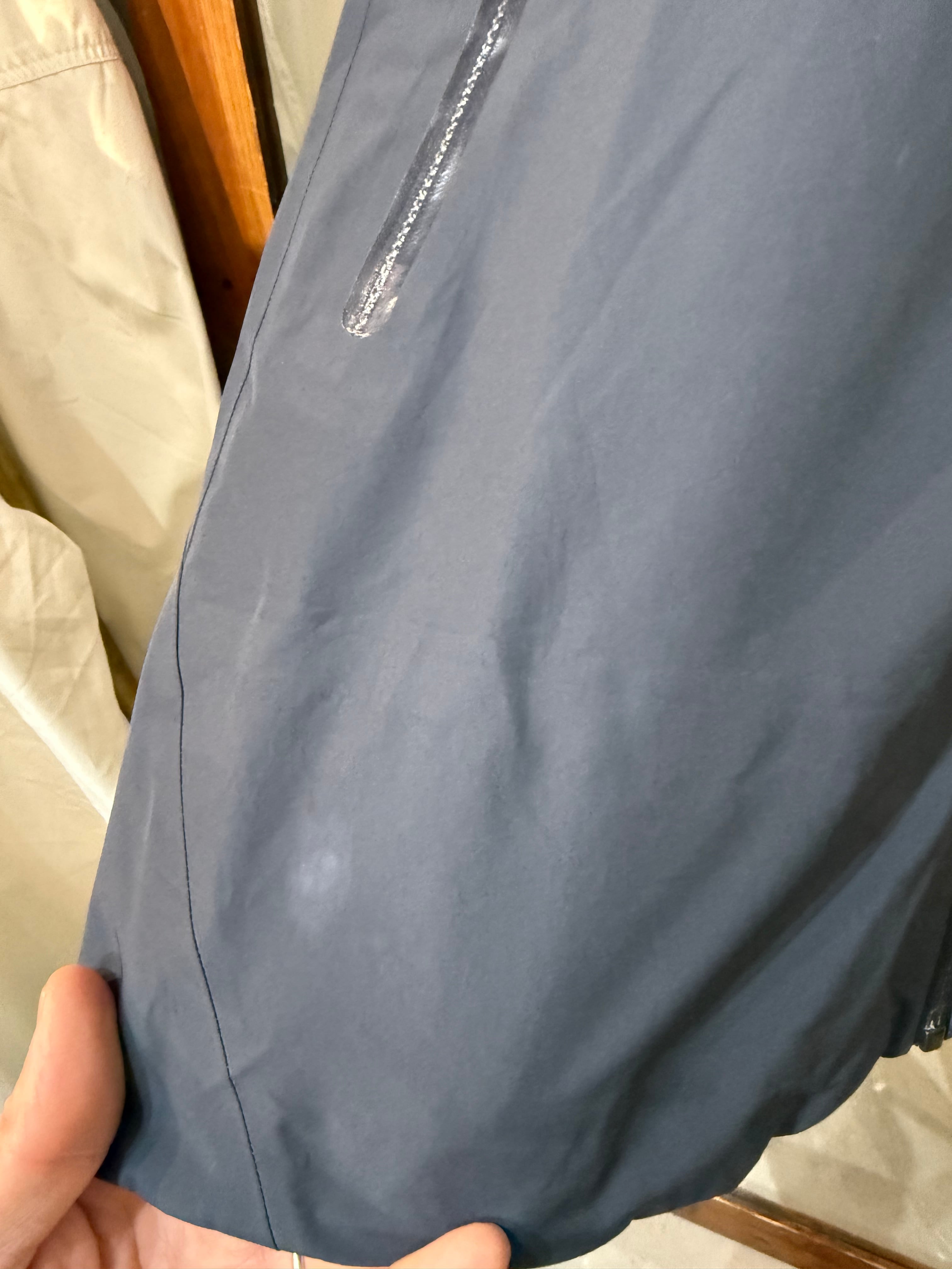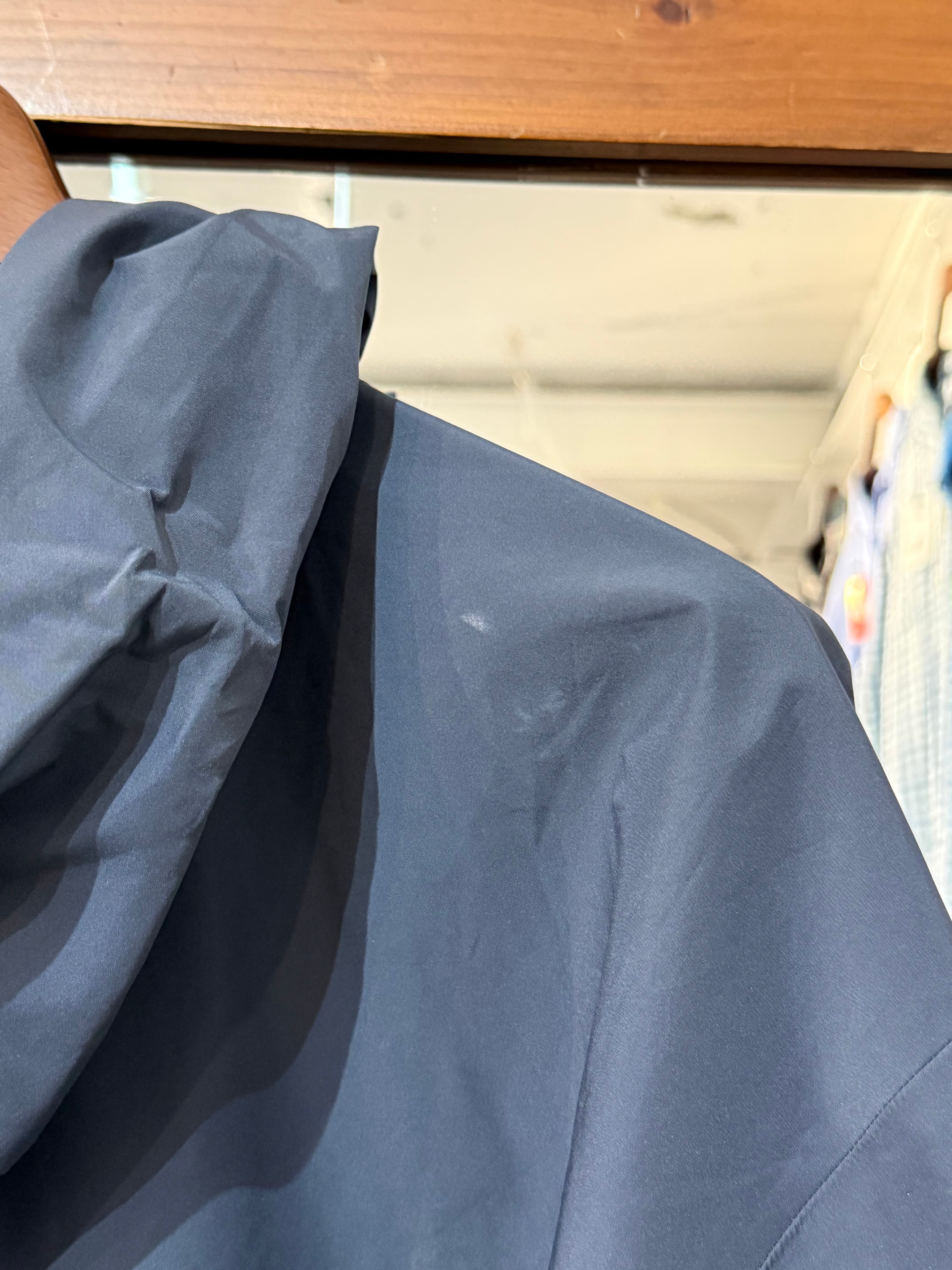 フロント裾先、背面フード、肩、右袖先の4箇所に色抜けがございました。僅かな色抜けがございます。