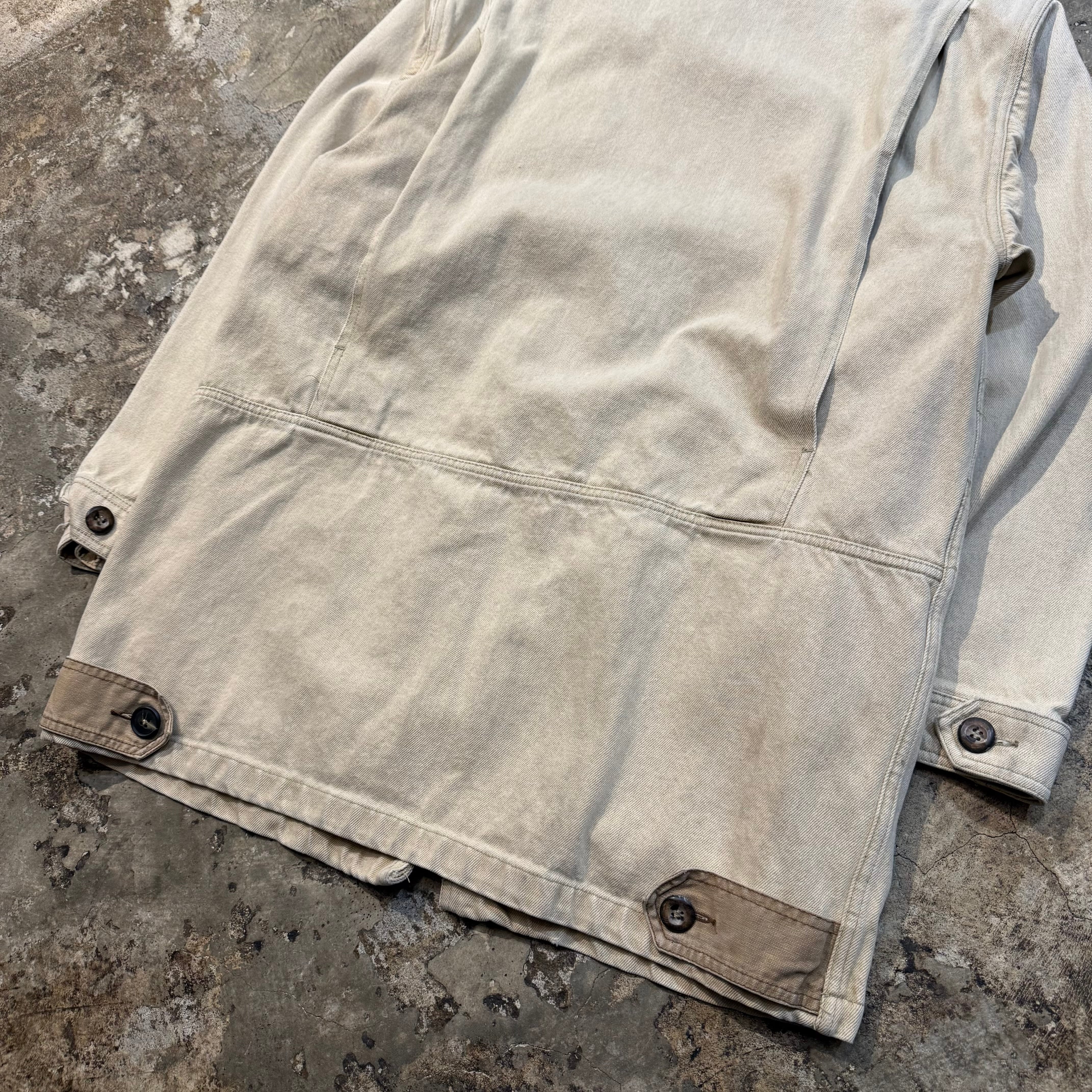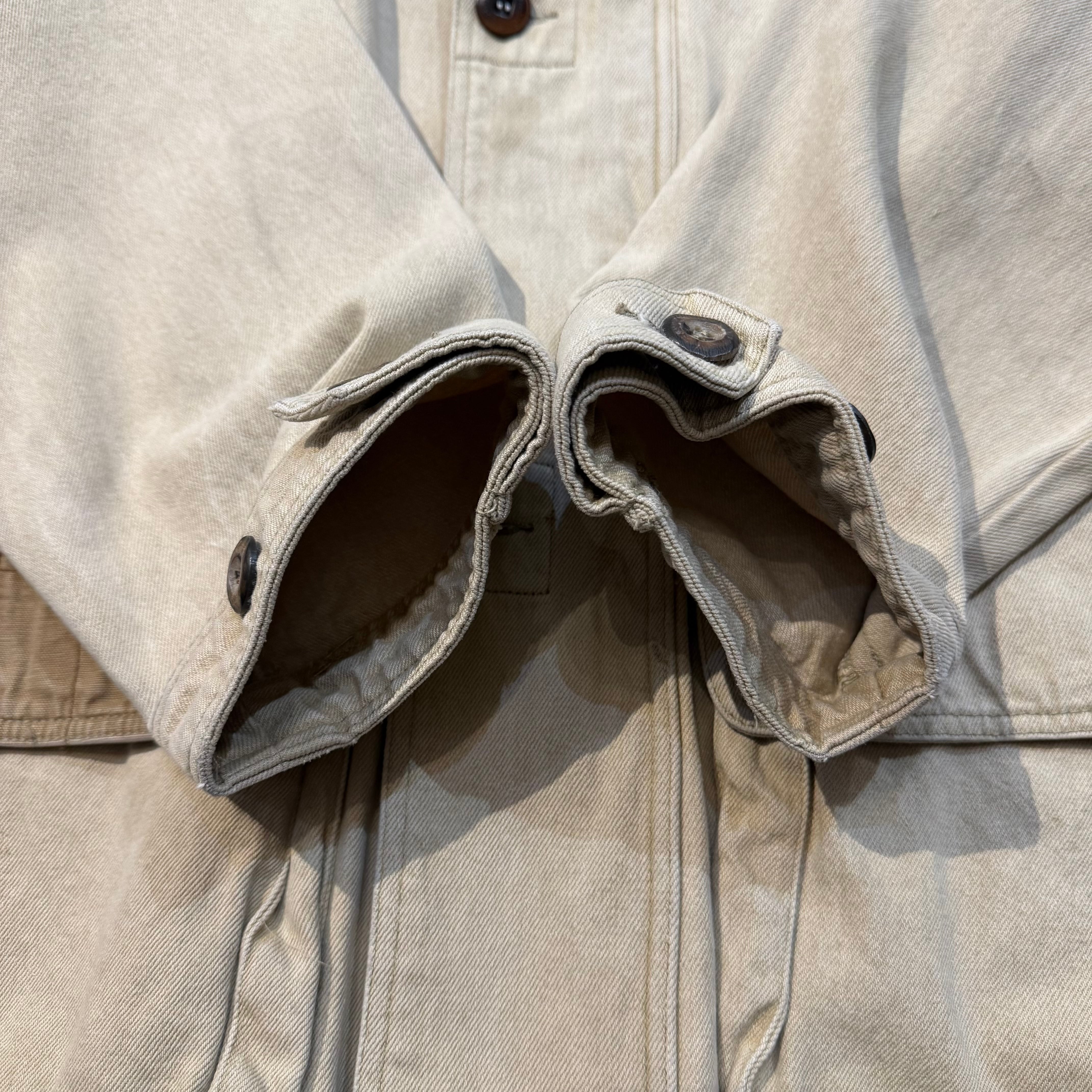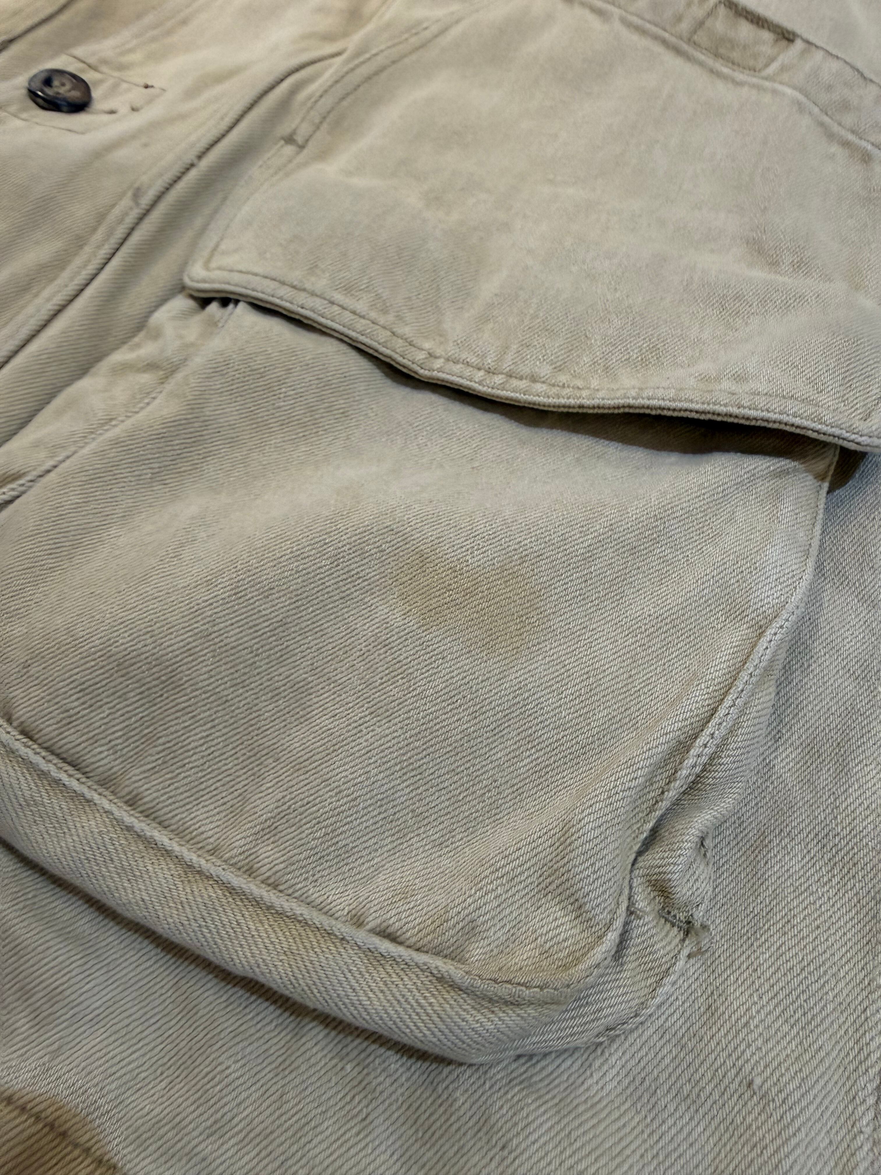 胸のジップポケットや弾薬ポケットが着くデザインが特徴的です。素材はダック地なので存在感のある一着です。