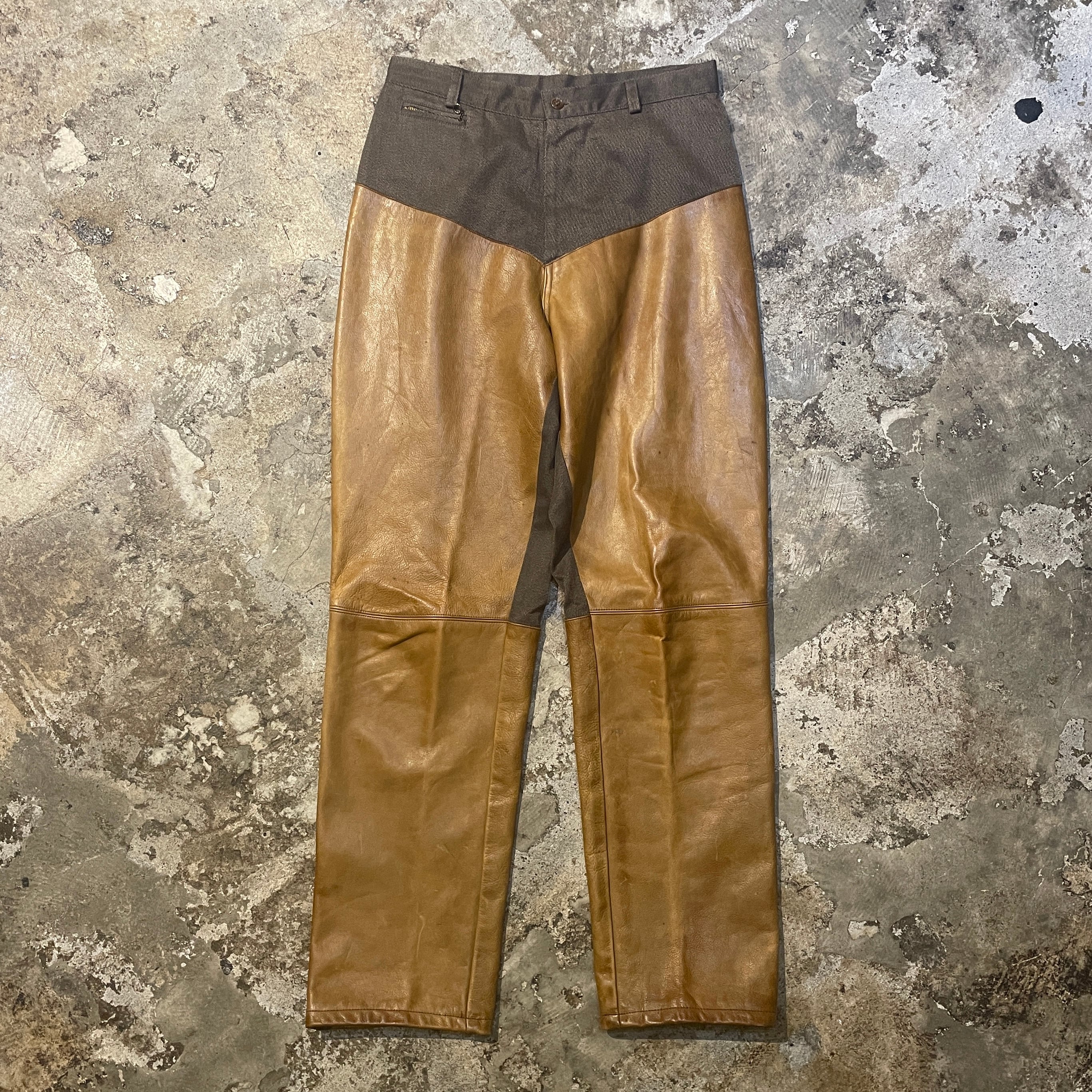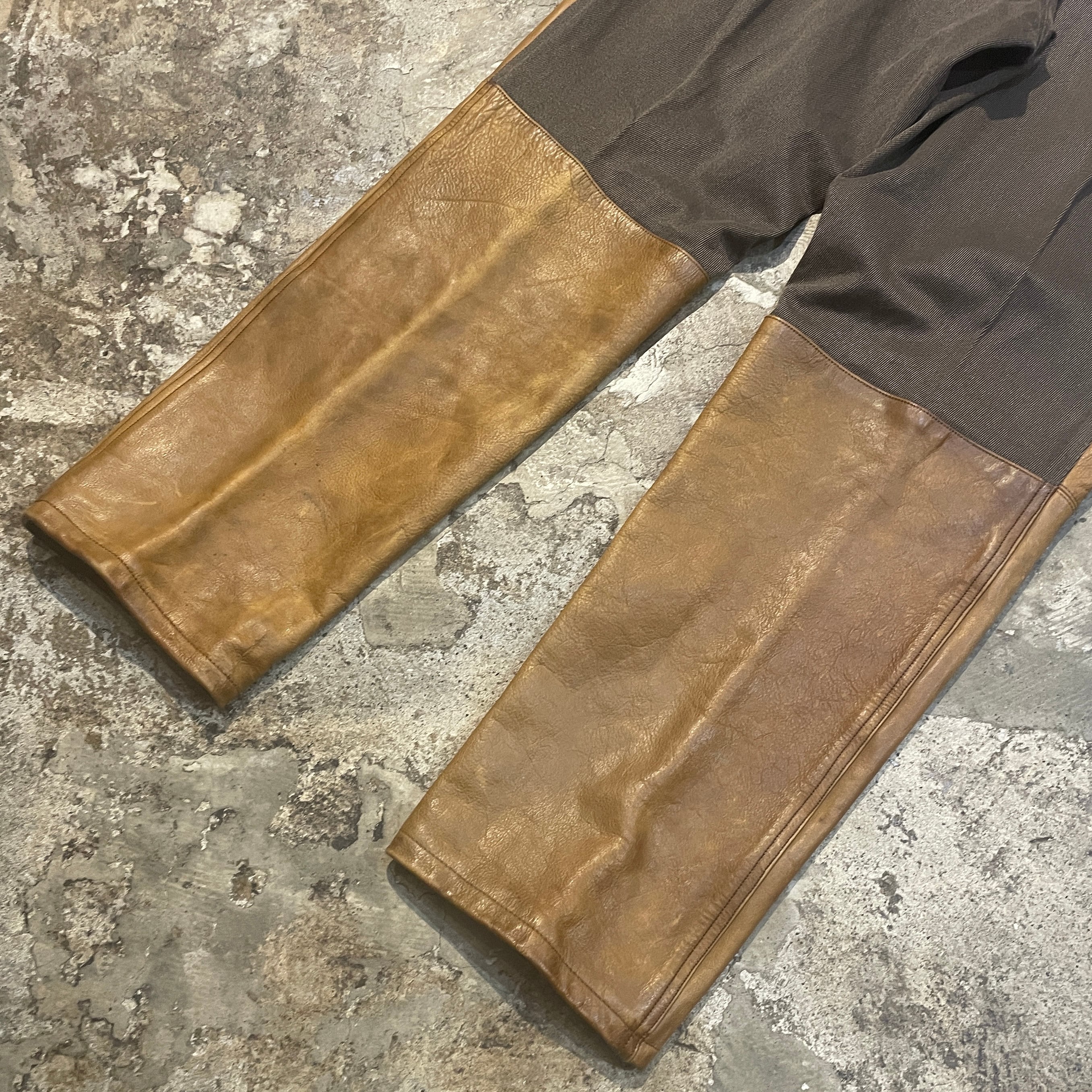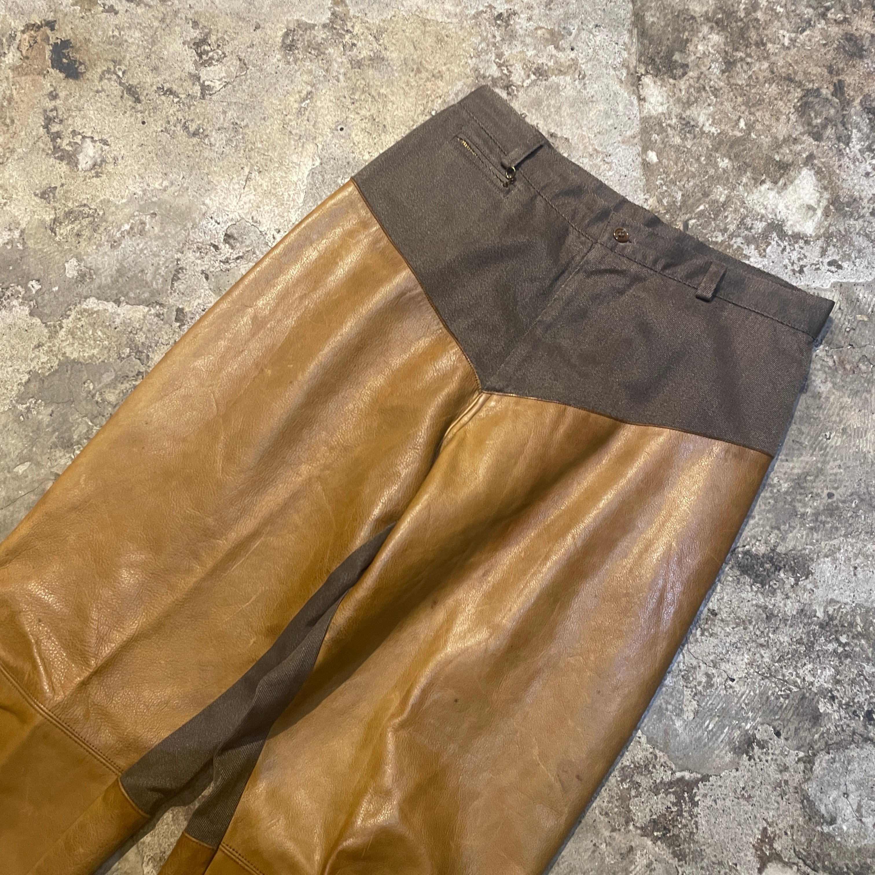 商品説明 :90年代アメリカ製Ralph Laurenのハンティングパンツになります。上部は上質なコットンギャバジン、フロントには経年変化が楽しめるレザーを切り替えた存在感ある一本です。