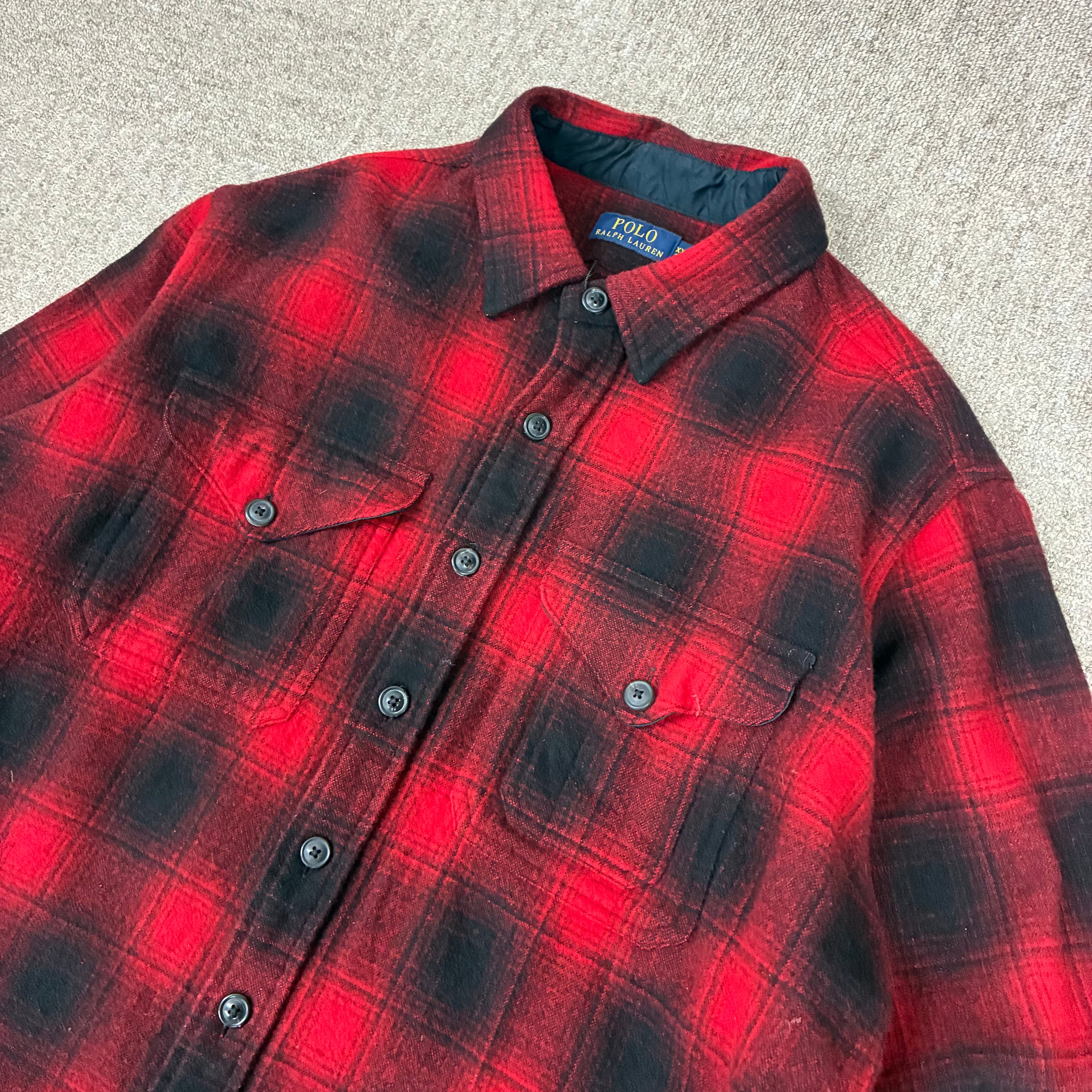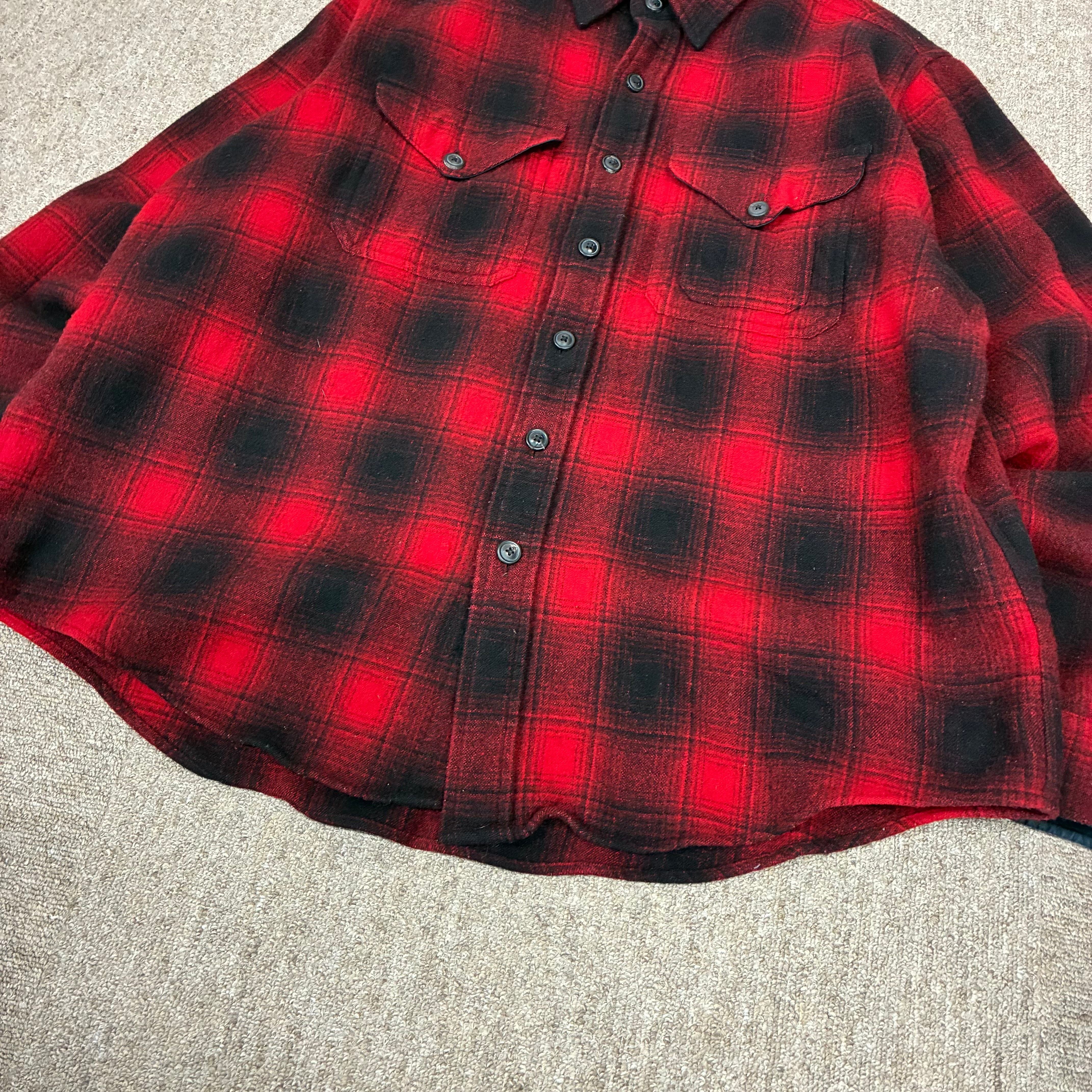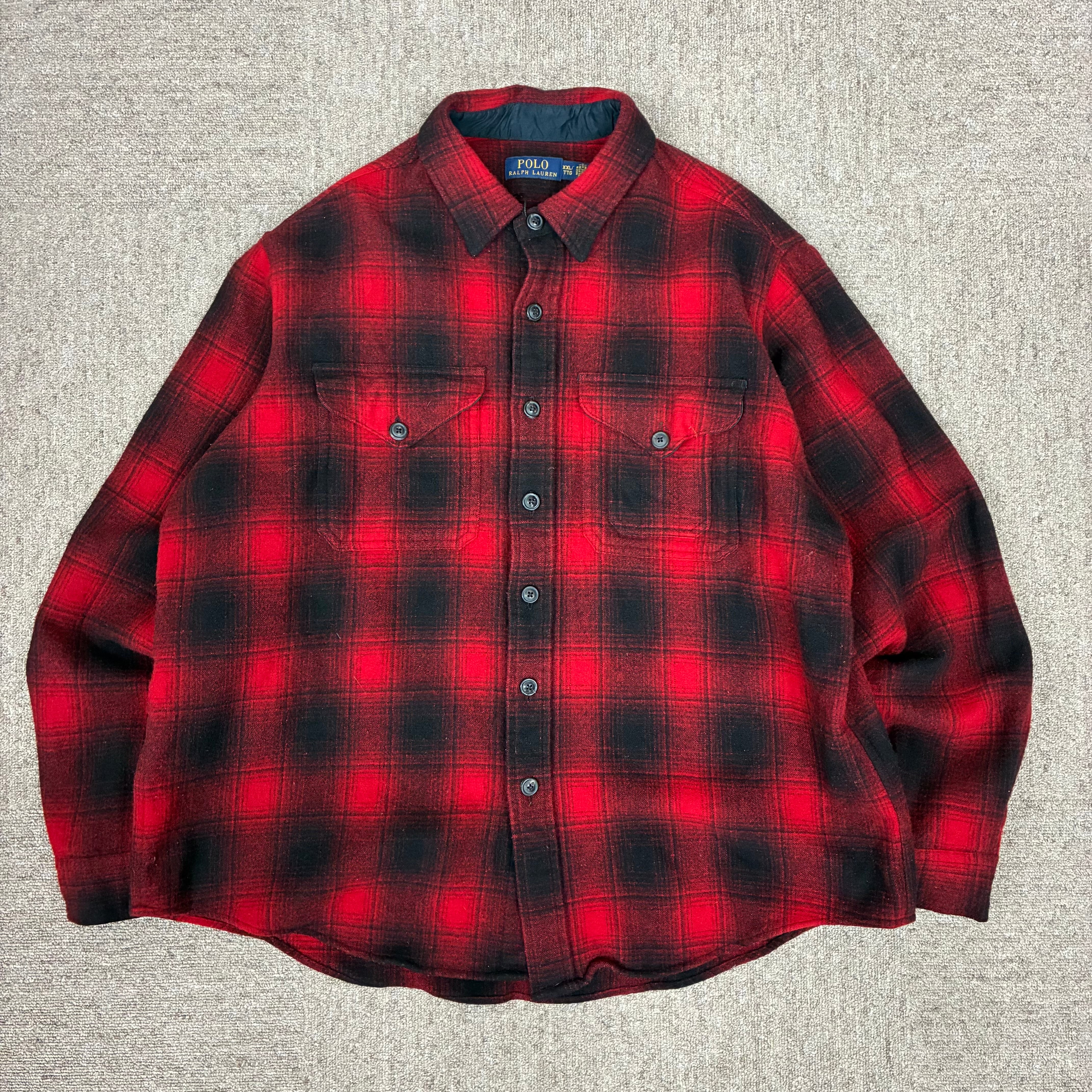 商品説明 :ラルフローレンのウールシャツ。目を引く赤黒のオンブレチェックの1着。表記XXLですが、いい具合に縮んでおりサイズバランスの良い個体です。是非!