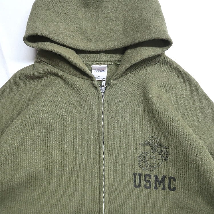 古着 USA製 SOFFE USMC プリント ミリタリー トレーニング ジップアップ スウェットパーカー トレーナー グリーン 表記:XL gd409121n w60416