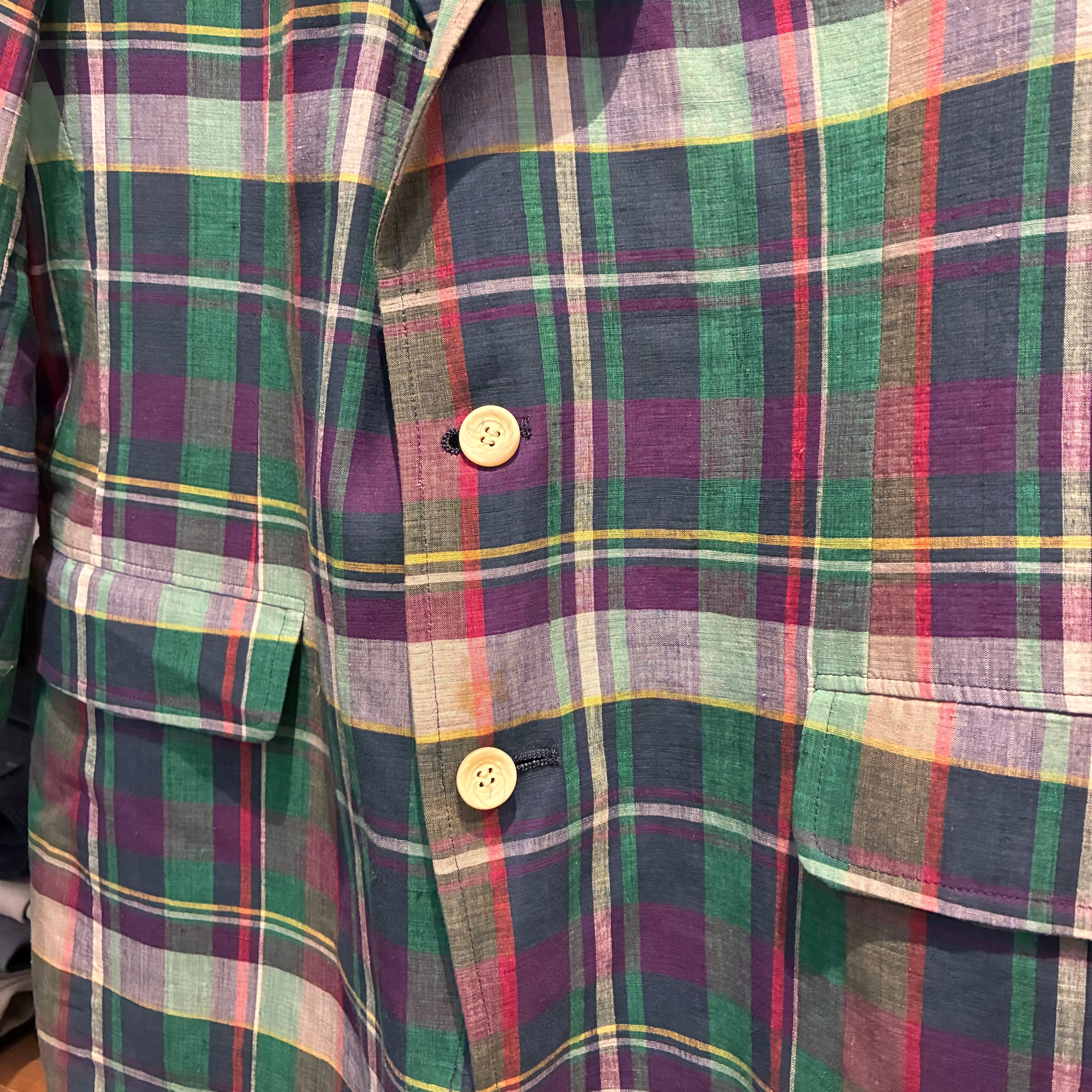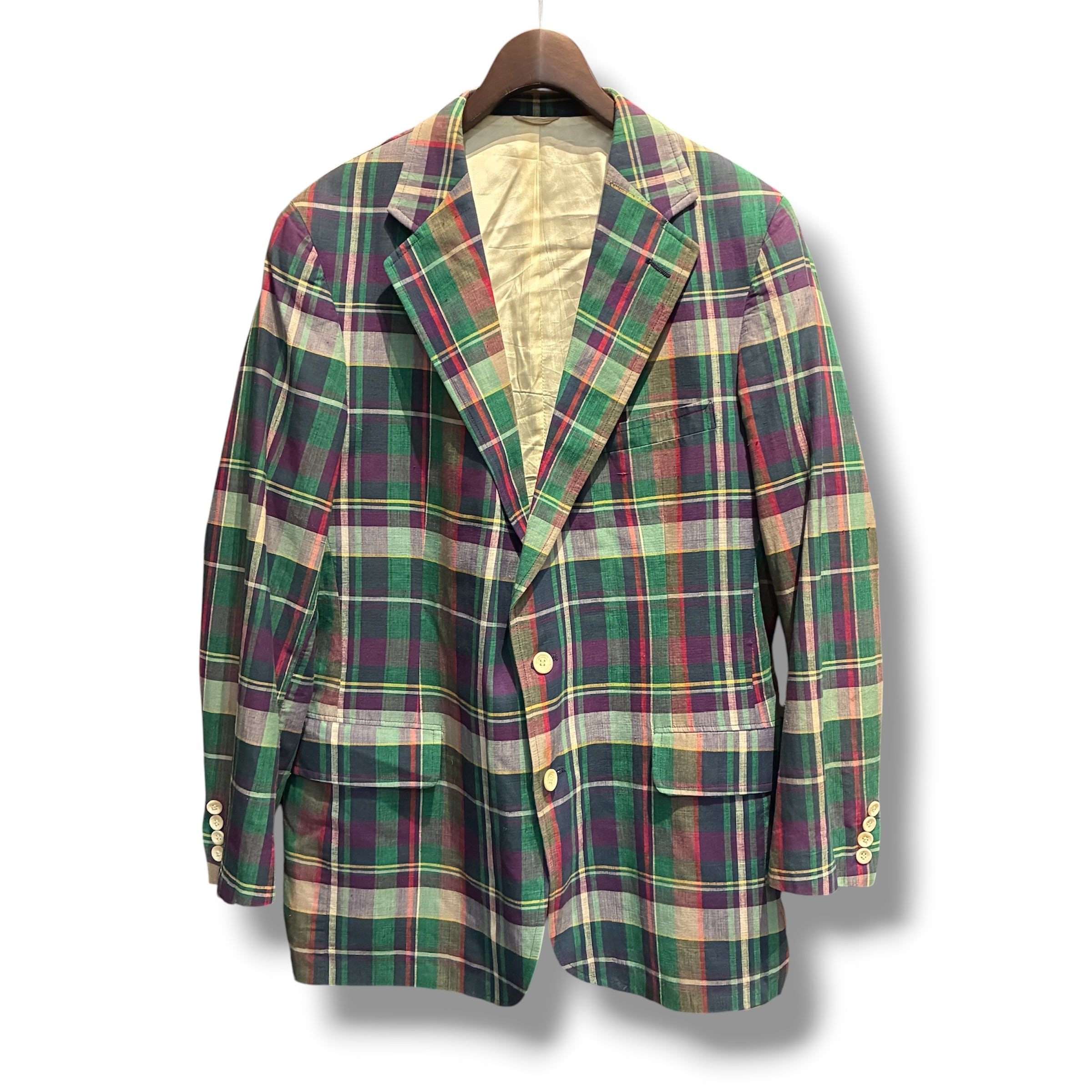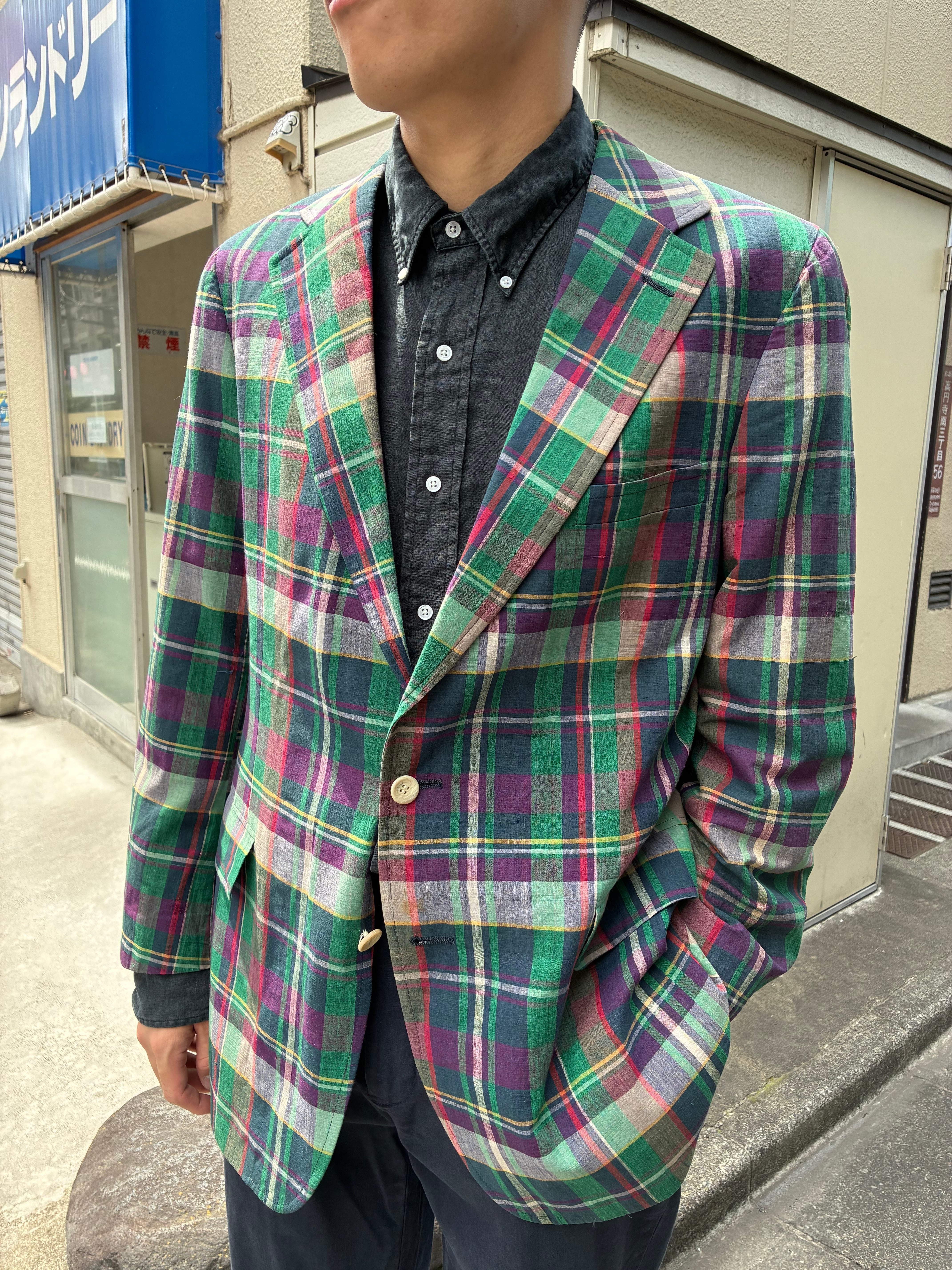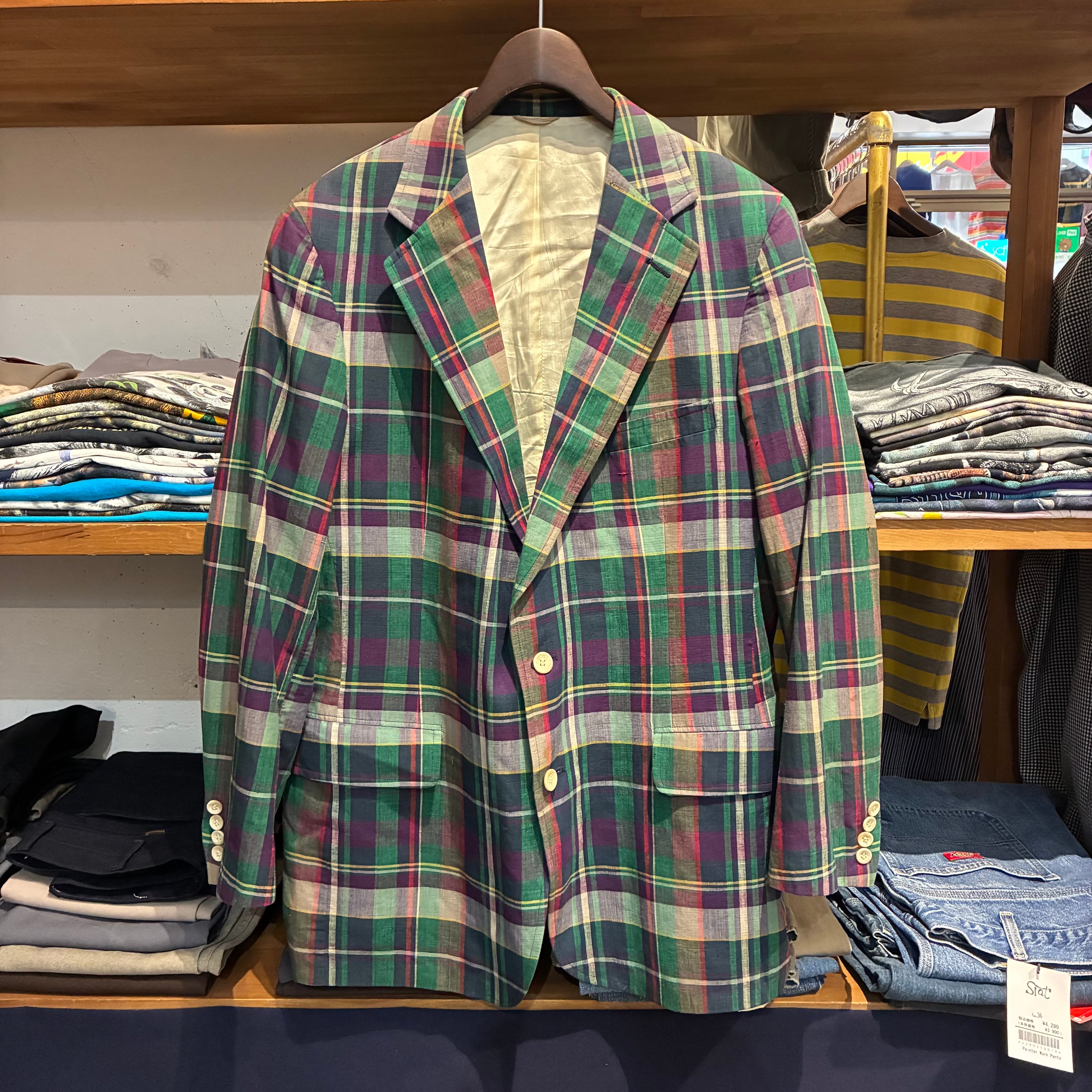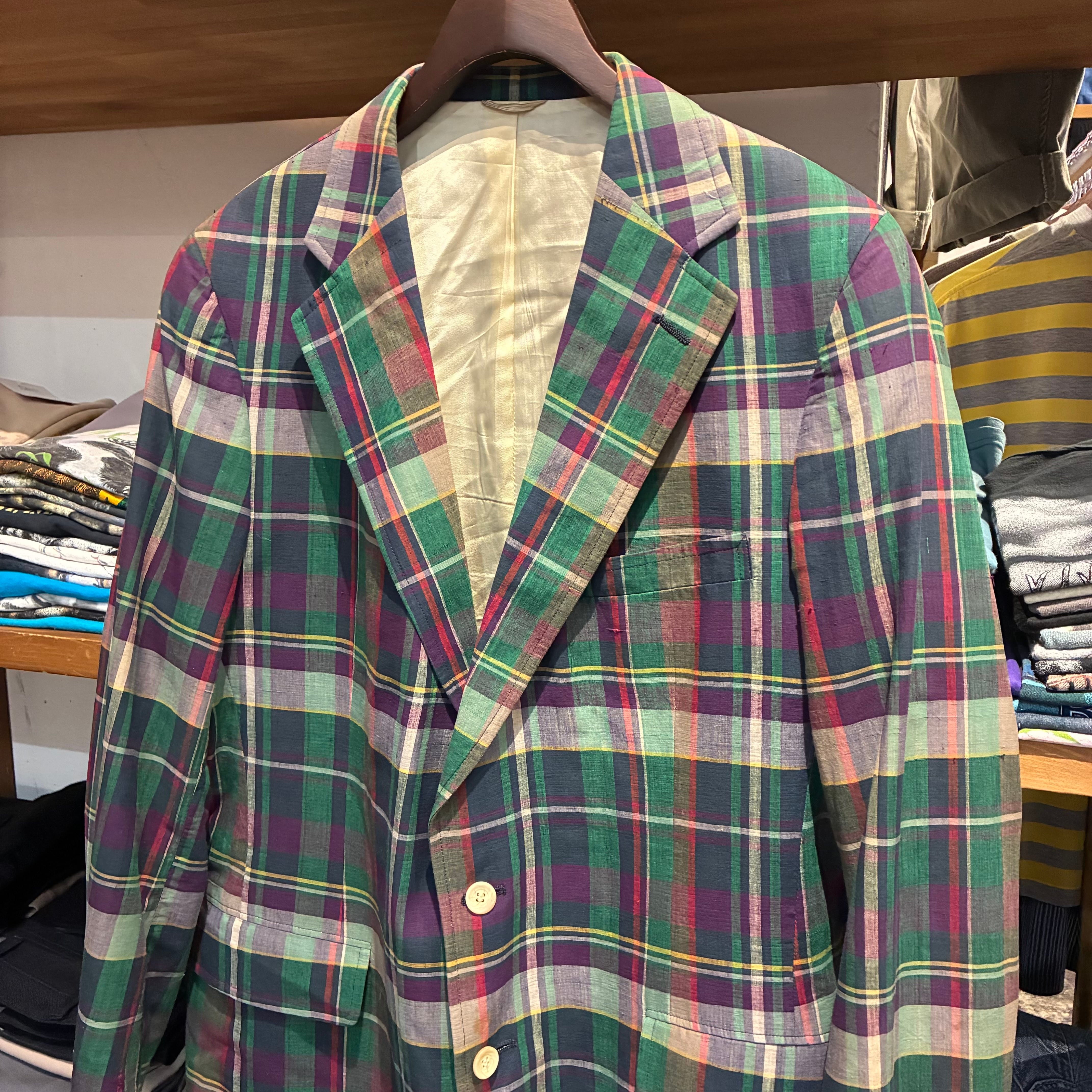 商品説明 :ポロユニバーシティのチェックテーラード。紺ブレなどのイメージがあるので珍しい1着です。ザラつきのある高級感のある生地感となっております!
