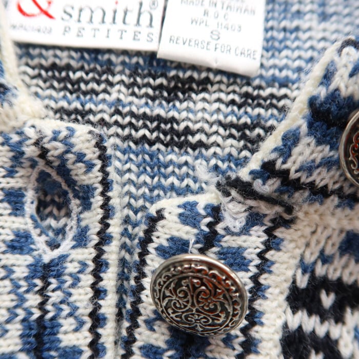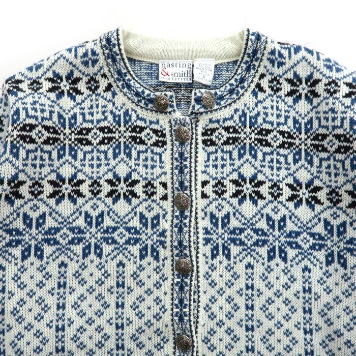 ■説明:全体的に使用感があるほか、フロント上部にダメージがありますが、古着らしい良い雰囲気があります。ホワイトと鮮やかなブルーで雪をイメージさせるノルディック柄がユニセックスでおすすめです◎