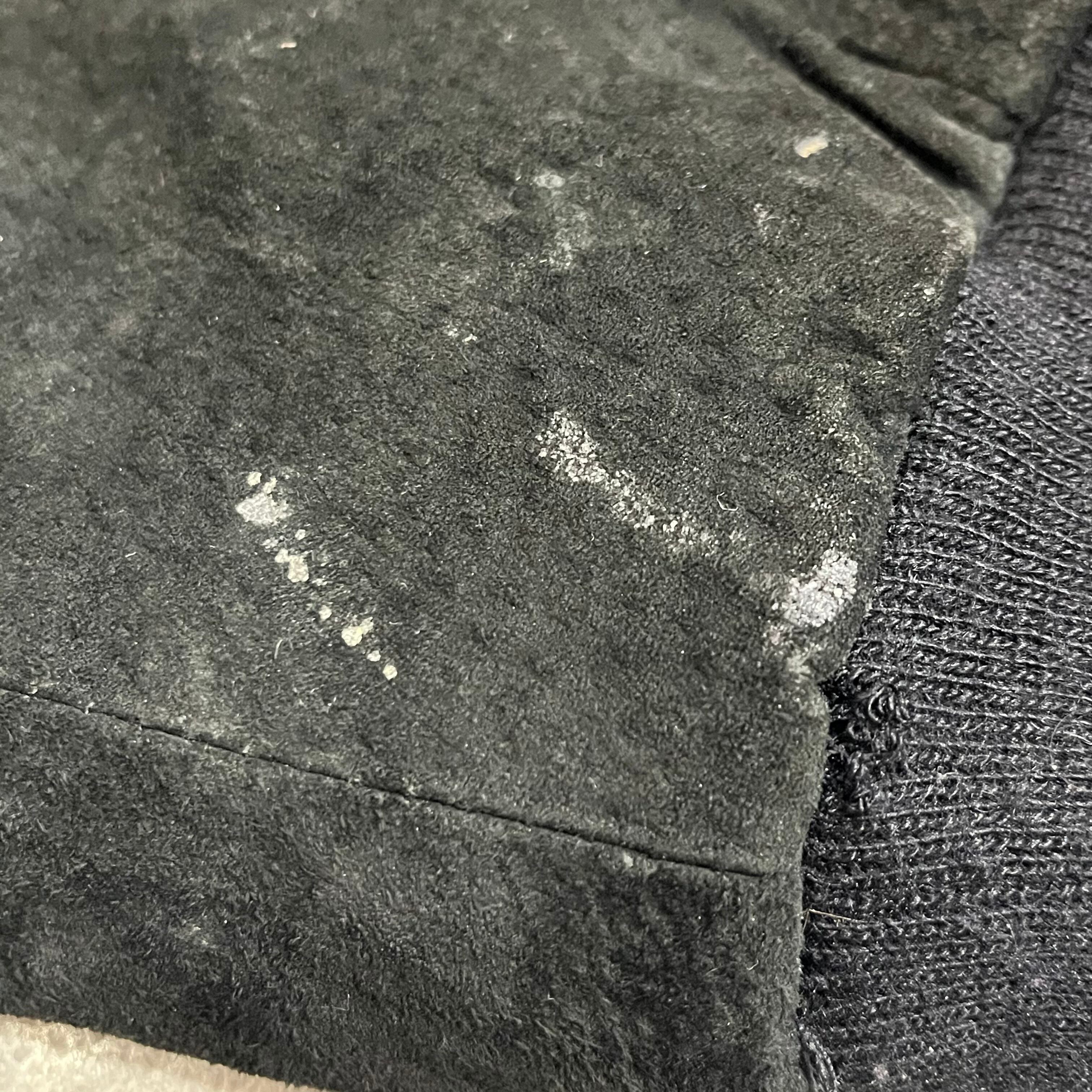 フロント全体・両袖に汚れ、左袖リブにダメージがあります。