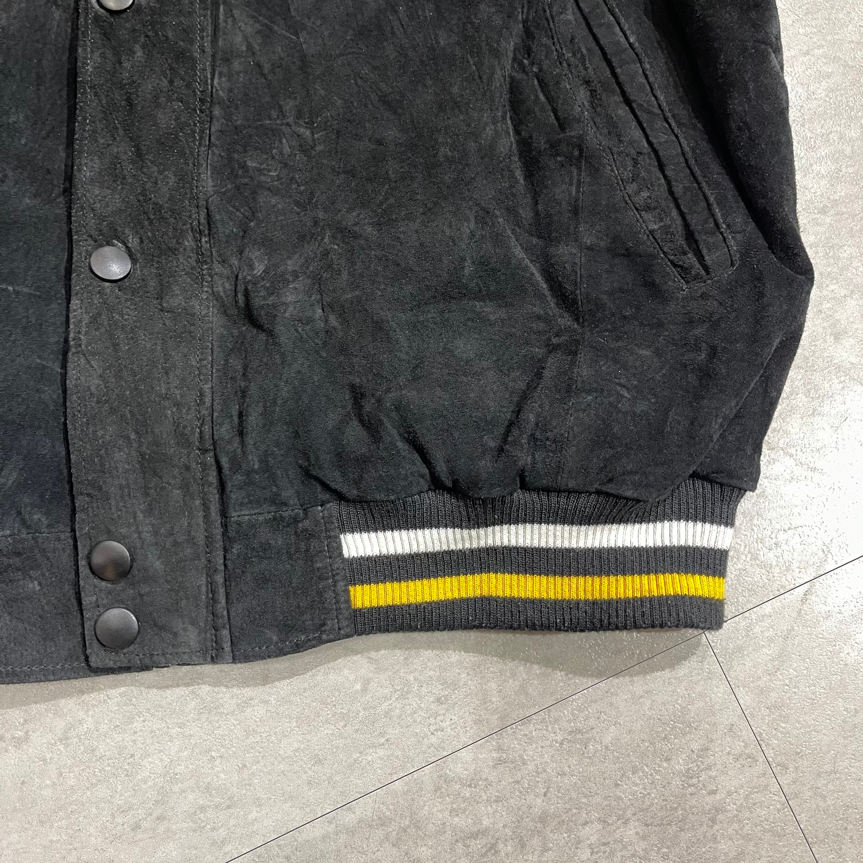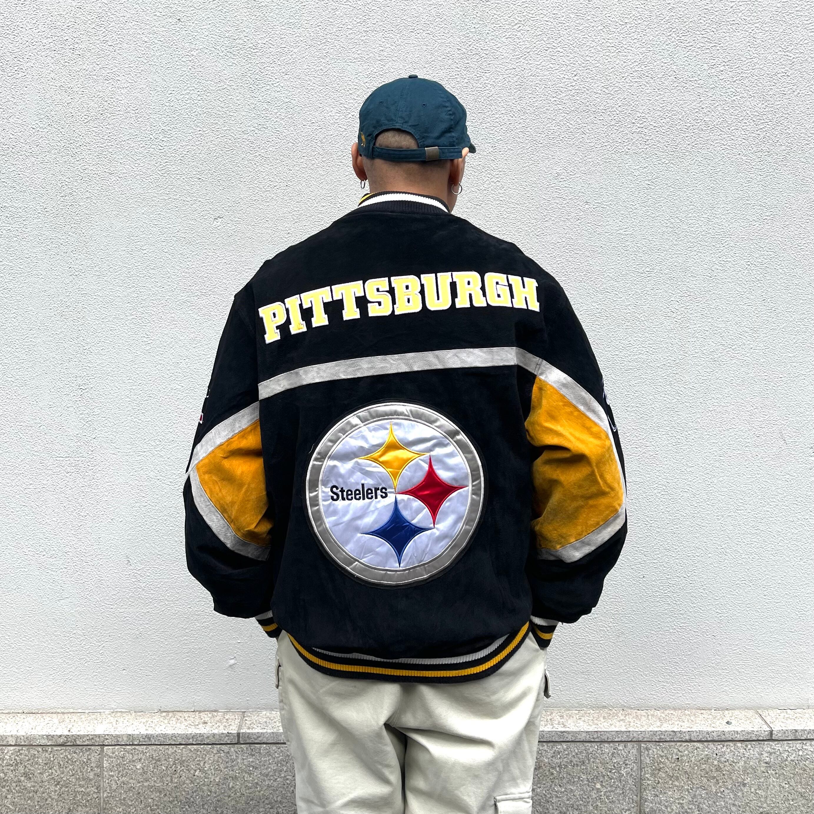 size:XL【 Pittsburgh Steelers 】ピッツバーグ・スティーラーズ レザージャケット スウェード スタジアムジャンパー スタジャン ワッペン NFL ブラック イエロー 黒 黄色 古着 古着屋 高円寺 ビンテージ