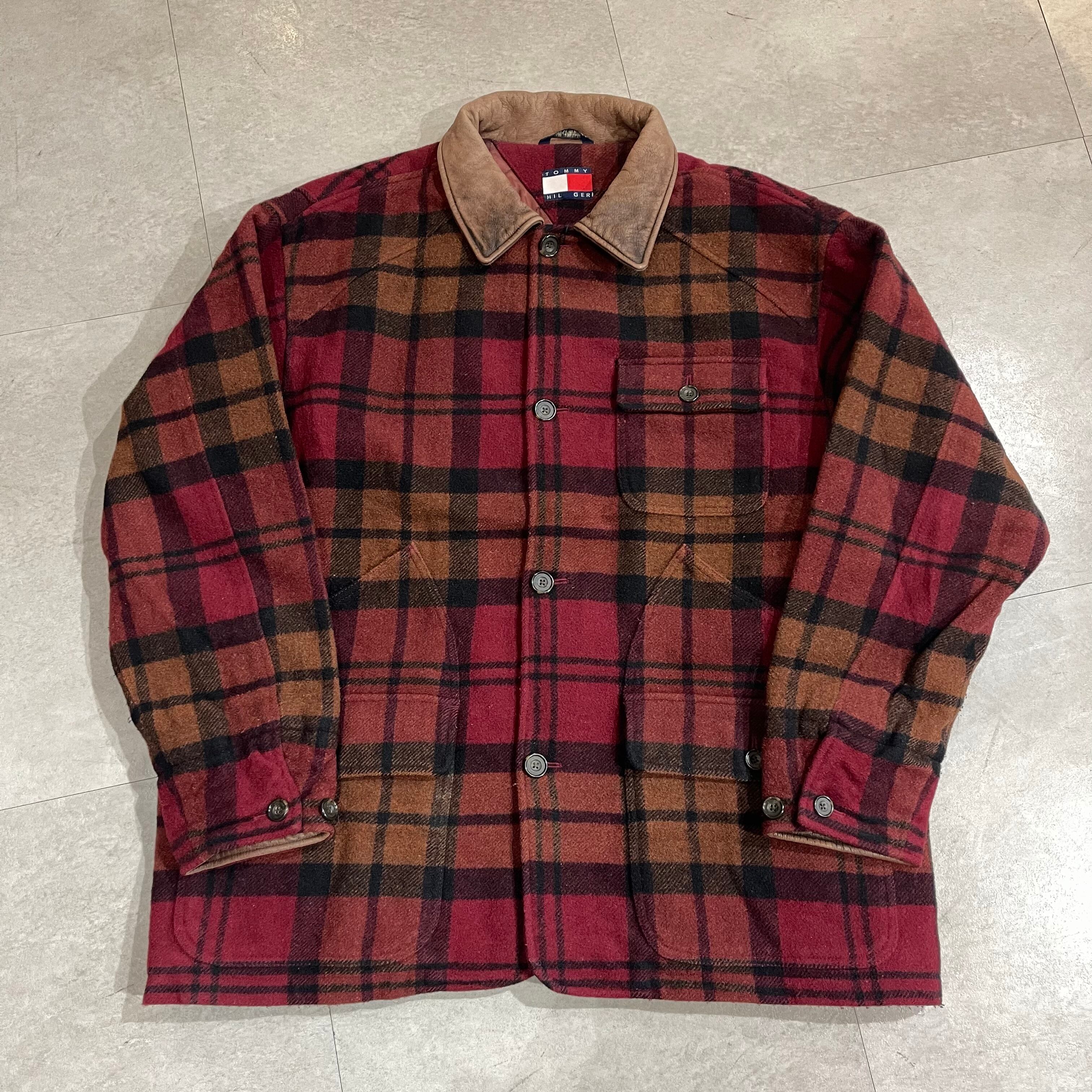 size:L【 TOMMY HILFIGER 】トミーヒルフィガー ウールハンティングジャケット ウールジャケット チェック柄 レッド 赤 古着 古着屋 高円寺 ビンテージ