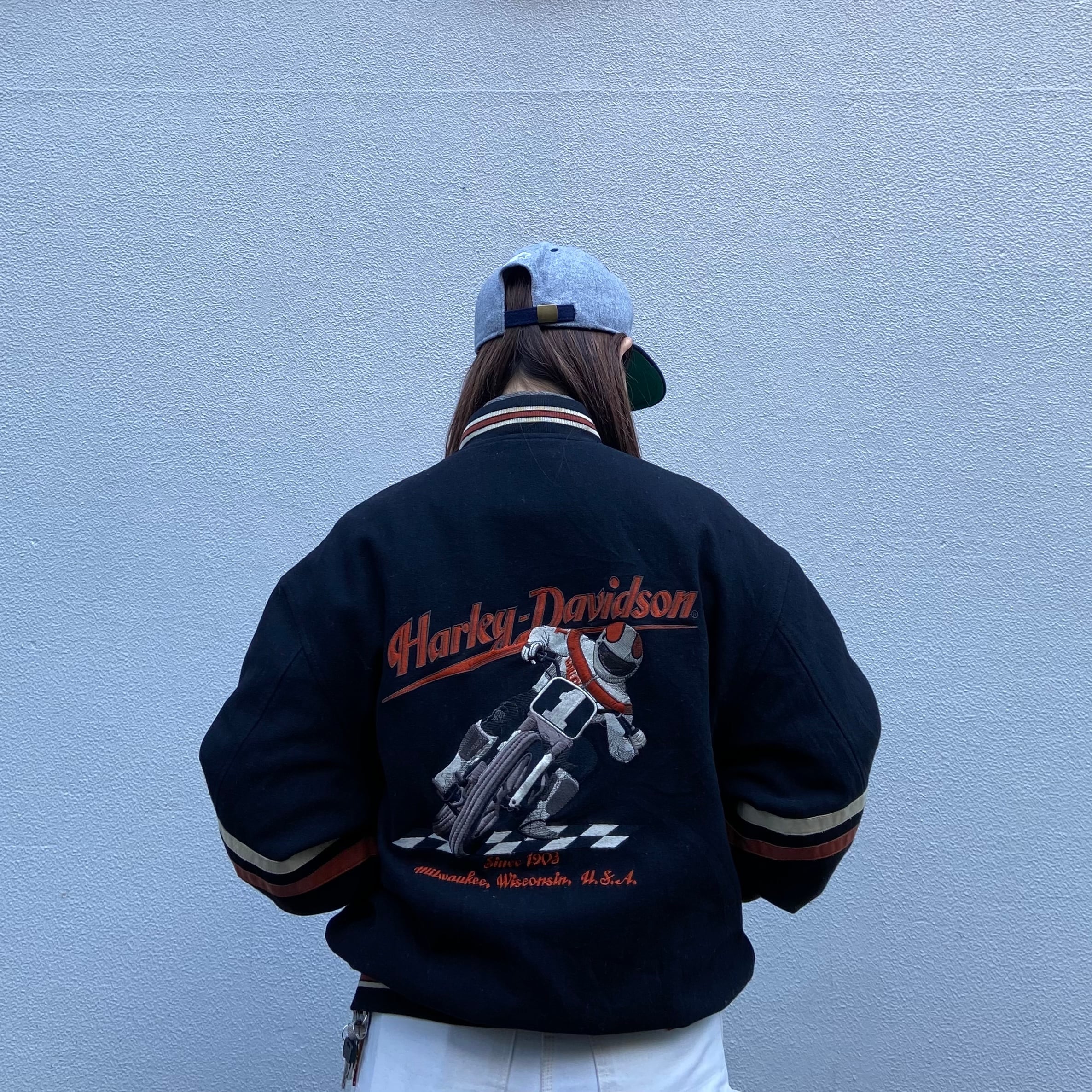 size : M【 Harley-Davidson 】ハーレーダヴィッドソン ハーレー ウールジャケット ウール スタジャン スタジアムジャンパー リブライン 黒 オレンジ 古着 古着屋 高円寺 ビンテージ