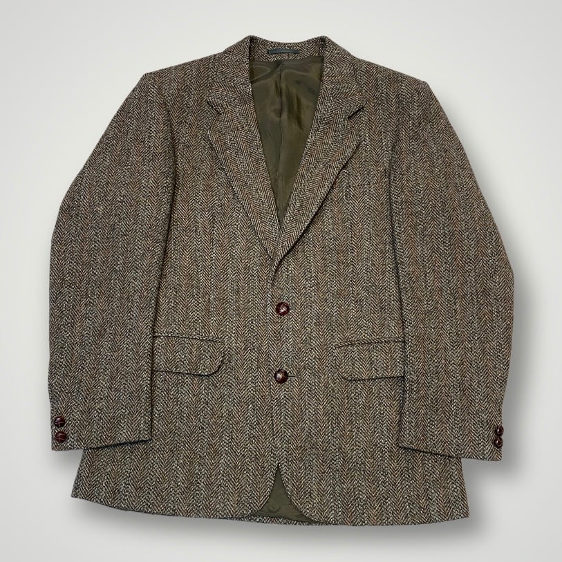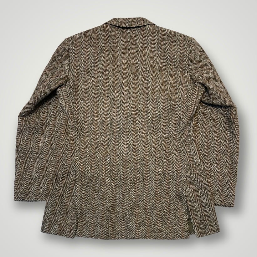 商品説明 :HarrisTweedのウールテーラードジャケット。幅広い層に人気かつ高クオリティを提供し続ける名ブランド。ブラウン系の合わせやすいカラーリングに綺麗めに落とし込める38Rサイズになります。