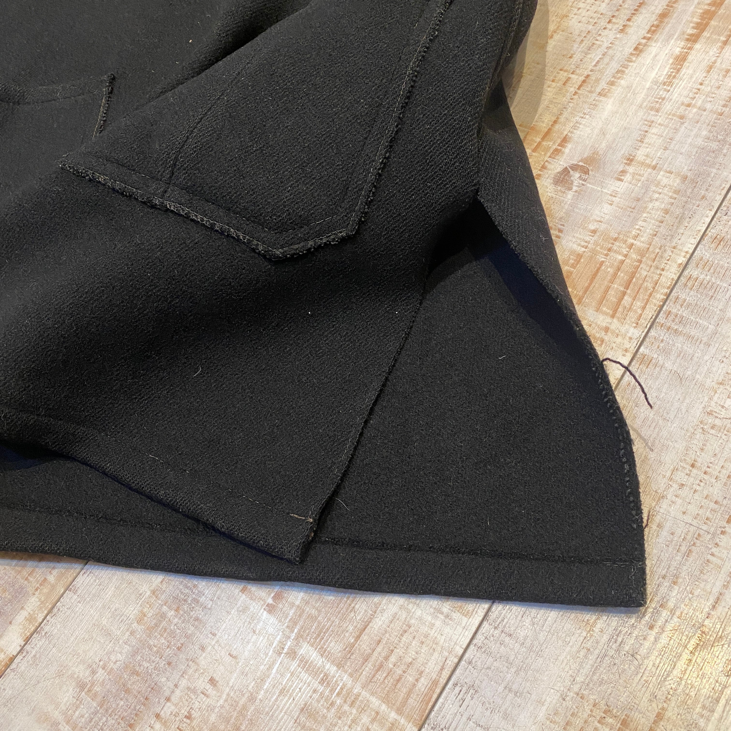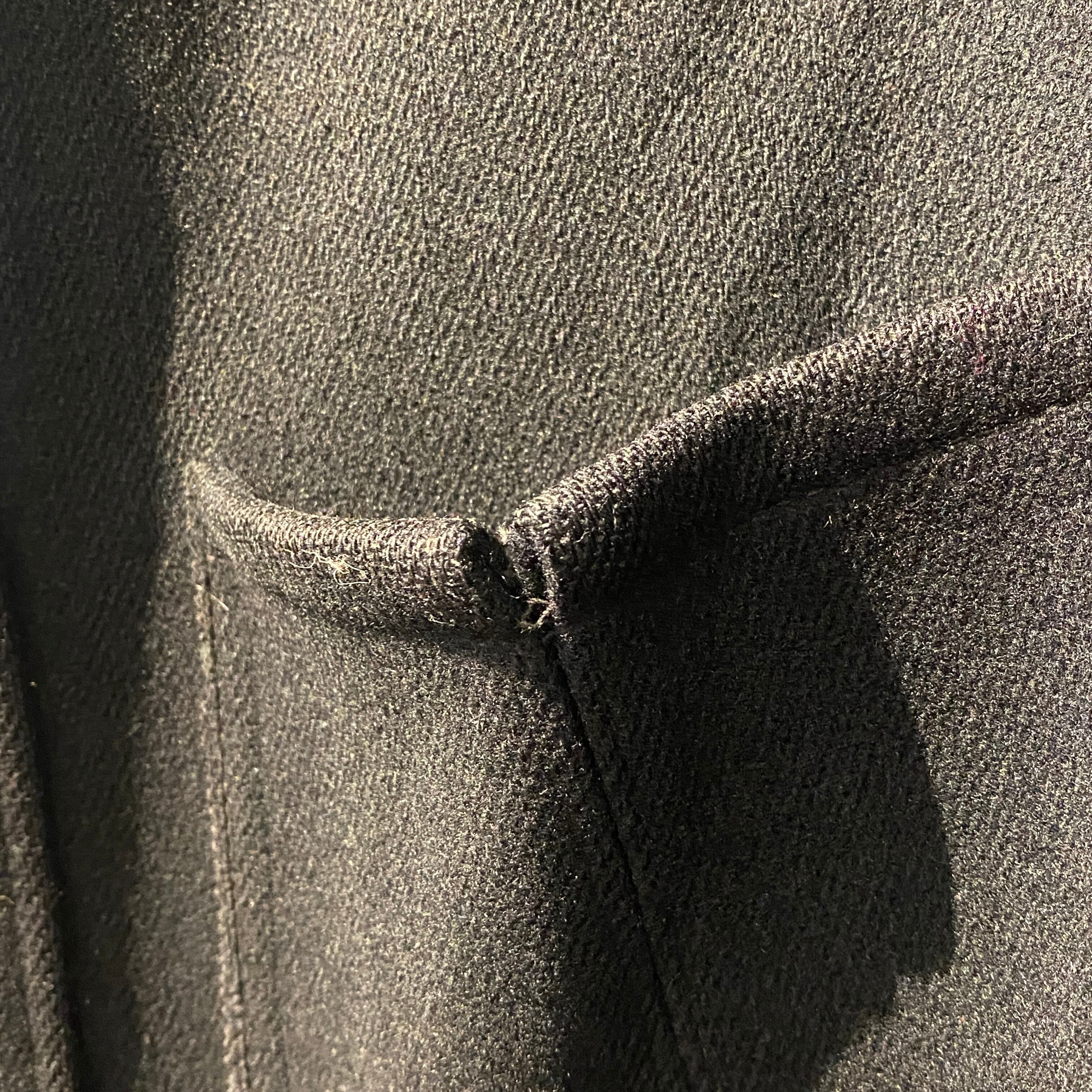 商品説明 :30年代頃のウールグラウンド(グランド)コートになります。非常に数の少ない希少価値の高いアイテムです。ジッパーはドットのベル型ジッパーで、両爪になります。グランドコートとは現在でいうベンチコートになります。30年代という年代ものにしてはかなりコンディションが良く、ダメージや汚れは無く、ジッパーも問題なく稼動する逸品。かぶりのディテールながら細かなディテールが洗練されています。年代らしいメルトンウールで防寒性も高い上にブラックという魅力的な存在となる個体です。左裾のスリットにより着脱のストレスも軽減され、又インナーをポイントとして魅せることもできる逸品。中々お目にかかることのできないビンテージアイテムです。この機会に是非。