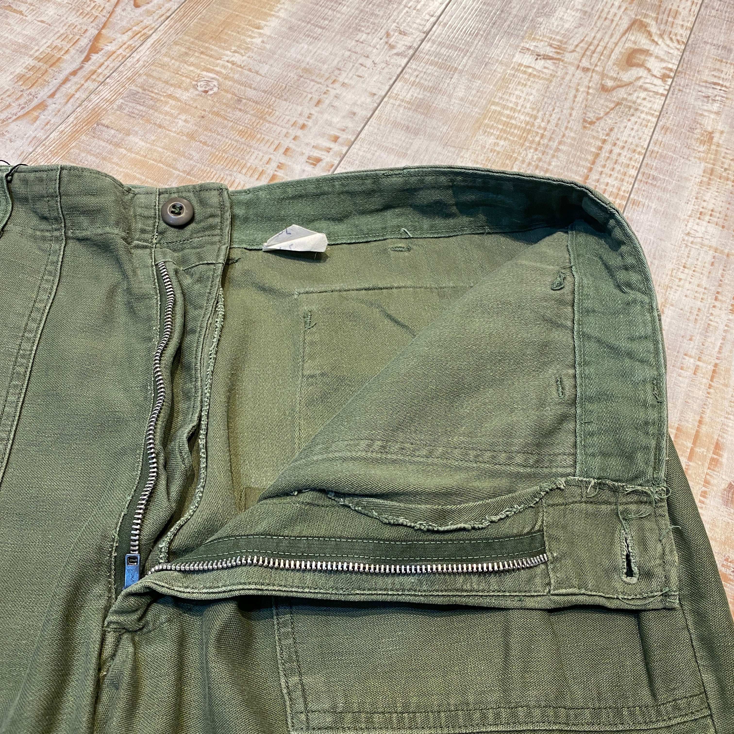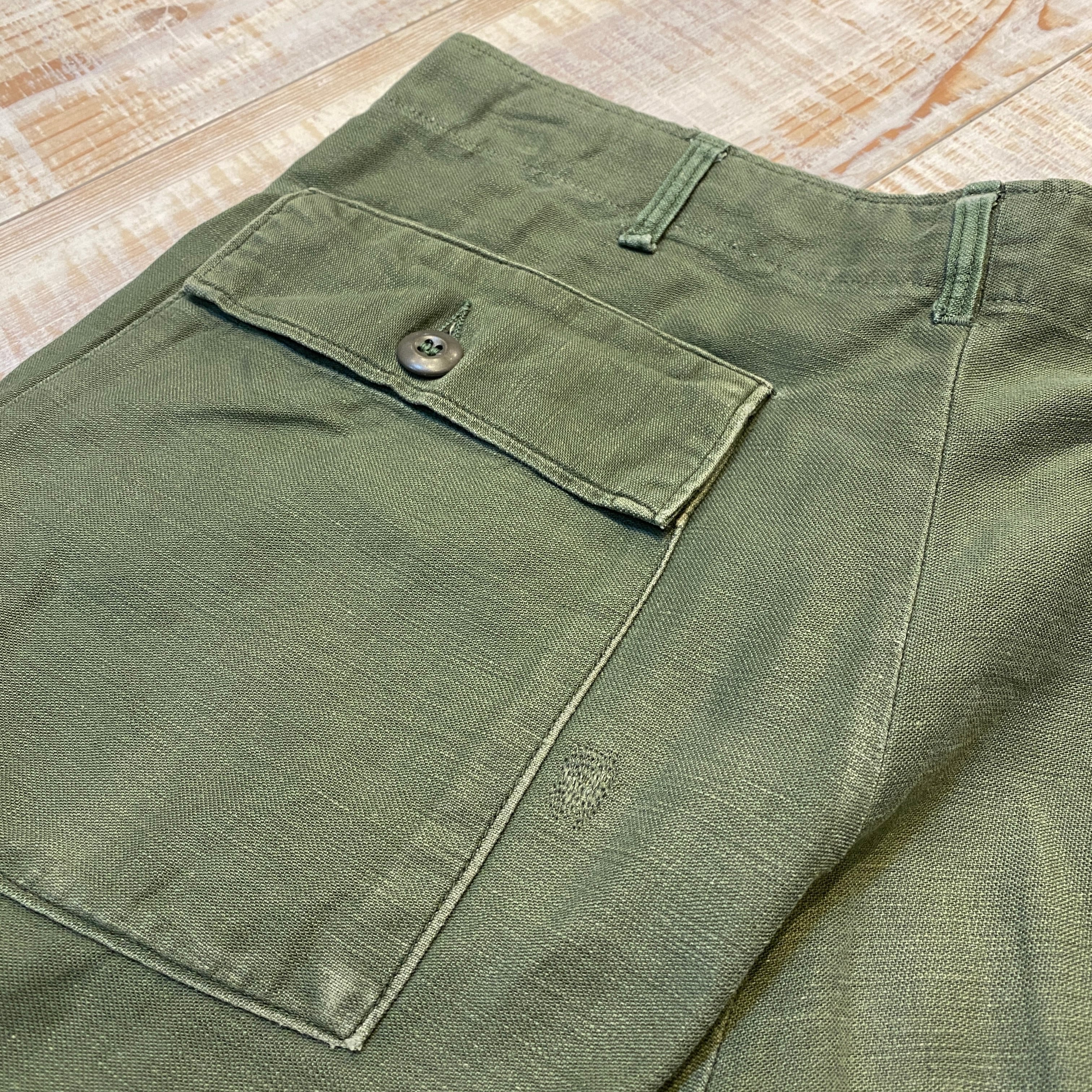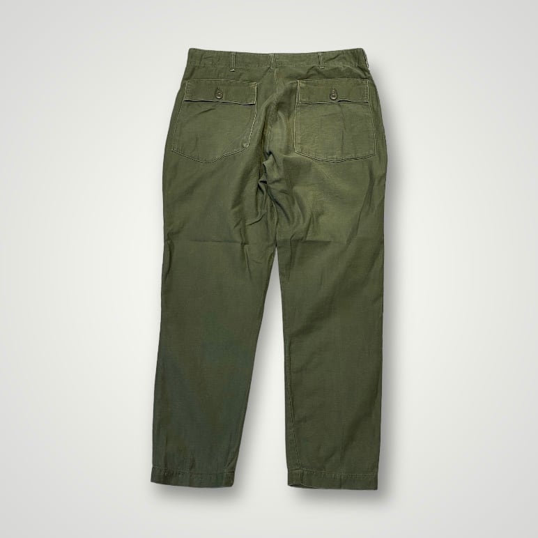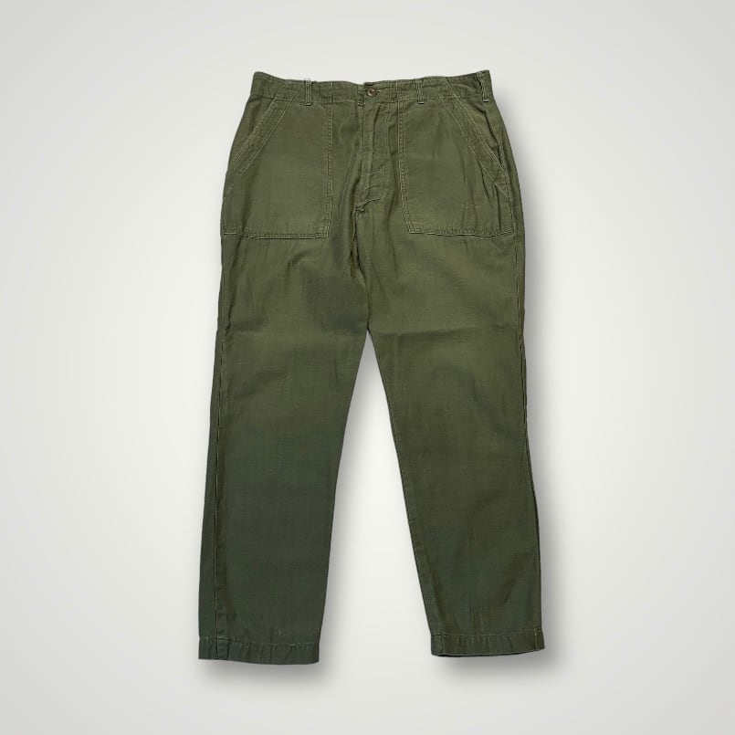 商品説明 :70年会計米軍のベイカーパンツになります。コットンサテン地にUFOボタン、ジッパーフライの個体になります。表記36×29、実寸34×27になります。