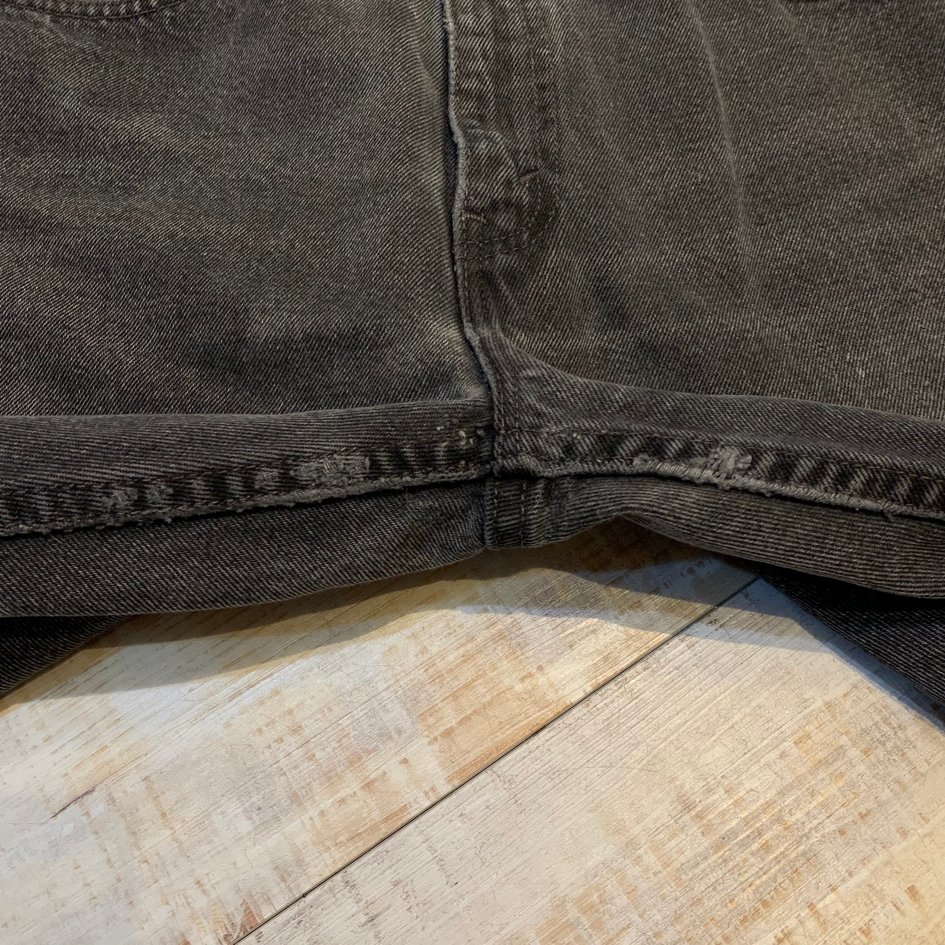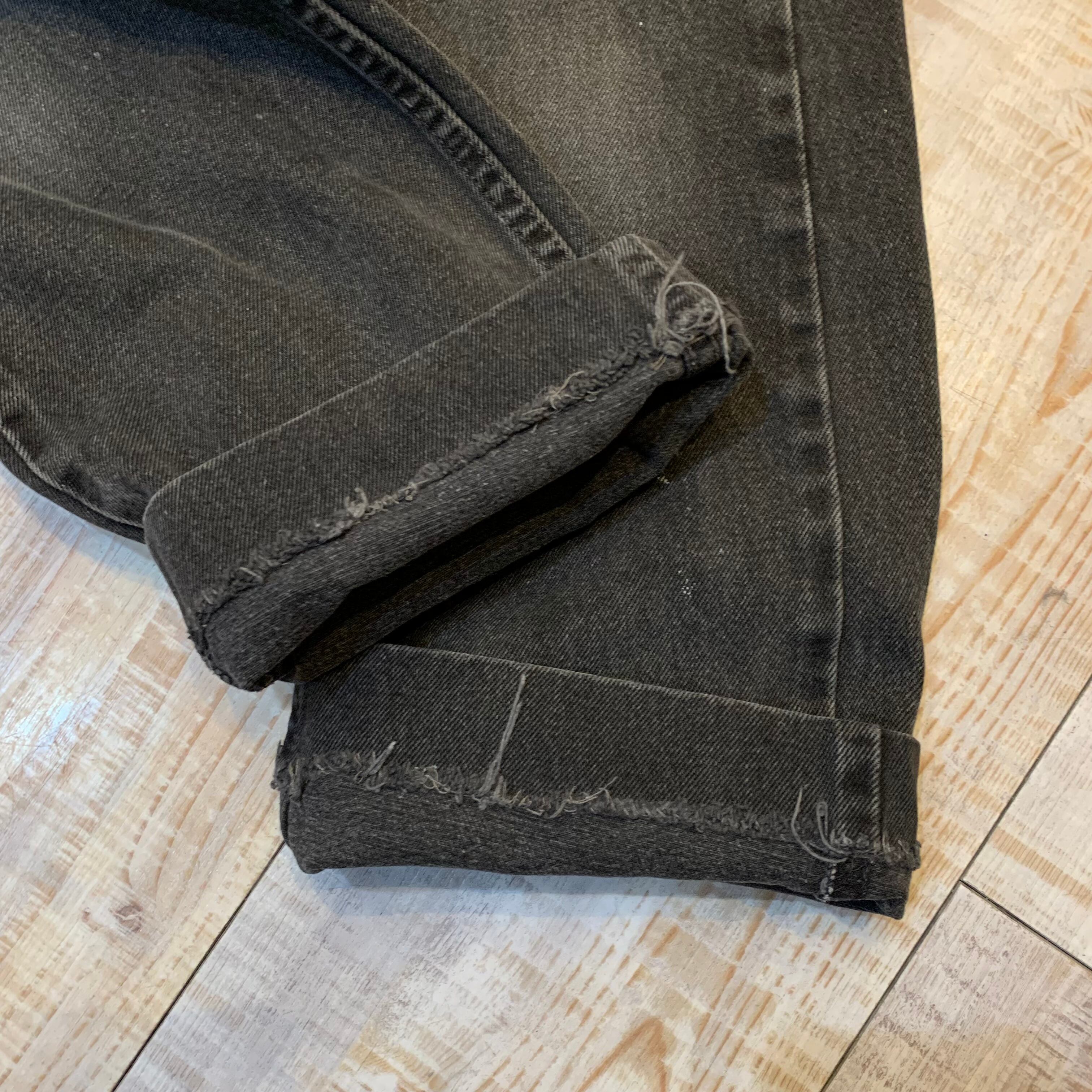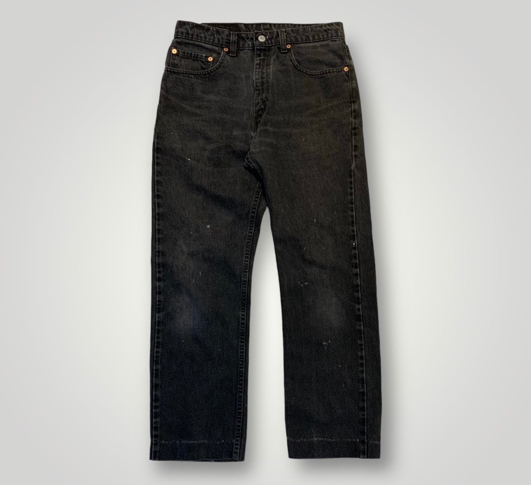 商品説明 :米国製90年代Levi's 505の後染めブラックデニムパンツになります。程良く色落ちし、グレーの綺麗な一本に仕上がっております。表記はW32 L32ですが、実寸は縮みや裾上げによりW31 L28、レングスの着用感はL29程度になります。