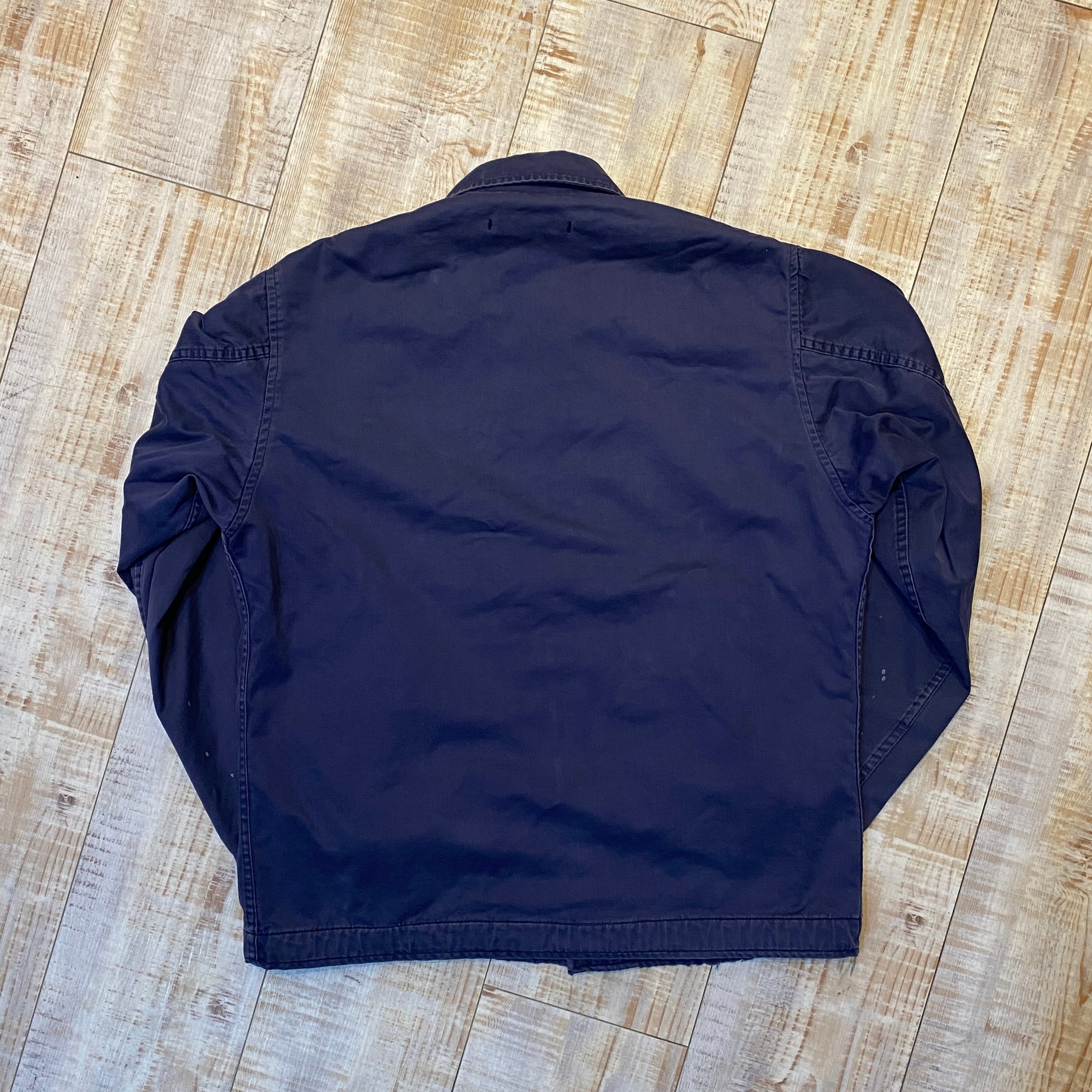 商品説明 : 68年度会計、U.S.NAVYのユーティリティジャケットになります。シンプルながらU.S.NAVYのN-1デッキジャケットやA-2デッキジャケットにも似た雰囲気のジャケットで、通称"ナス紺"と呼ばれるカラーが最大の特徴のジャケット。タグが欠損し、袖口がパンクしているものが殆どですが、こちらは襟,ポケットのリペア以外ダメージの少ない一品。