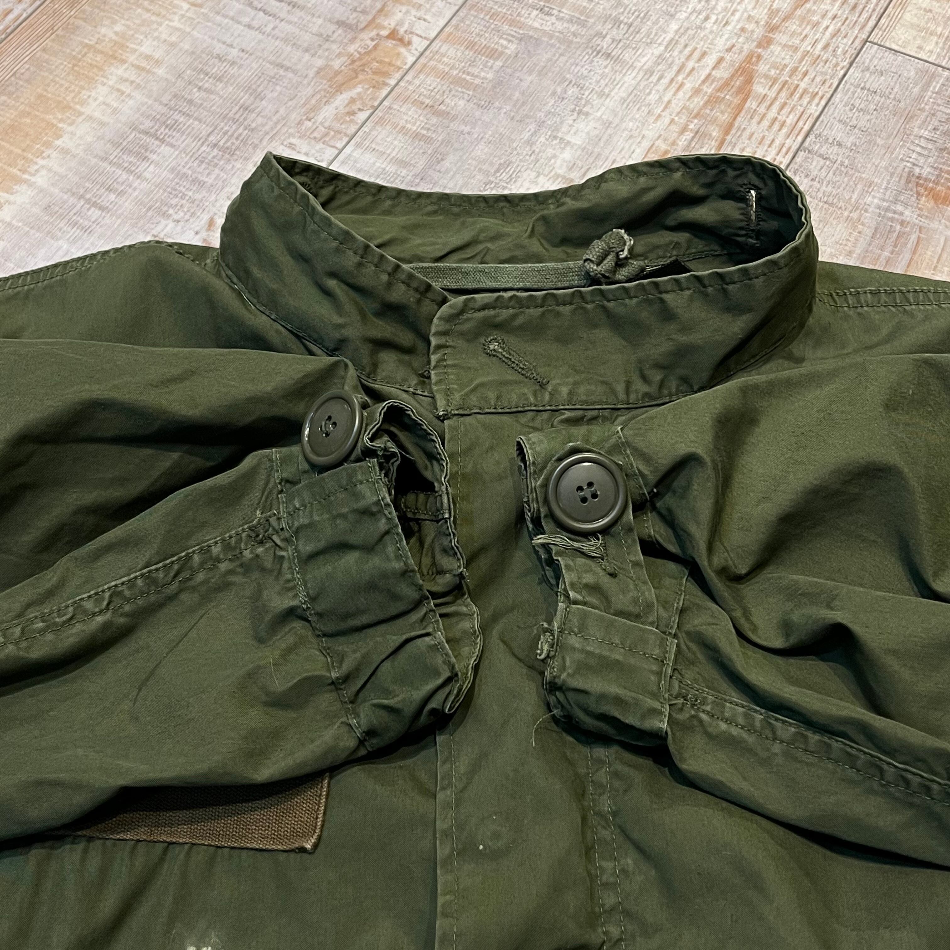 商品説明 :M-65フィッシュテールパーカーのシェルになります。82年会計の真鍮ジップ。ミシンでのたたきリペアやジップの破損もなく、色も濃く残る、現存する個体の中では非常に状態の良い1着です。