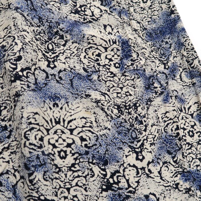 ■説明:使用感、フロント左腿付近に軽いシミ汚れが複数、裾付近に同様のシミが複数見られますが、柄、生地感的に着用の際に目立つ物では無いかと思います。デザインも良く、古着らしい一枚です。