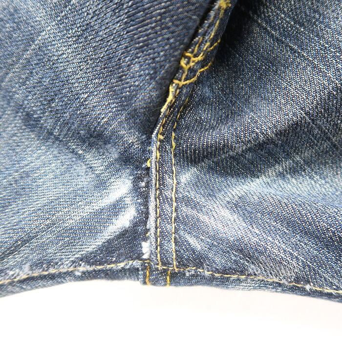 ■説明:全体的に使用感があるほか、股にダメージ、ヒップにタタキリペア、両裾にロールアップ跡、バック右裾口付近にダメージ穴がありますが、古着慣れした方なら気にならない程度かと思います。