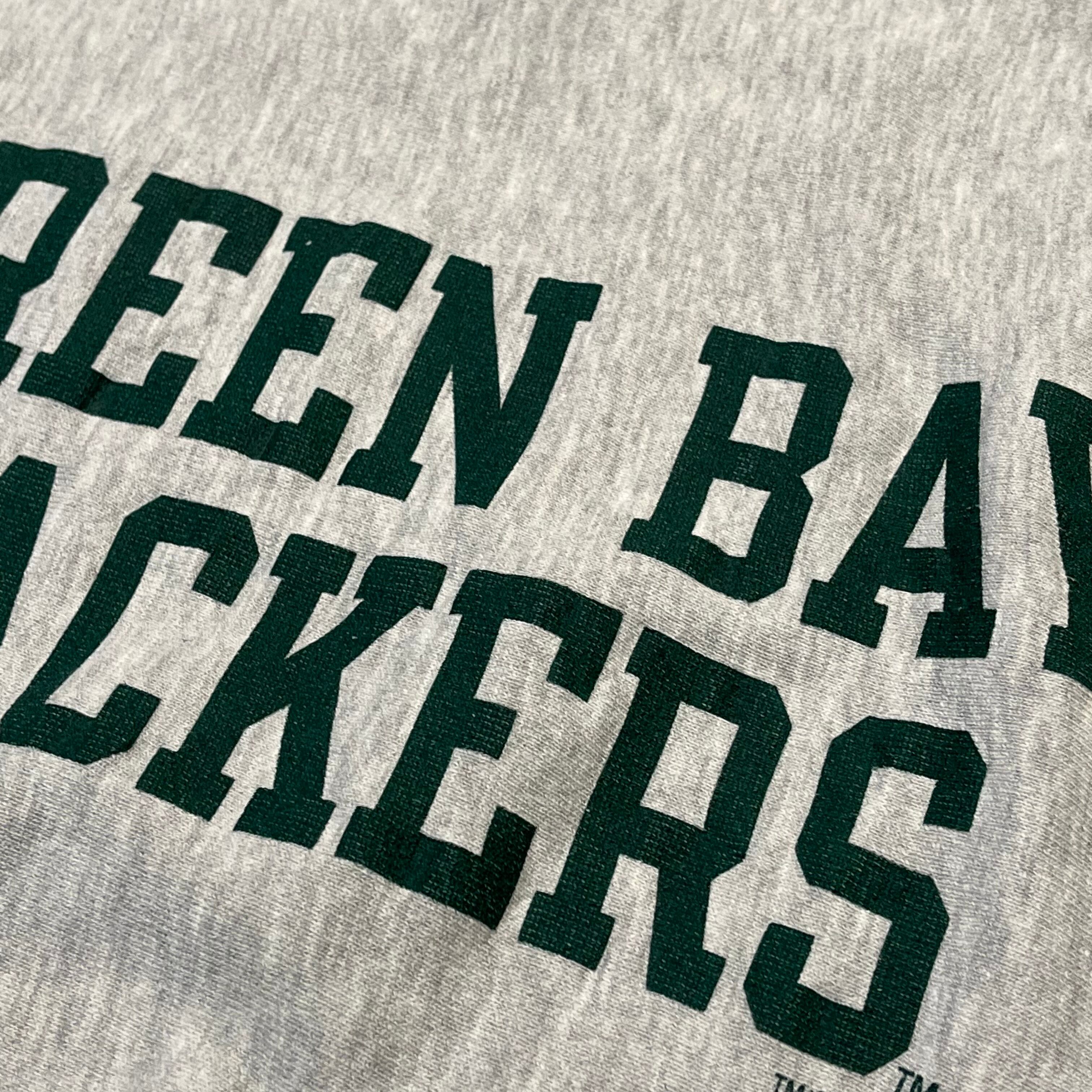 商品説明 : 刺繍タグのつく90年代のチャンピオンリバースウィーブ。グレーボディにNFLチームであるパッカーズのグリーンラバープリントが入る一枚です。1994年のコピーライトがつきます。