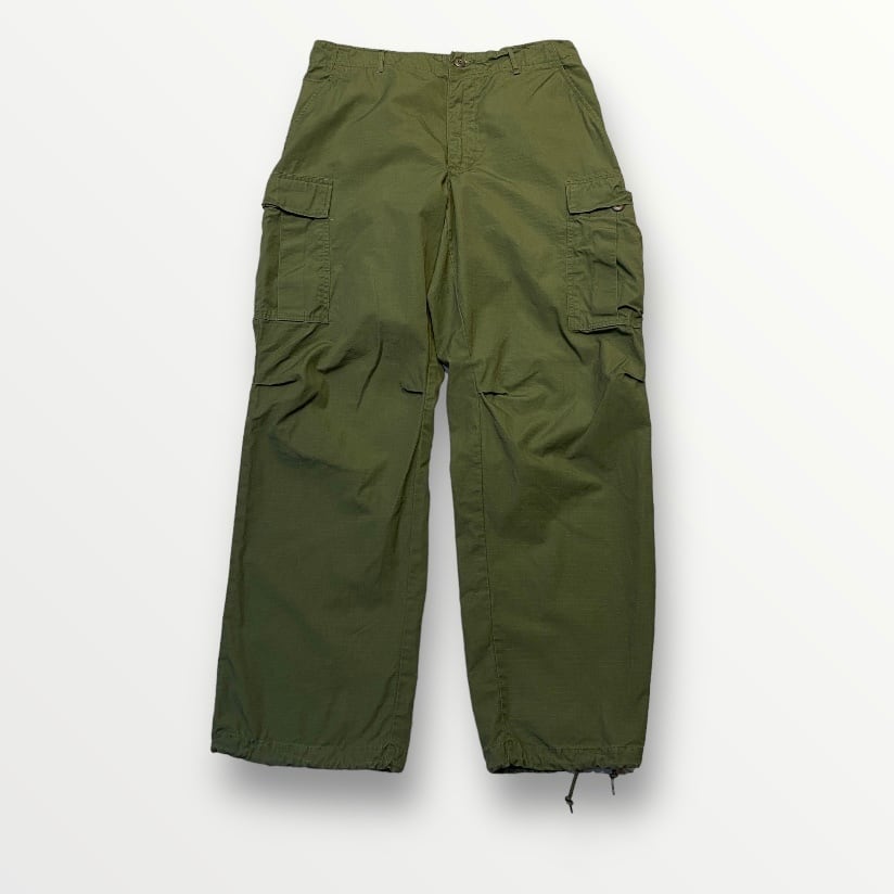 商品説明 :68年会計米軍ジャングルファティーグパンツになります。サイズはM-Lで、コンディションも使用感の少ない極美品になります。股上やわたりはゆとりのあるディテールですが、裾に向かって若干テーパードの効いた個体で、太さやミリタリーらしい無骨さもありつつ、シャツスタイルやテーラードスタイル等綺麗めにも落とし込める逸品です。表記にある通り、ウエストはアジャスターにてW31~W35まで調整可能です。