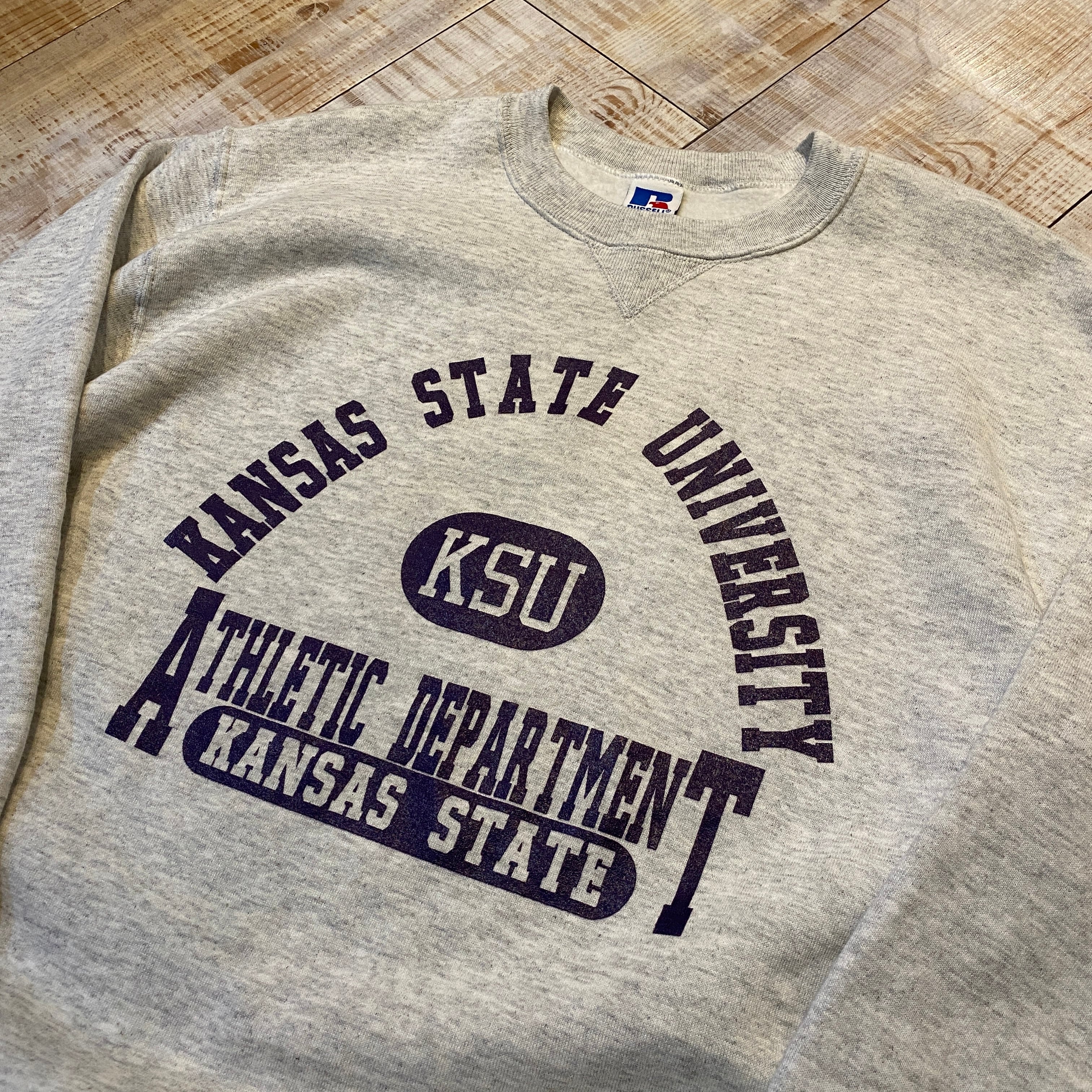 商品説明 :米国製90s RUSSELLのプリントスウェットになります。定番の霜降りグレーボディに、パープルの4段アーチカプセルのラバープリントが入るグッドアイテム。フラッシャー付きのデッドストックでのご用意になります。