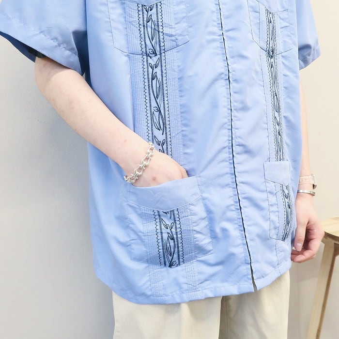 古着 キューバシャツ 半袖 フルジップ サックスブルー サイズ表記:XL gd81828