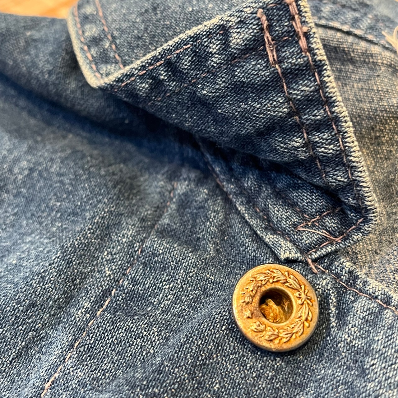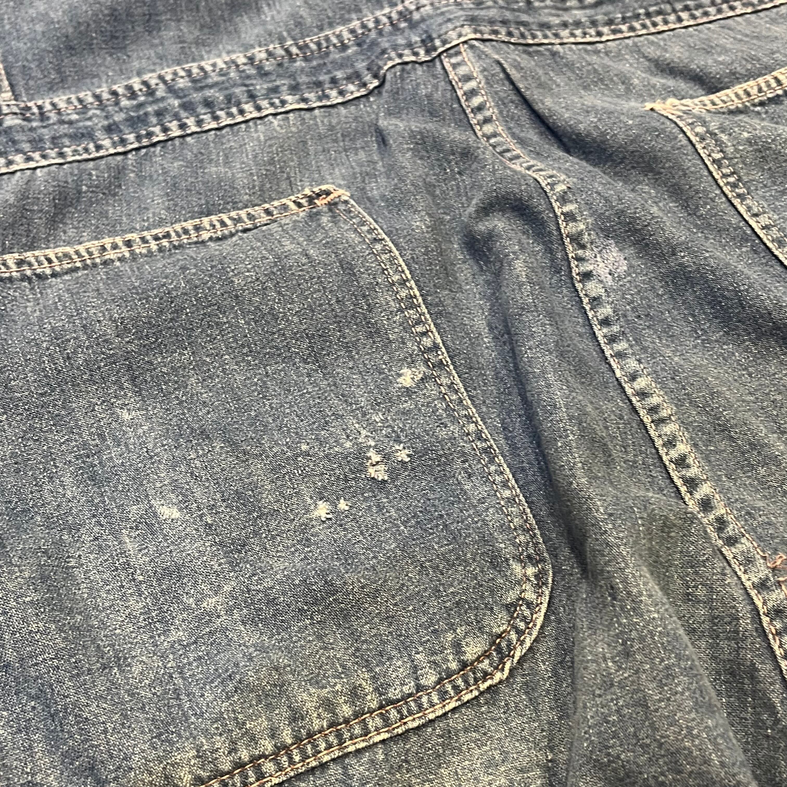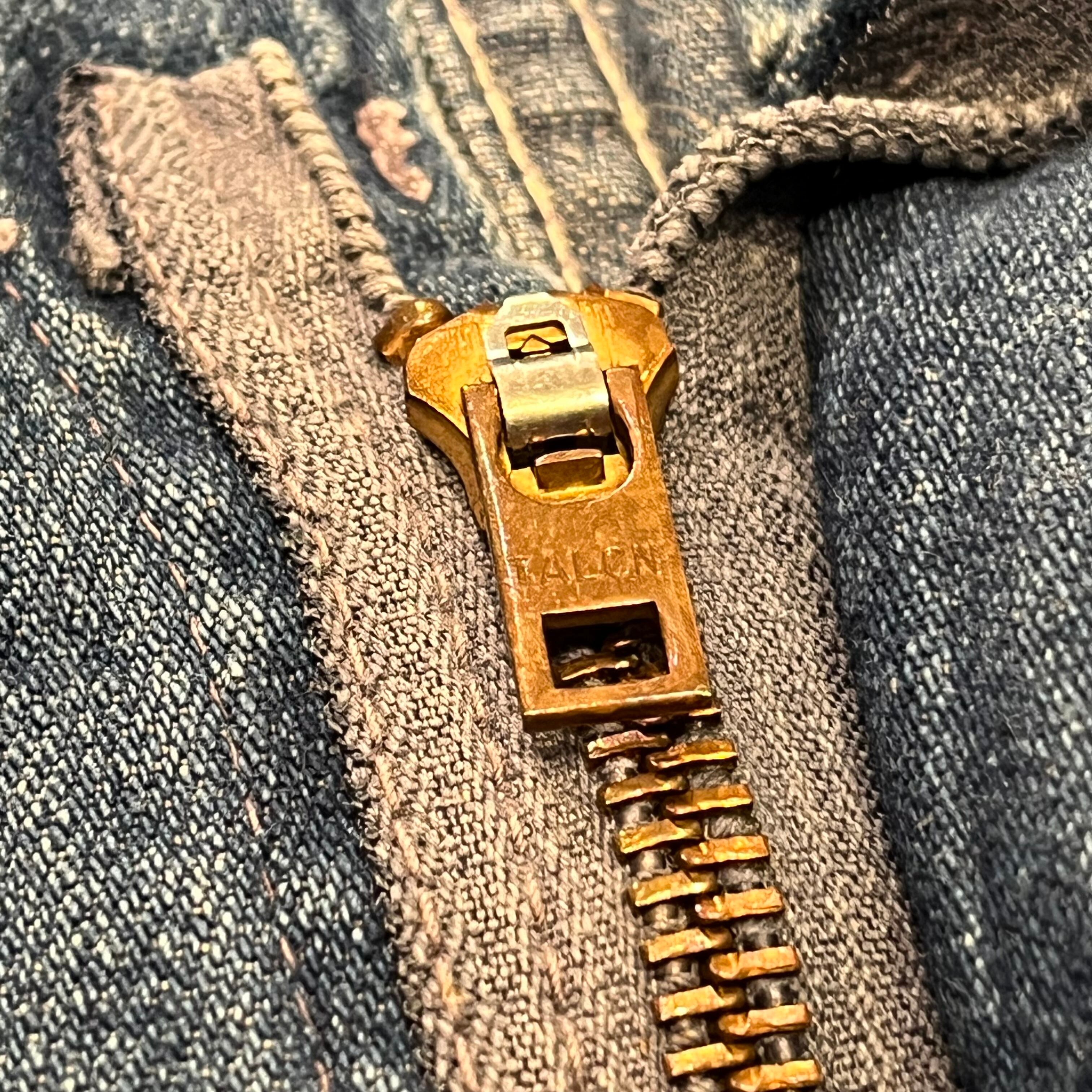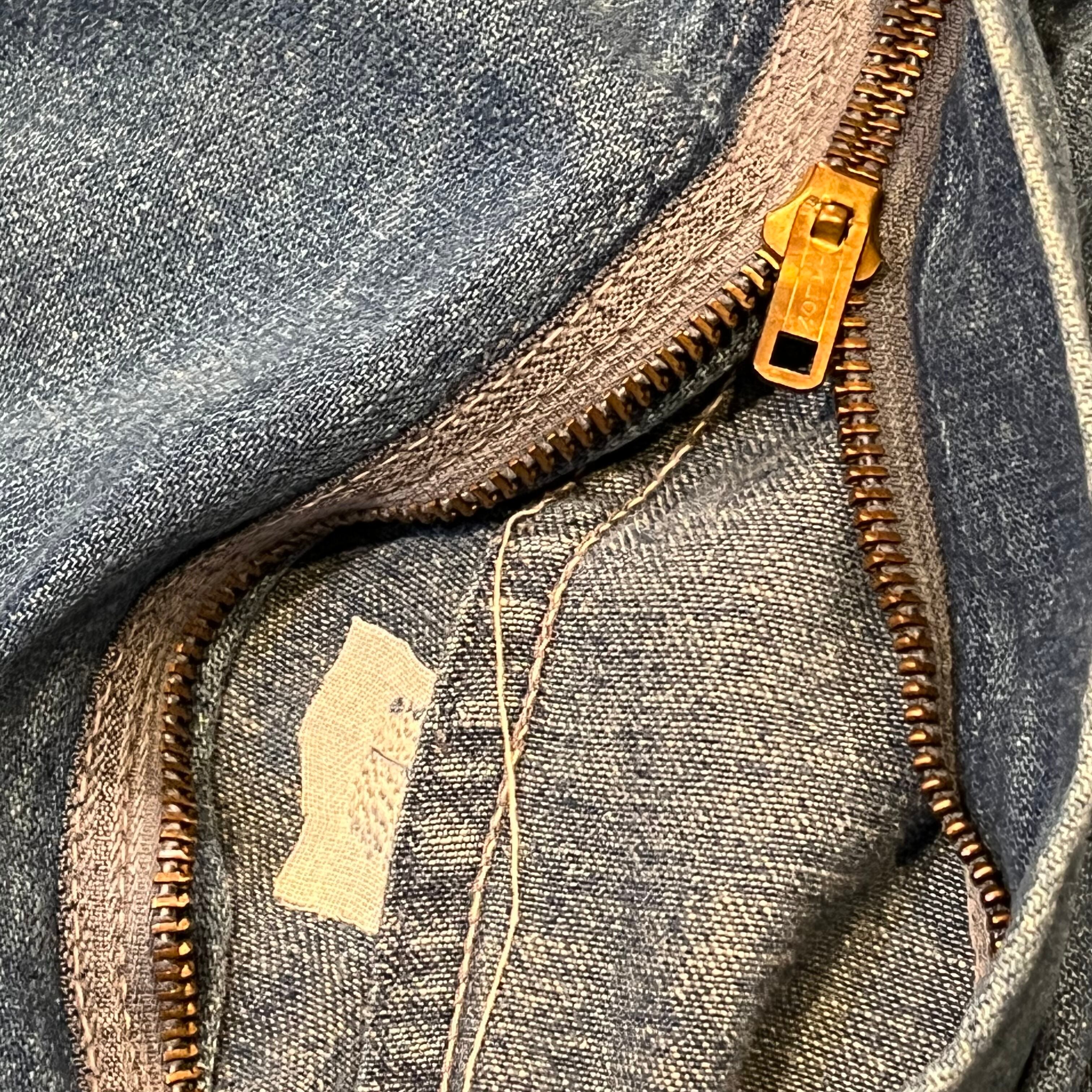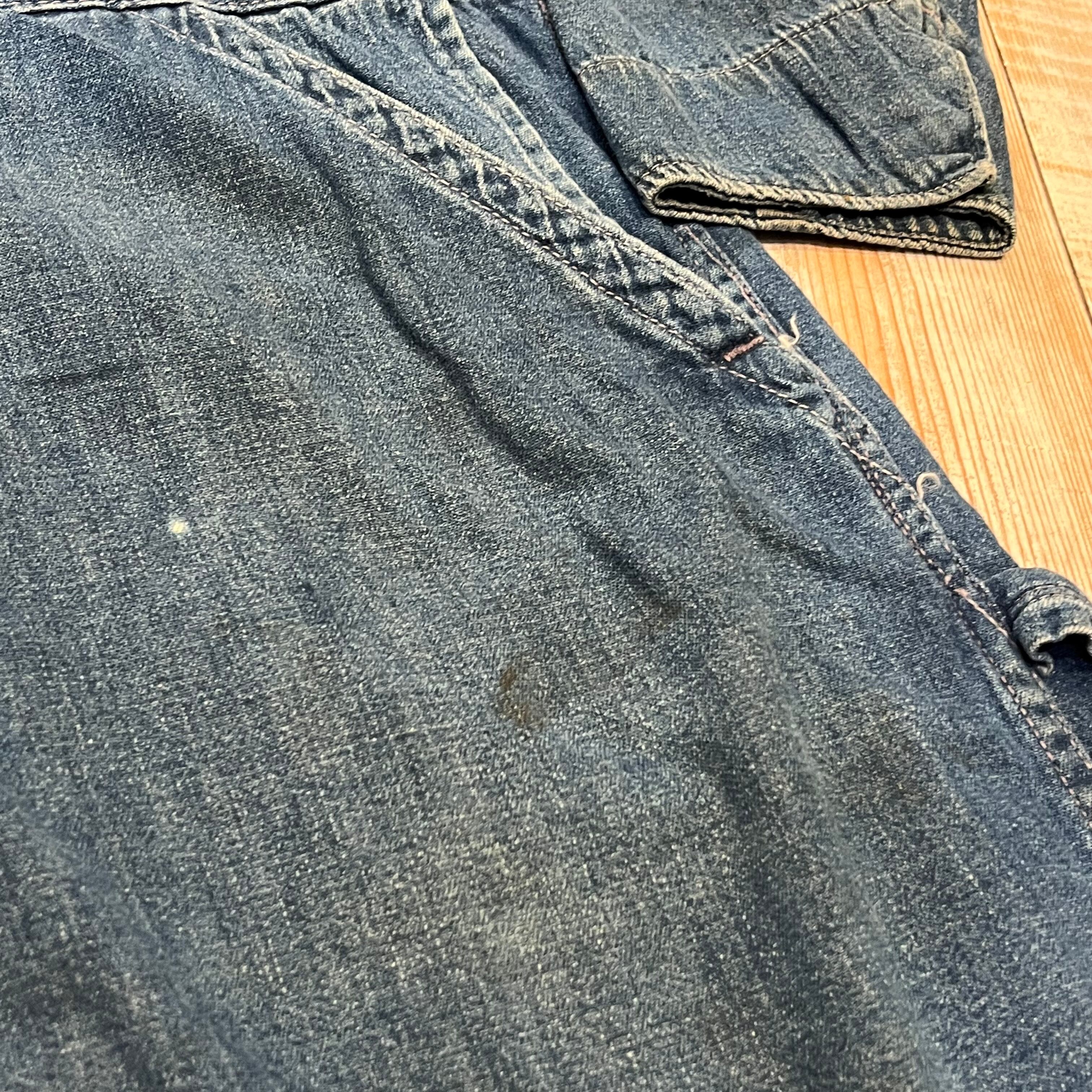 商品説明 :50年代頃のデニムオールインワンになります。年代らしい身体に馴染むような柔らかいデニム生地。トップには月桂樹ボタンがつき、ジップはセミオートマチック、インシームとアウトシーム含め、全体をダブルステッチで裁縫されたヴィンテージデニムらしい1着です。