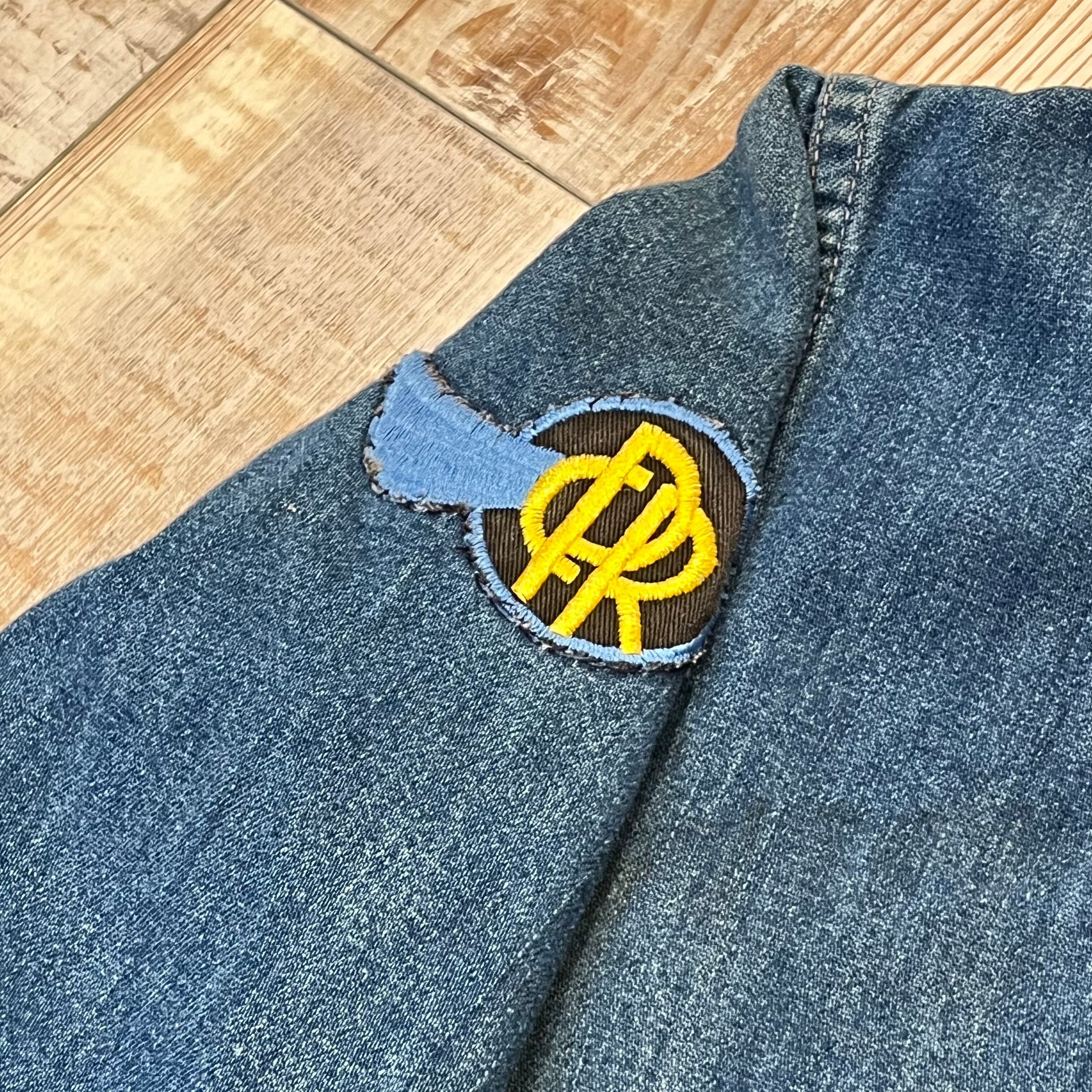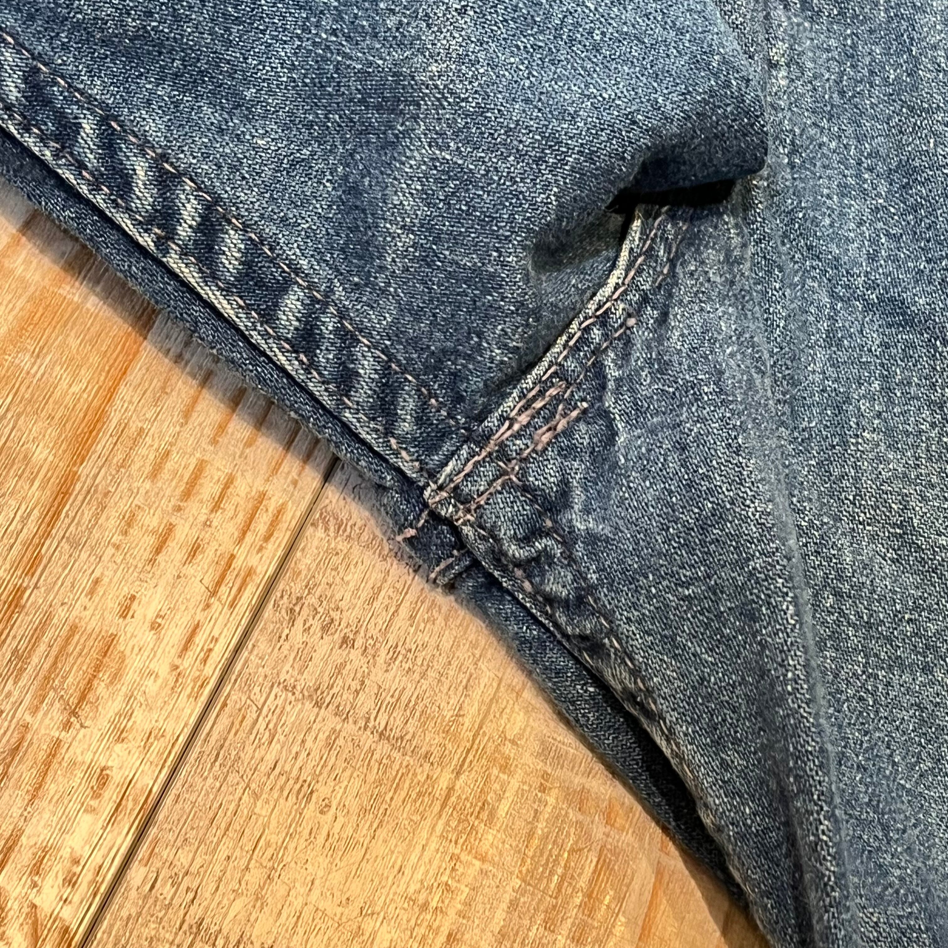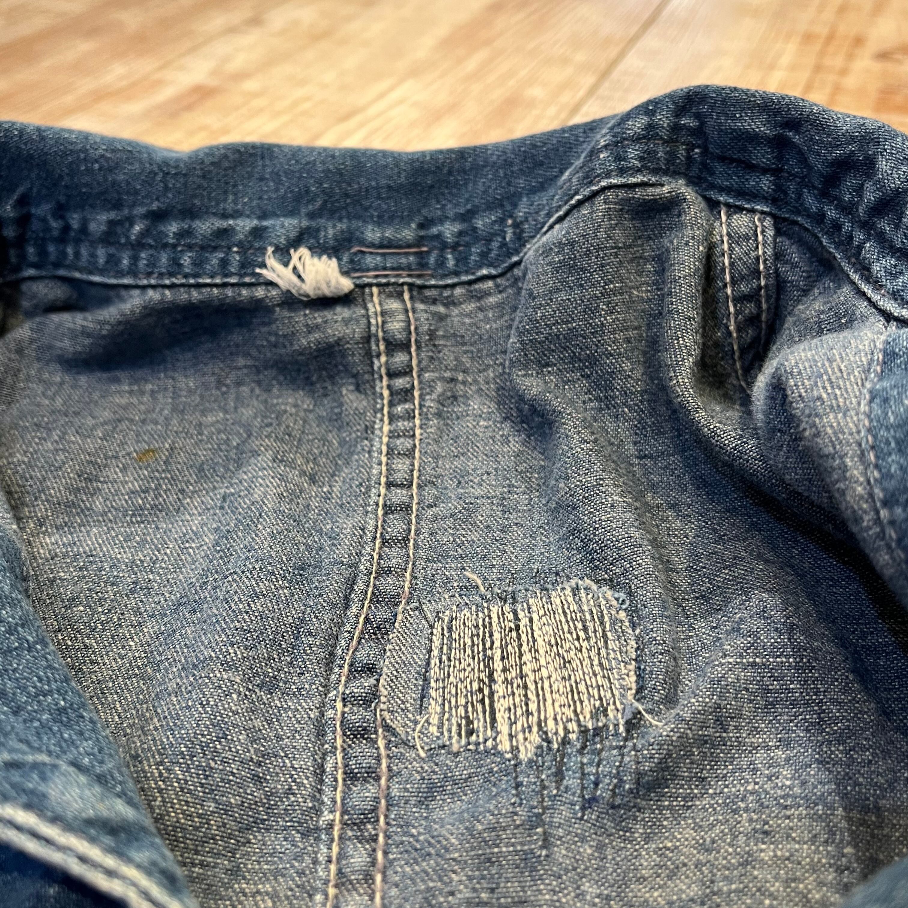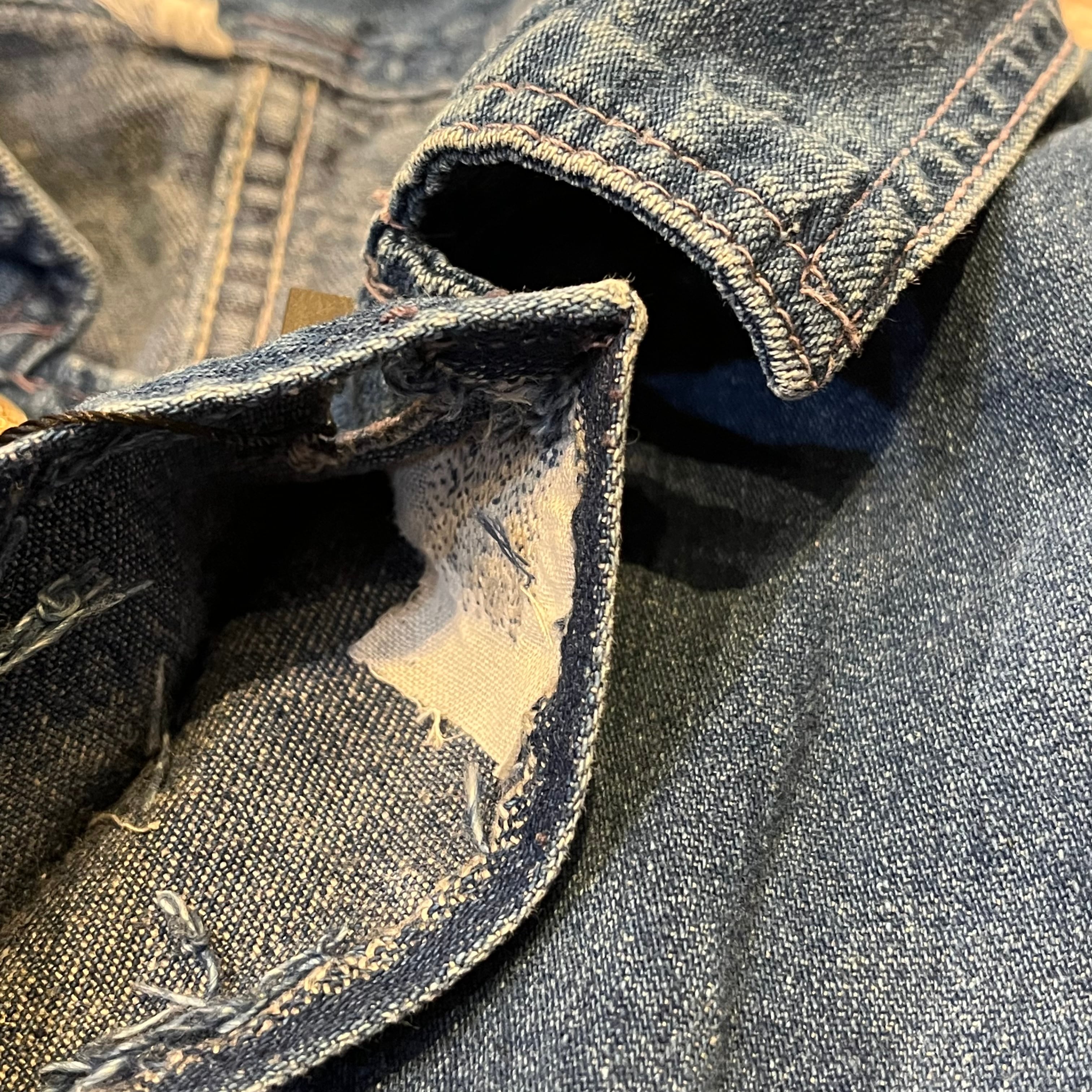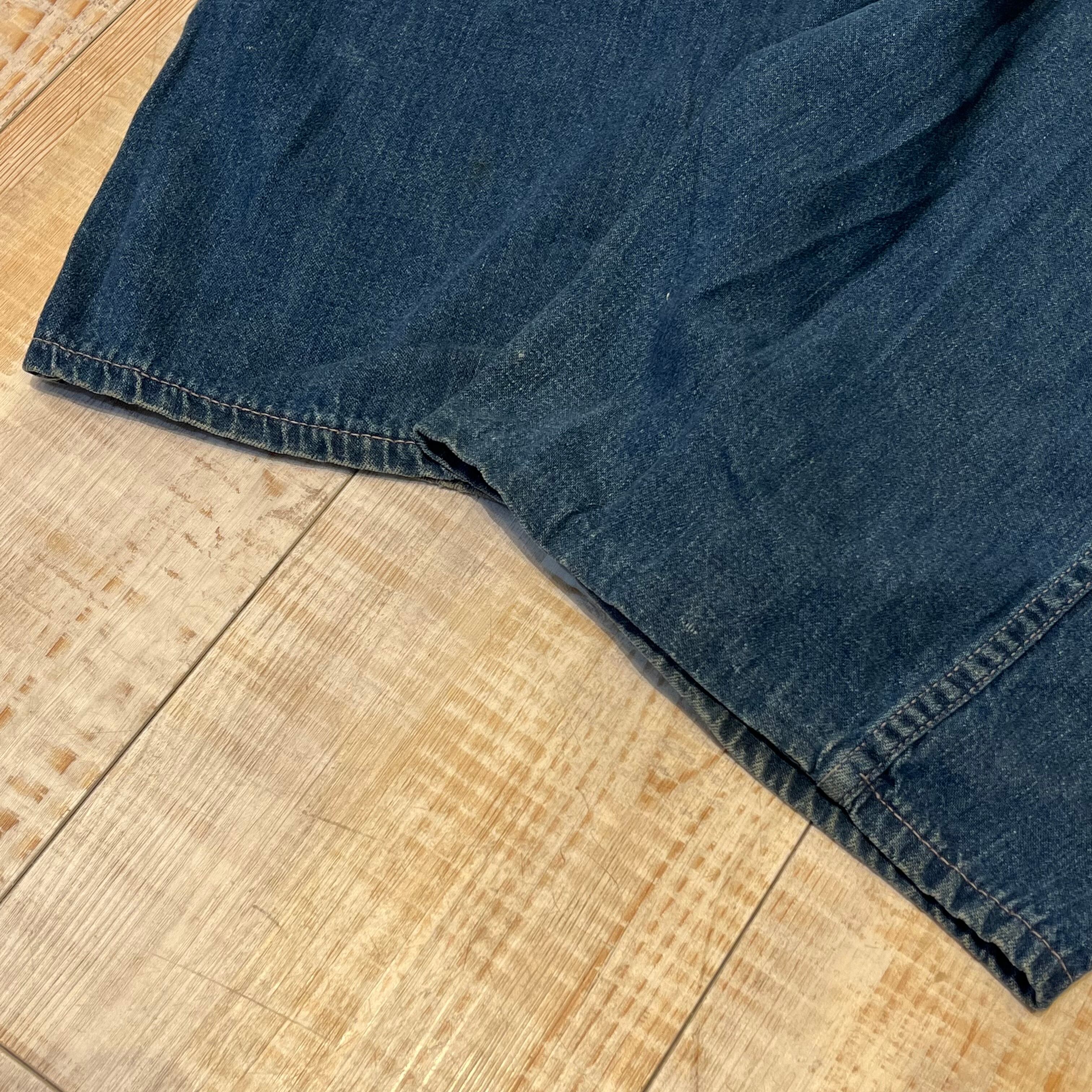 商品説明 :50年代頃のデニムオールインワンになります。年代らしい身体に馴染むような柔らかいデニム生地。トップには月桂樹ボタンがつき、ジップはセミオートマチック、インシームとアウトシーム含め、全体をダブルステッチで裁縫されたヴィンテージデニムらしい1着です。