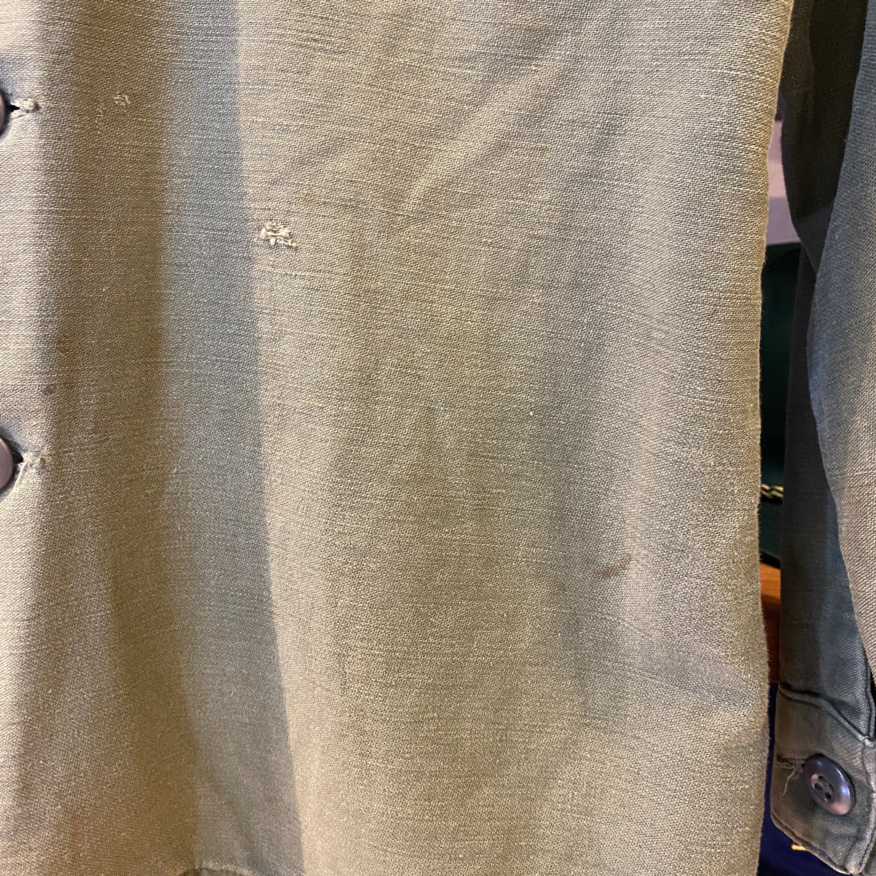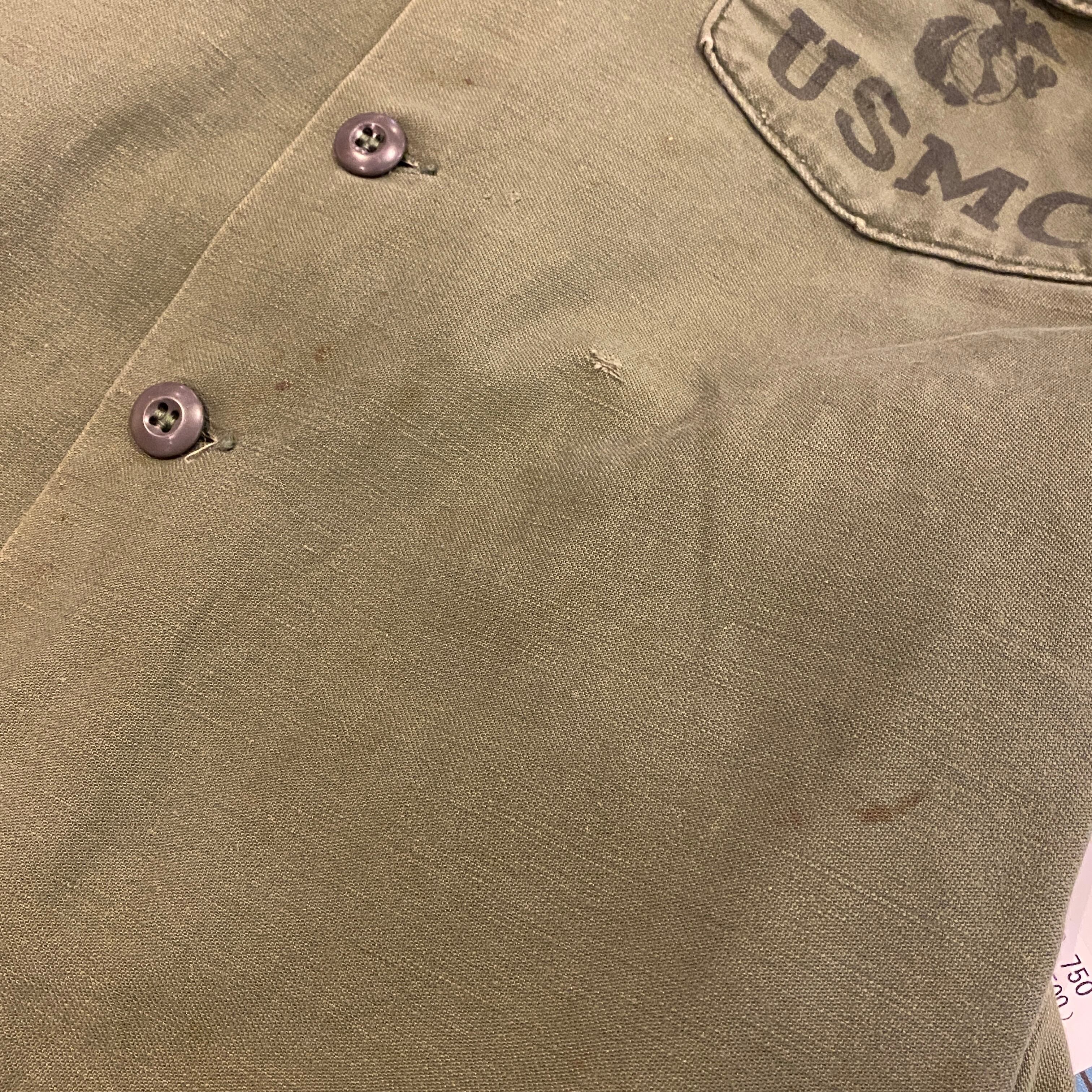 商品説明 : ~60年代OG-107ユーティリティシャツに3rdモデルになります。胸ポケットにはU.S.M.Cのステンシルが色濃く残っており、フロントバック共に豪華なパッチが入る希少な1着。