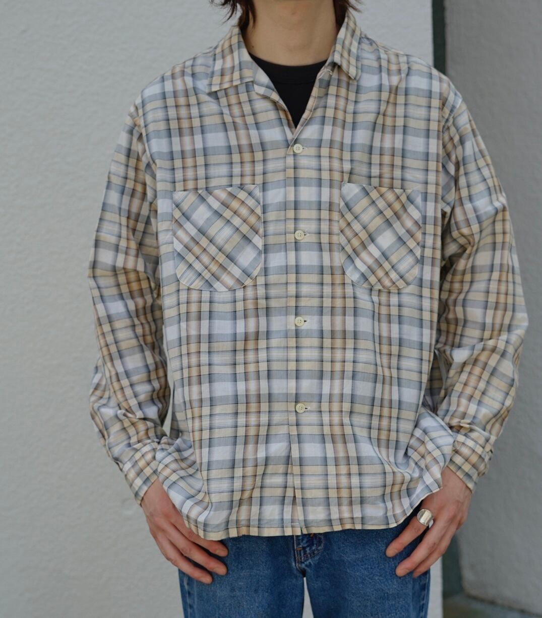 商品説明 :60年代L/Sコットン開襟ボックスシャツになります。薄手のコットン地に、グレー、白、イエロー系のカラーリングを基調とした爽やかな印象の一枚。サイズはLサイズと幅広い方に着用して頂ける逸品で、ダメージや汚れの少ない一枚です。