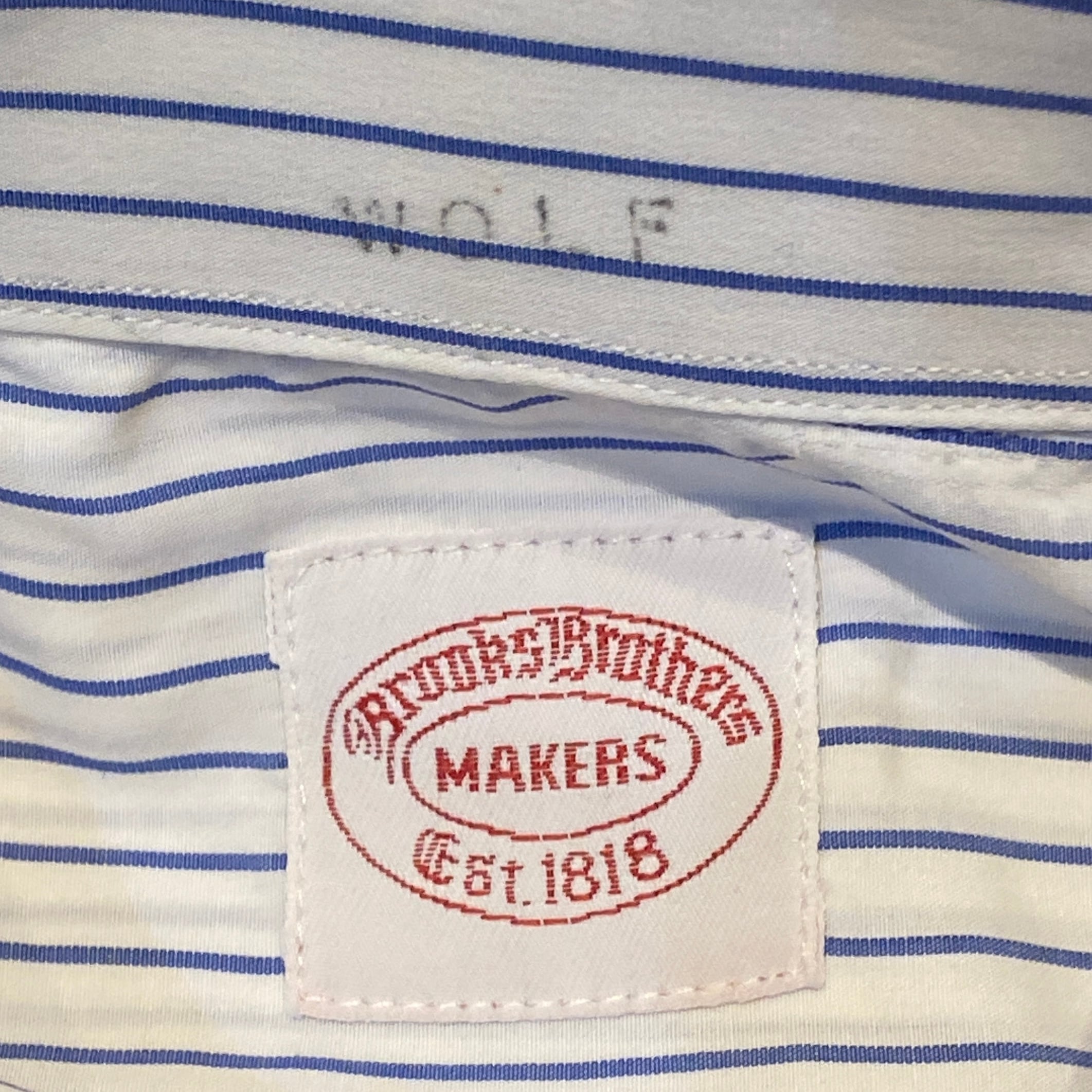 商品説明: 米国にてオーダーされた70年代~Brooks Brothersのタブカラーシャツになります。生地は薄手のブロードで、非常に軽い着心地が特徴になります。胸元には『JW』とイニシャル刺繍で入り、襟元にもWolfの文字。タグにサイズ表記が無い事とmakersと入ることから米国にてパーソナルオーダーされたものと推測できます。汚れやダメージの少ない一着です。