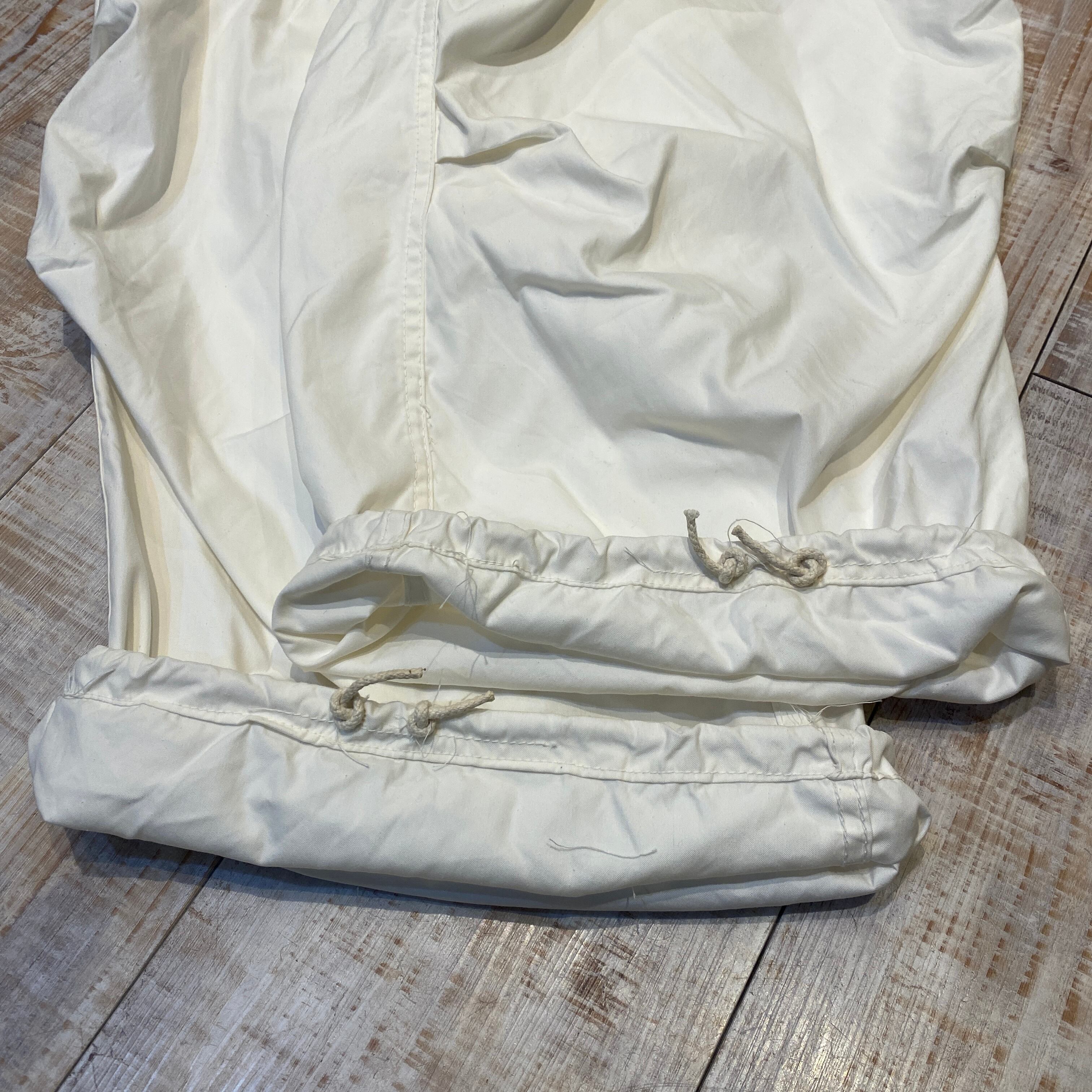商品説明 :U.S.ARMY スノーカモオーバーパンツになります。降雪地帯での戦闘服として使用されていたアイテムで、オールホワイトカラーの一本。オーバーパンツの為ウエストと裾は紐(ドローコード)にて調整できます。オールホワイトでシンプルな個体ながら存在感のある太さ、無骨さがありながらも上品さも兼ね備え、裾ドローコードがある為様々な表情とディテールを楽しめる逸品です。コットンナイロンのシャリっとした素材で着用時も軽い履き心地です。