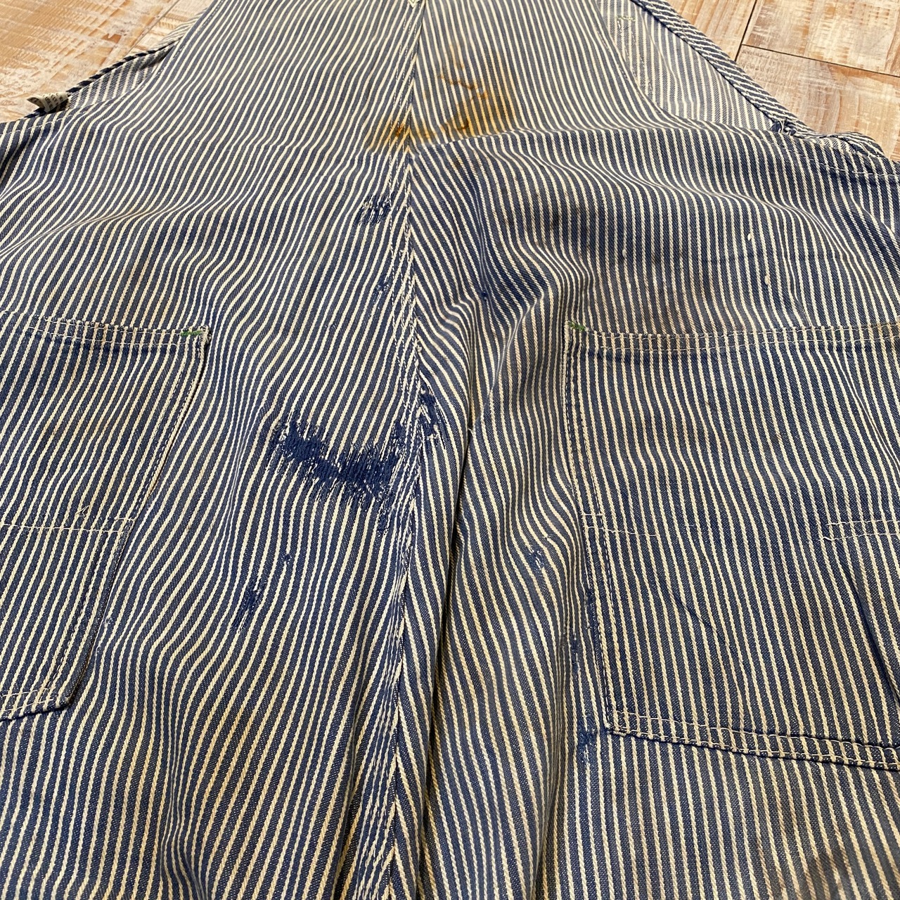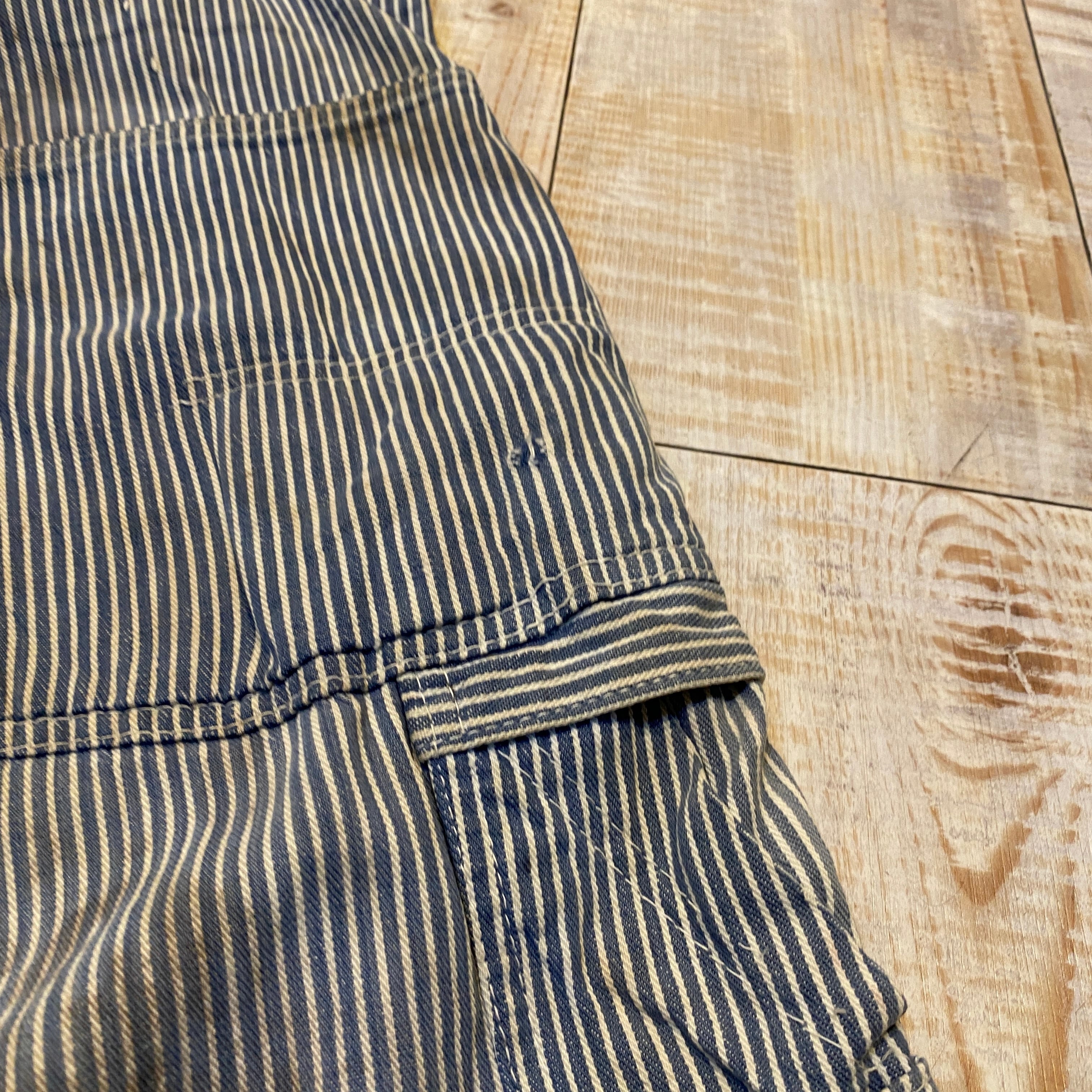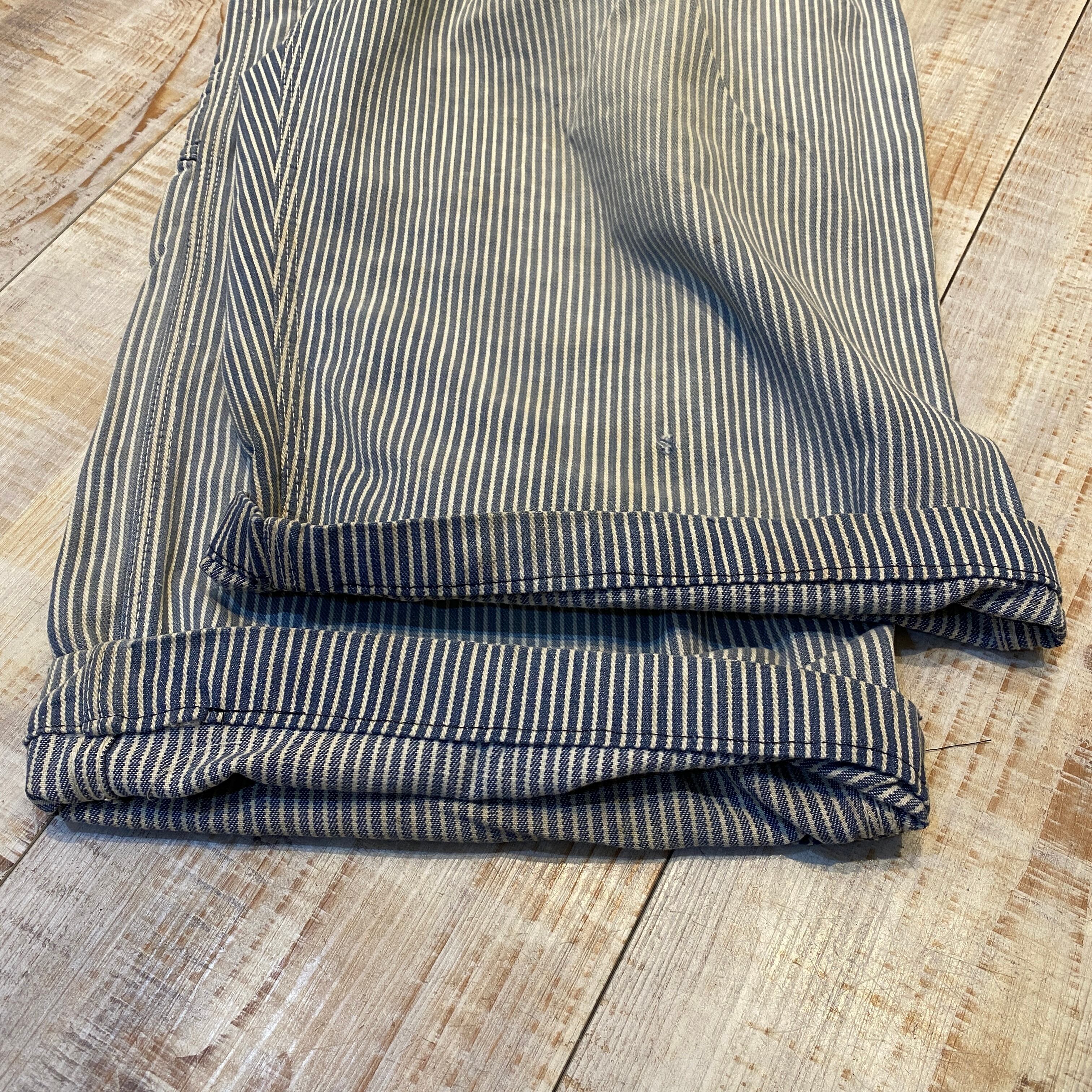 商品説明 :60年代OSHKOSHのヒッコリーオーバーオールになります。春夏定番のヒッコリーで、合わせるトップスがシンプルでも小洒落た雰囲気が楽しめる一本。全体的にリペアや汚れのある雰囲気系です。