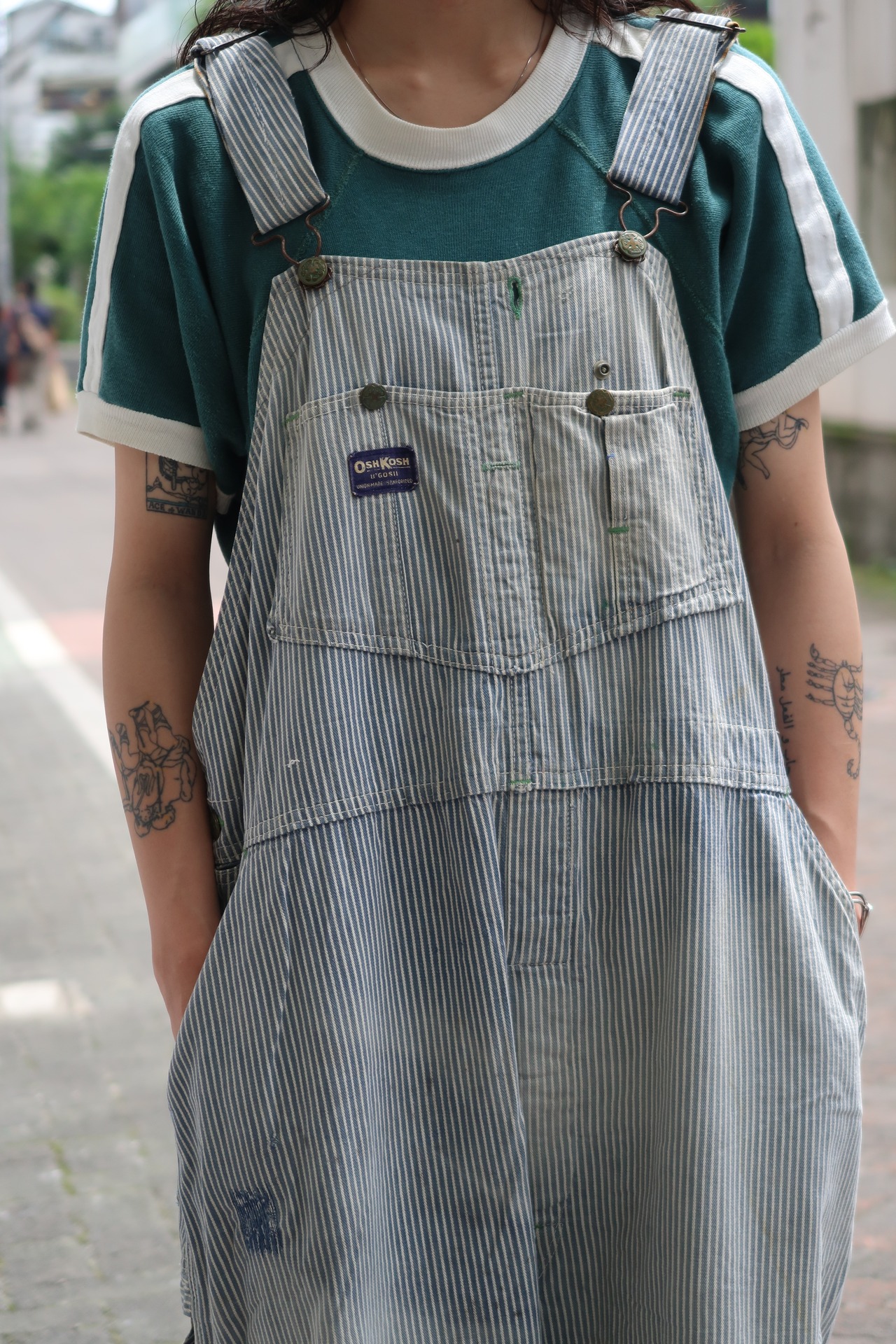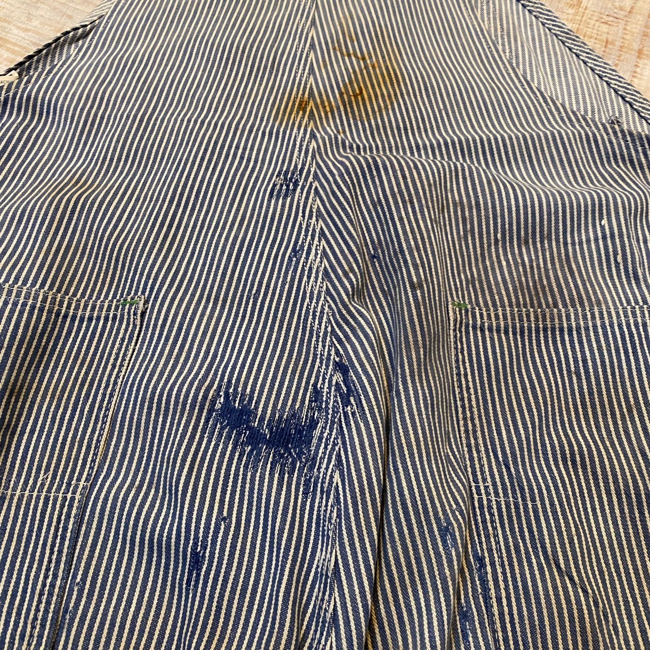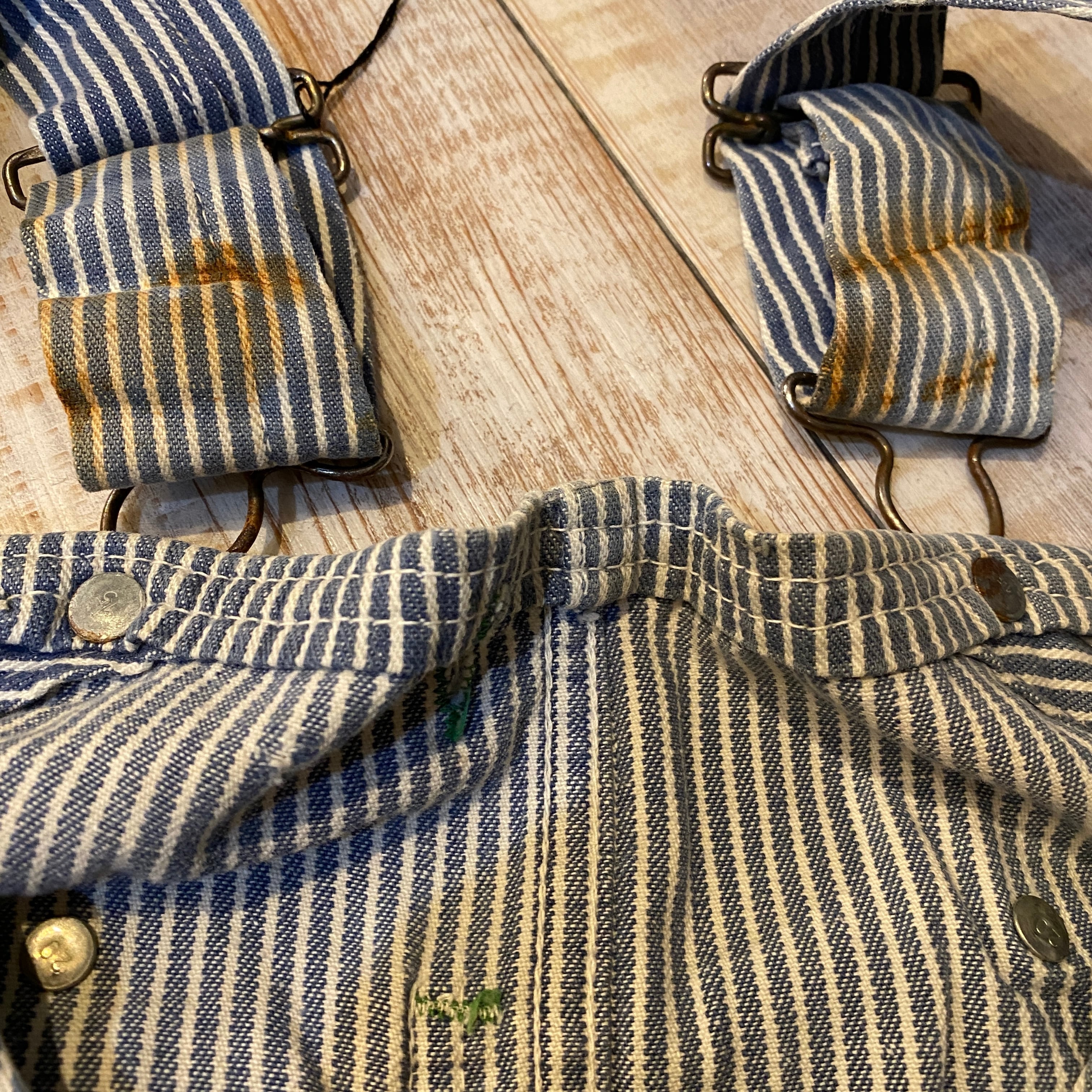 商品説明 :60年代OSHKOSHのヒッコリーオーバーオールになります。春夏定番のヒッコリーで、合わせるトップスがシンプルでも小洒落た雰囲気が楽しめる一本。全体的にリペアや汚れのある雰囲気系です。