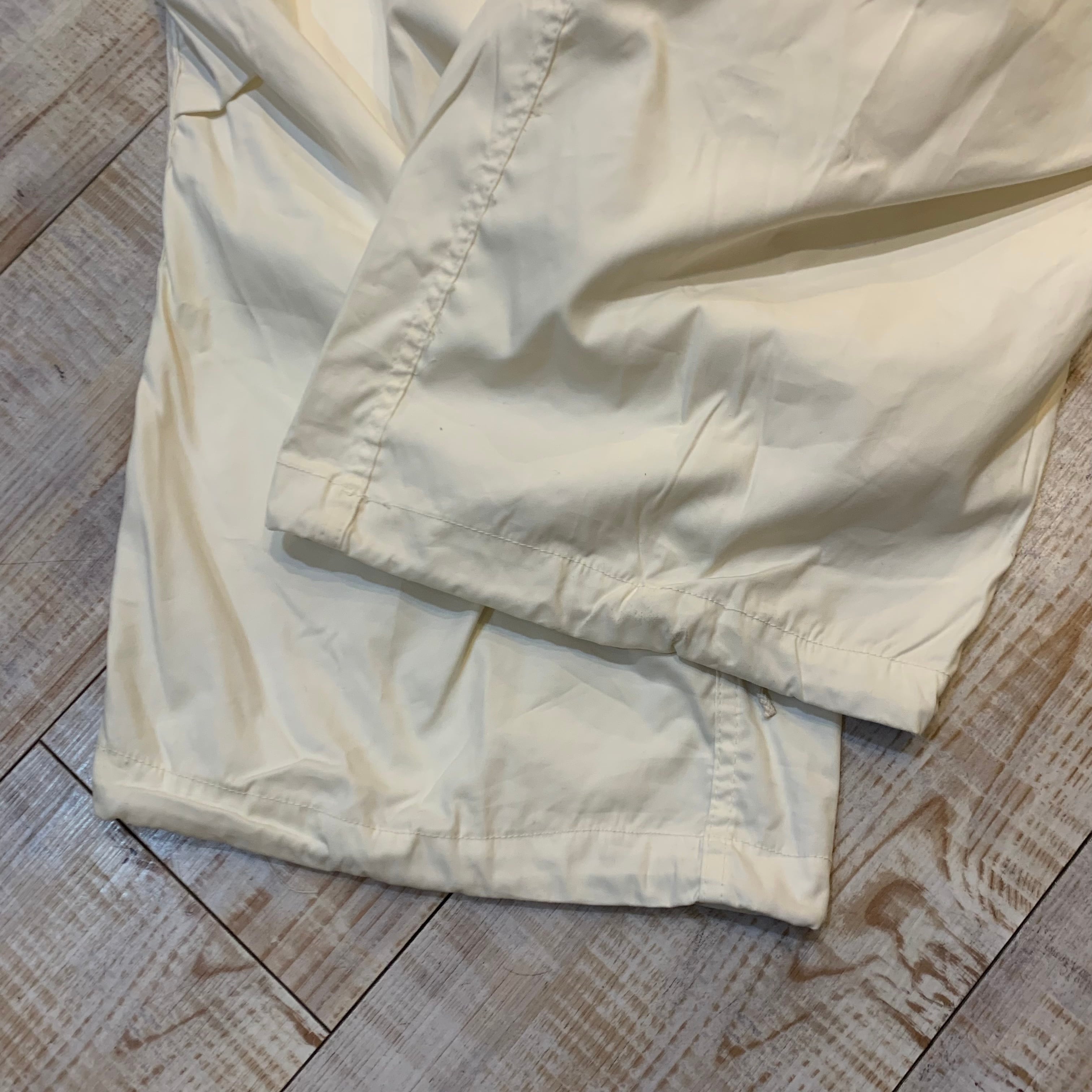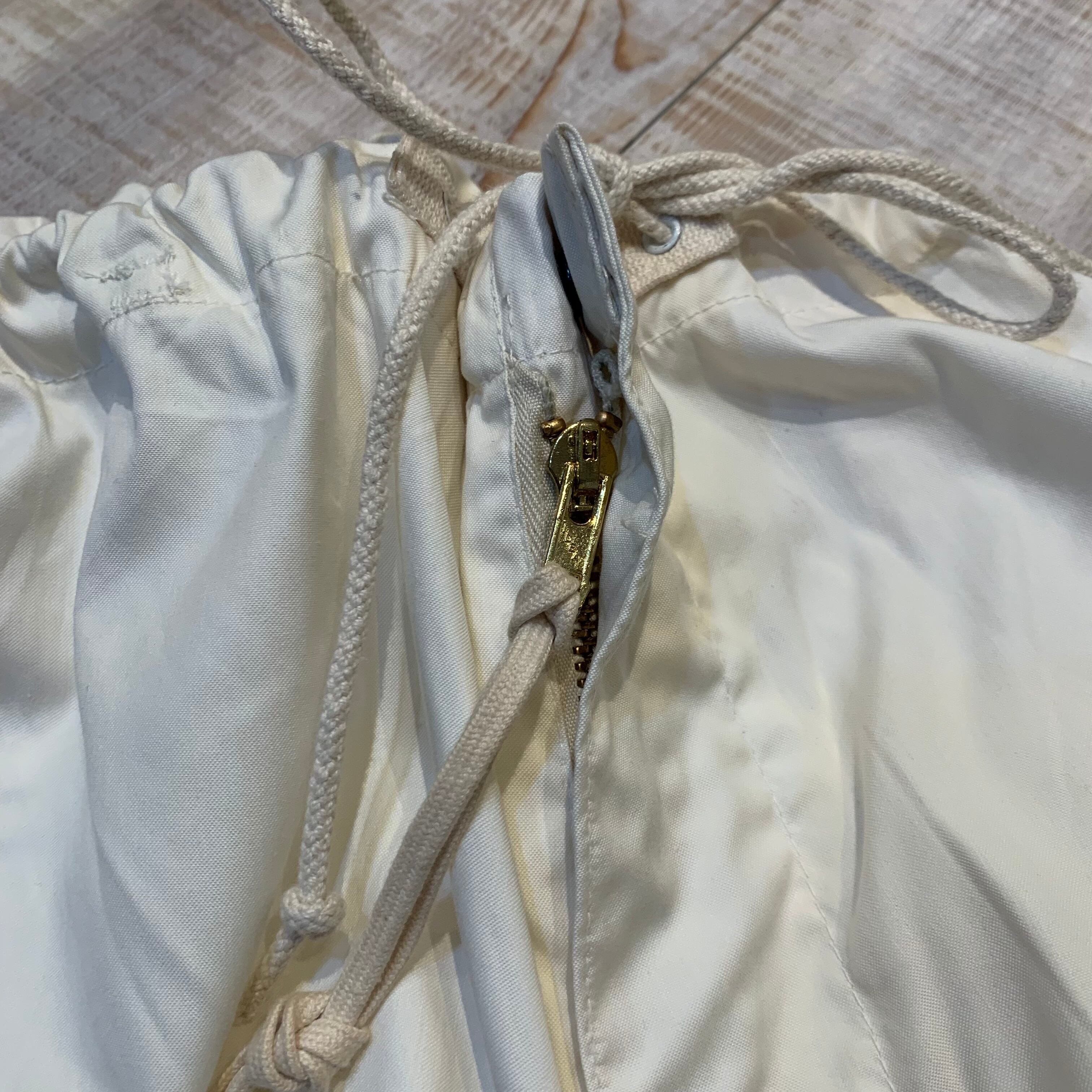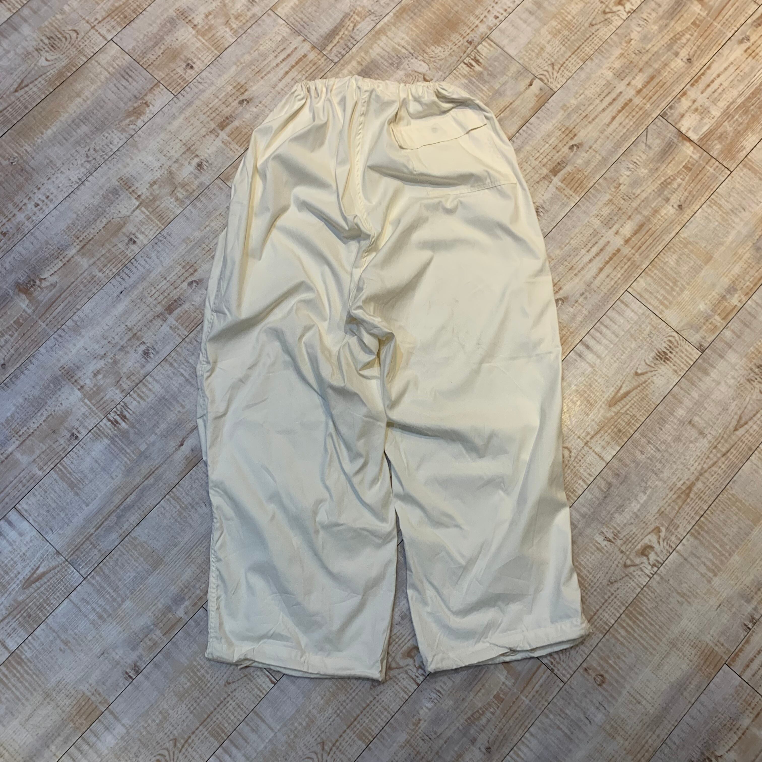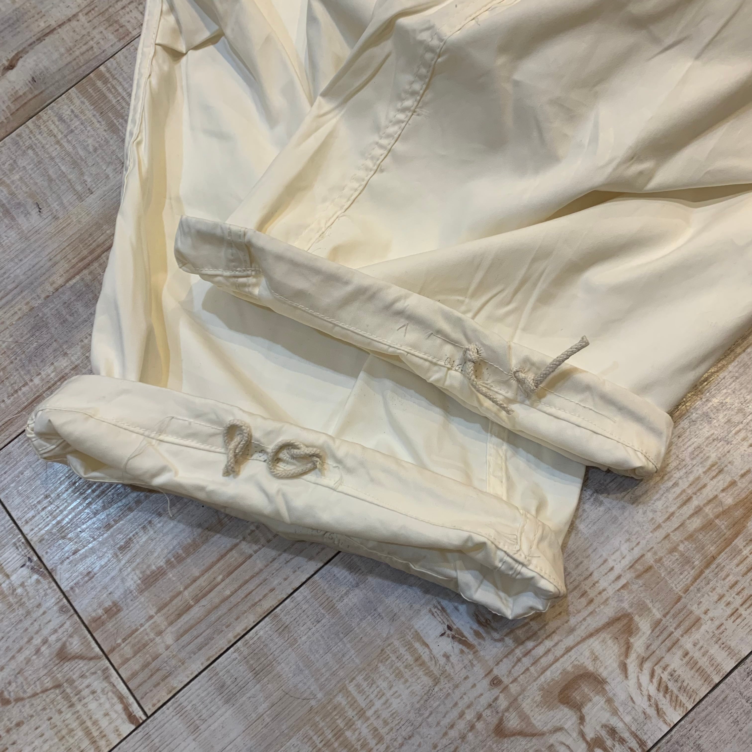 商品説明 :U.S.ARMY スノーカモオーバーパンツになります。降雪地帯での戦闘服として使用されていたアイテムで、オールホワイトカラーの一本。オーバーパンツの為ウエストと裾は紐(ドローコード)にて調整できます。オールホワイトでシンプルな個体ながら存在感のある太さ、無骨さがありながらも上品さも兼ね備え、裾ドローコードがある為様々な表情とディテールを楽しめる逸品です。コットンナイロンのシャリっとした素材で着用時も軽い履き心地です。