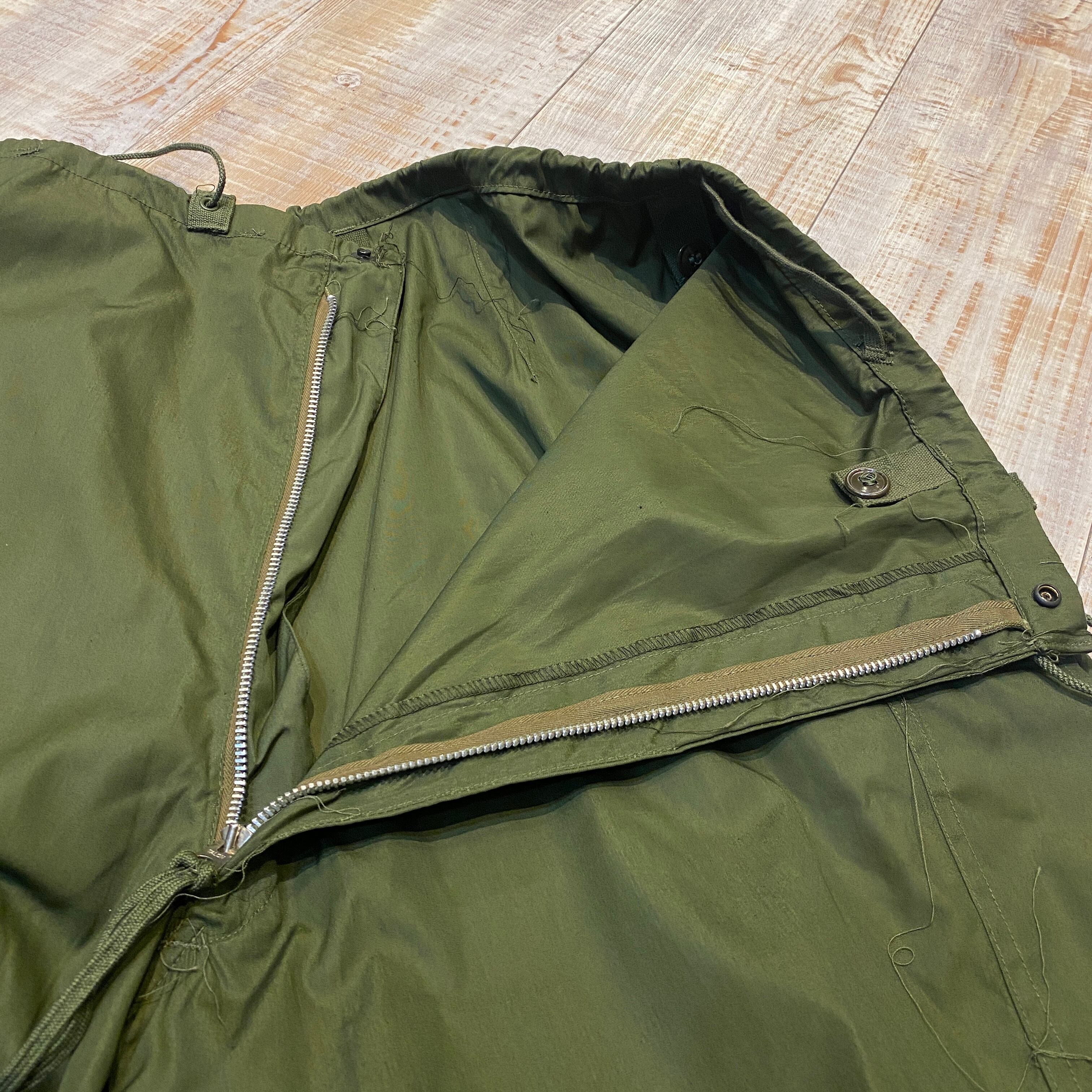 商品説明 :50年代のアメリカ陸軍のオーバーパンツ、SHELL ARCTIC M-1951になります。M51のフィールドパンツの上から着用するための寒冷地用のオーバーパンツの為、ポケットは貫通式、薄手の仕様です。サイドのカーゴポケットとヒップのポケットは機能しております。ウエストと裾はドローコードで調節可能、さらっとした生地は今時期に最適です。