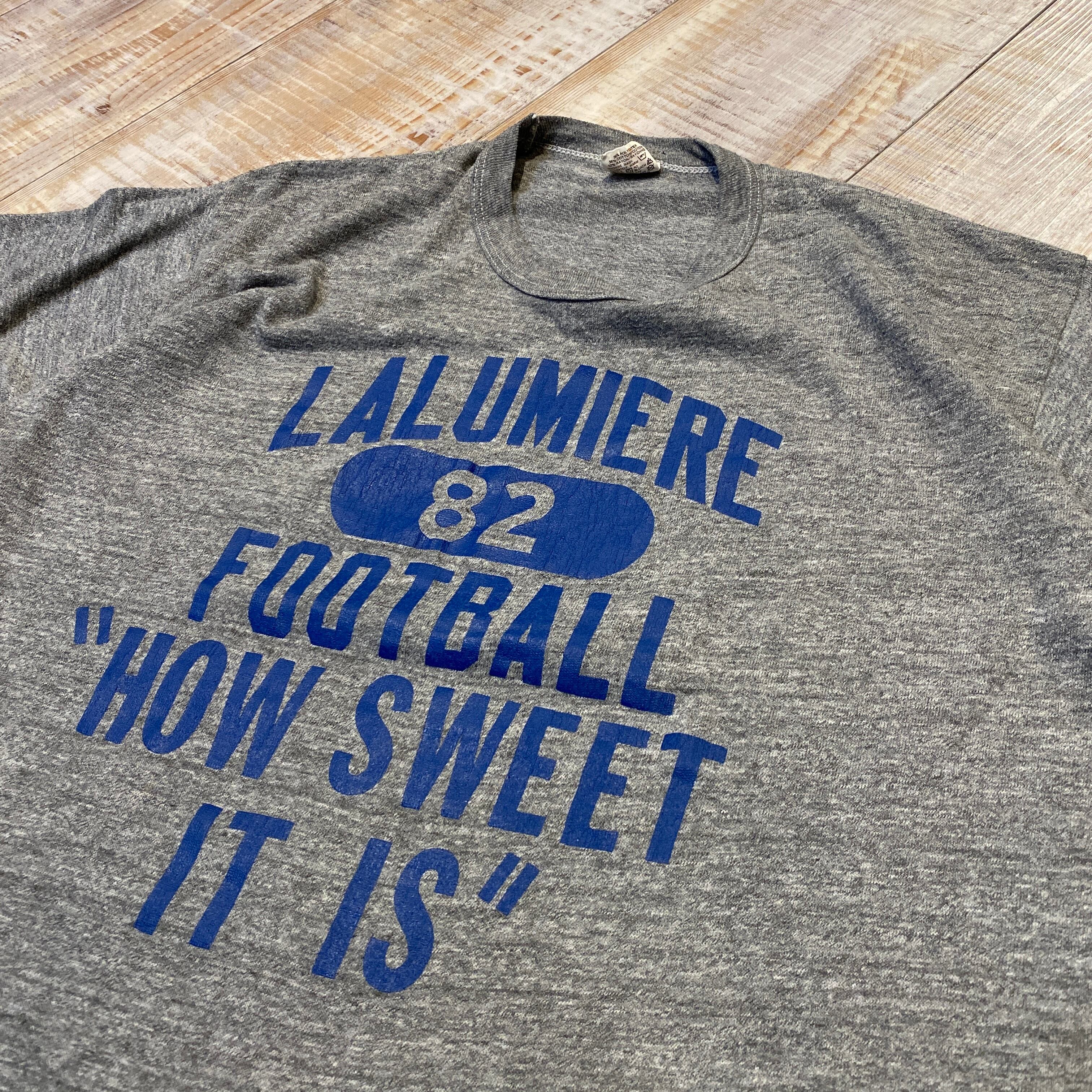 商品説明 :70年代金タグのつくRUSSELLプリントTシャツになります。杢グレーにブルーの5段アーチカプセルのグッドプリント。サイズもLサイズと幅広い方におすすめです。