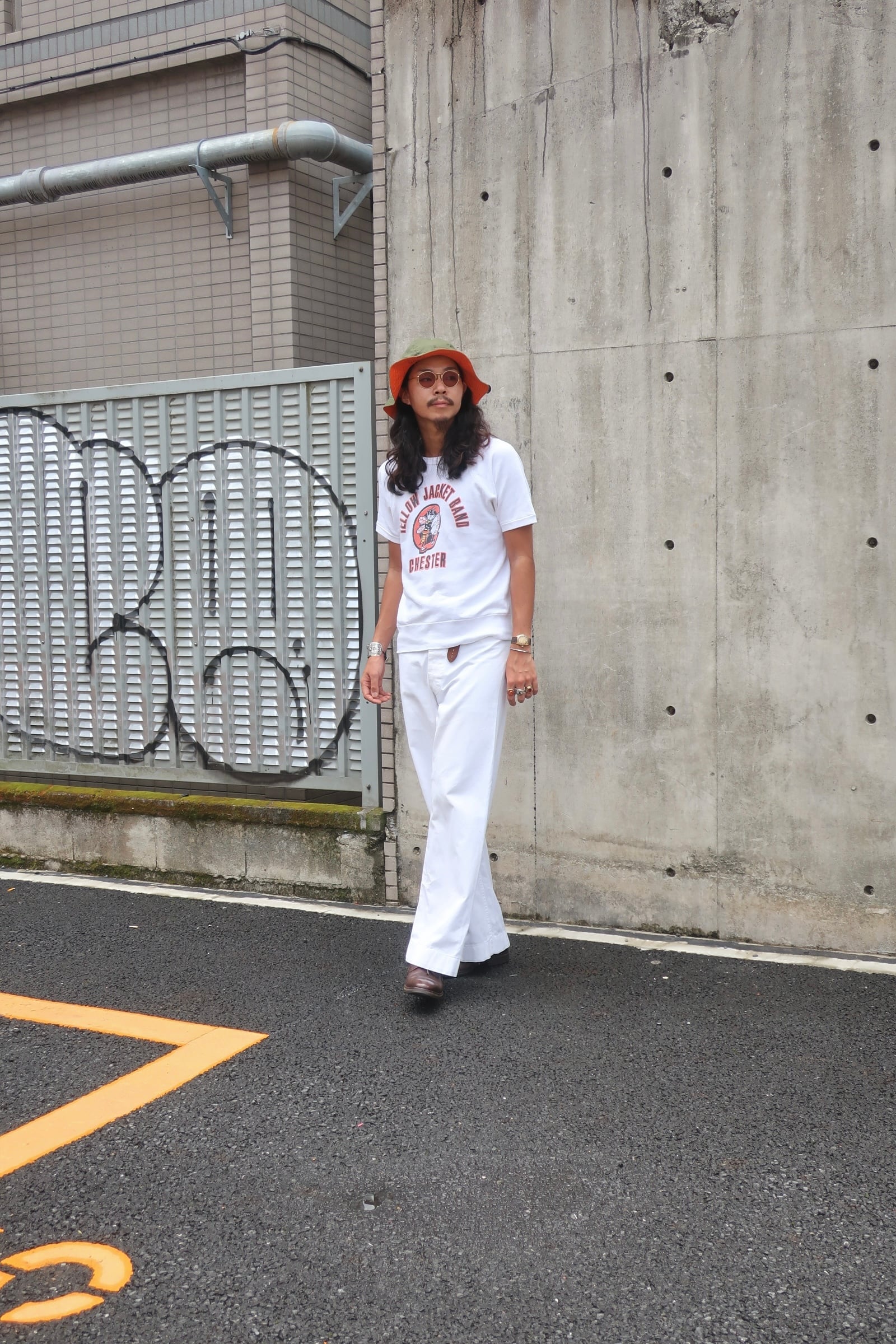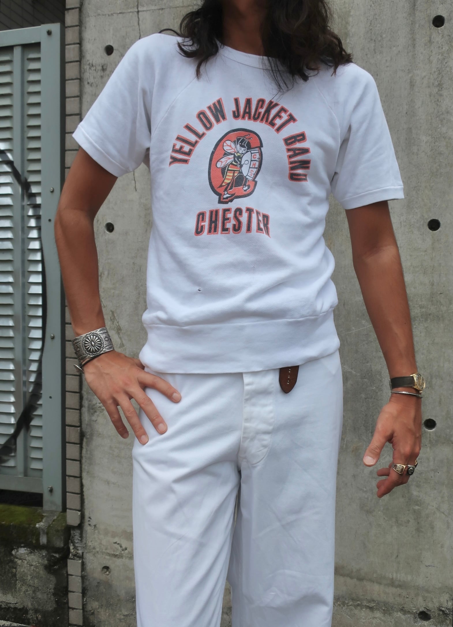 50年代頃のヘインズの半袖スウェットシャツ。球数が少なく人気が高い”BREEZE SHIELD”です。ホワイトボディ×染み込みプリントのグッドコンビネーション。コットン100%の割には比較的柔らかく肌触りの良い生地感です。