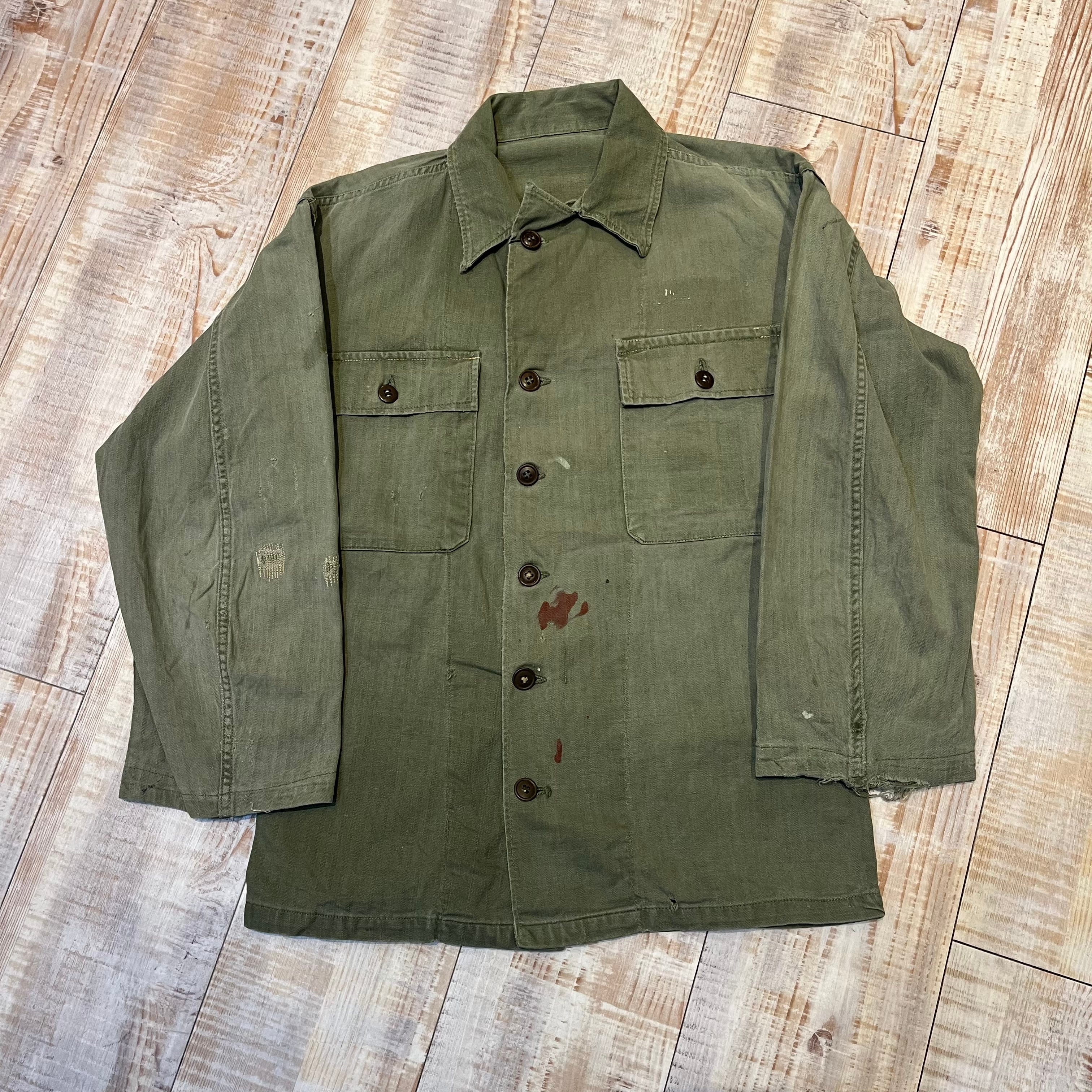 商品説明 : 40年代のアメリカ軍のM-47 HBTジャケットになります。後継のユーティリティーシャツへと続く原型で、採用期間も短い貴重なジャケットとなります。ボディには風合いの良いヘリンボーン、尿素ボタン、ボタンカフスのない筒袖仕様。