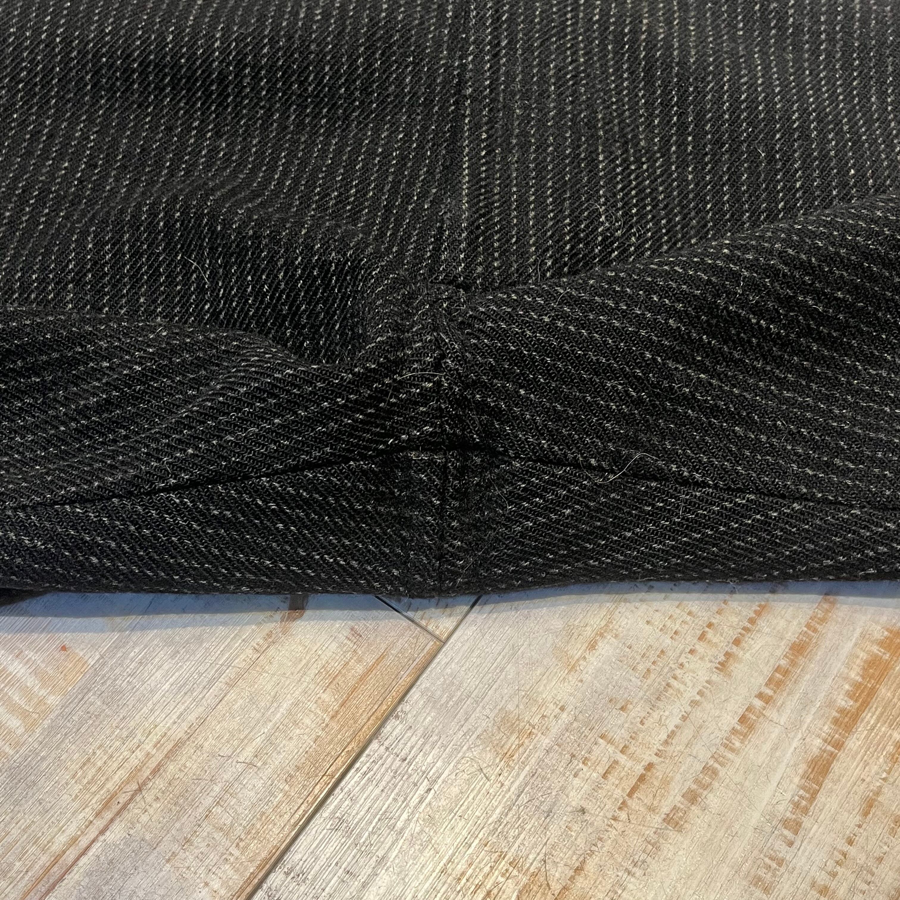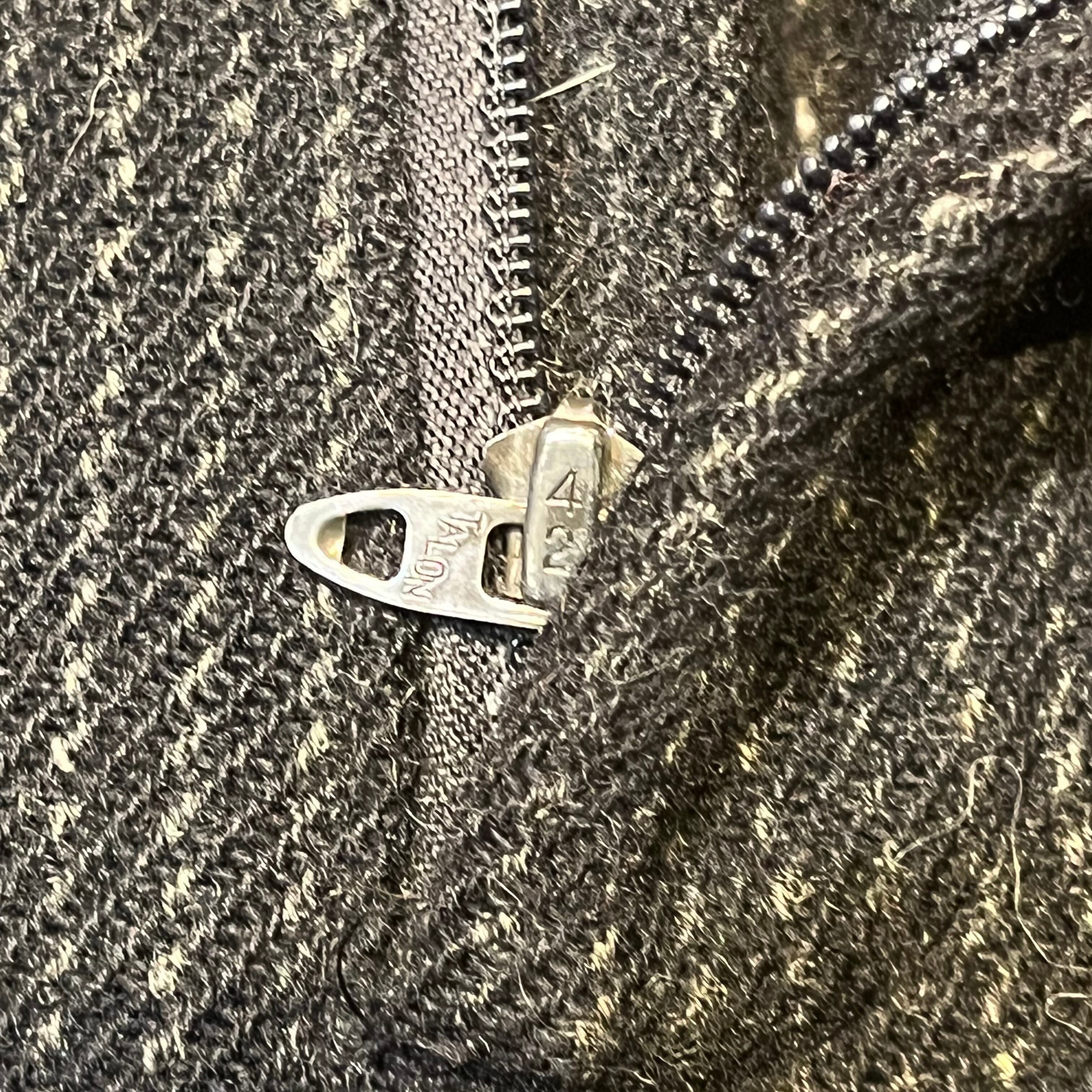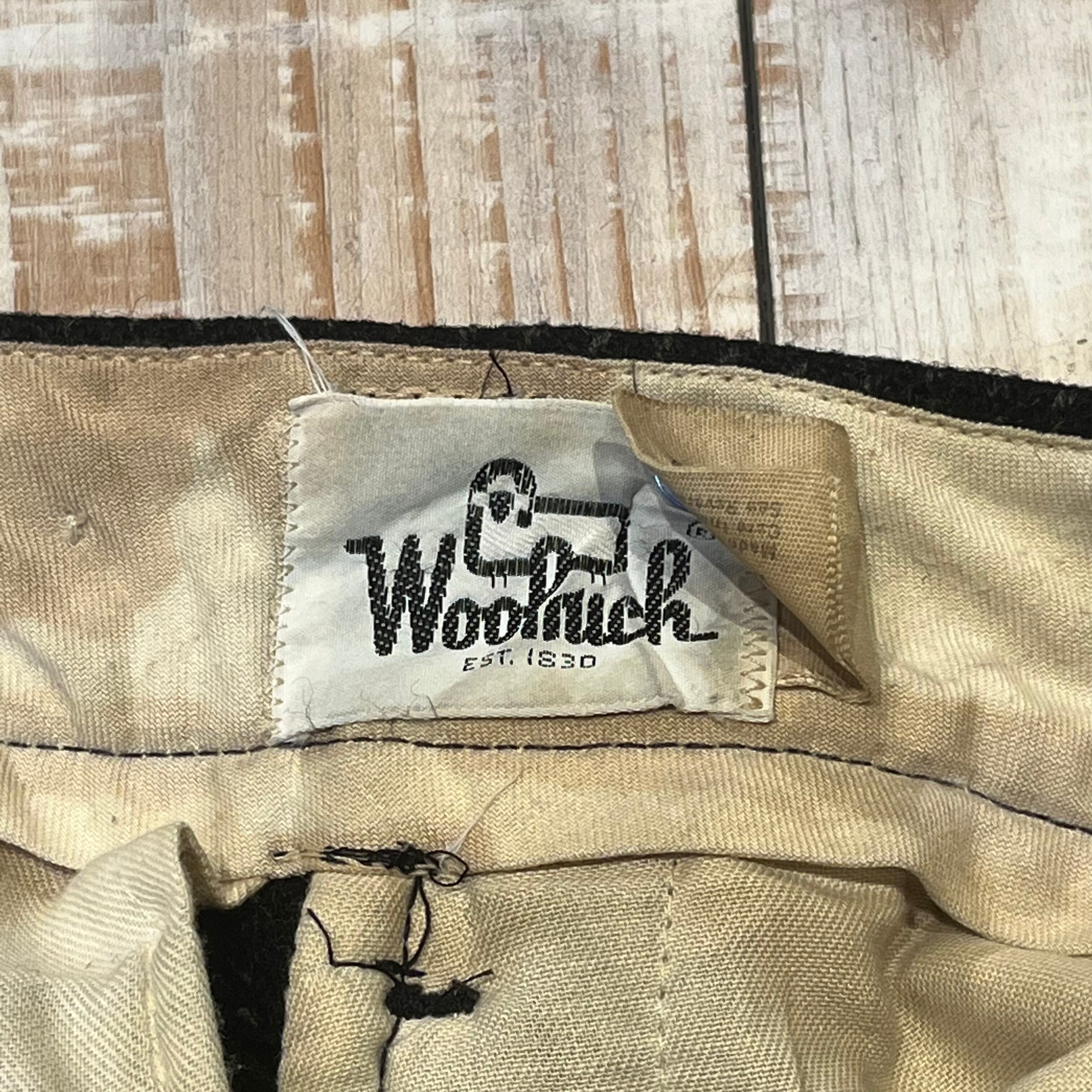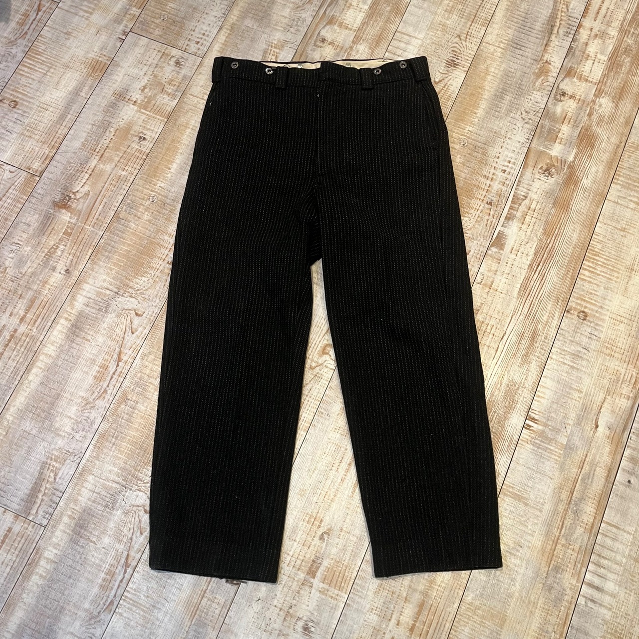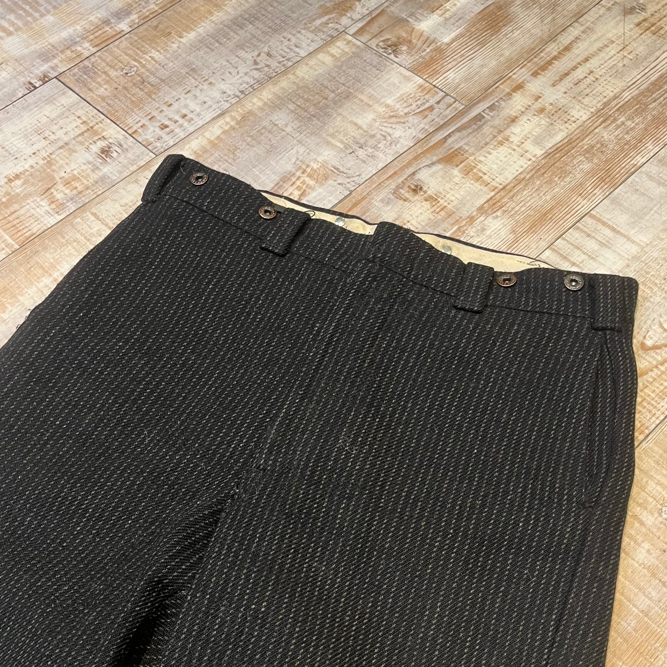商品説明 :アメリカ製 70年代 ウールリッチの ウールスラックスになります。タグ、42talonジップから70年代と判別可能です。厚手のウール生地で仕立てられており、ブラックにホワイトのストライプが目を引きます。ウエストバンドには打ち込みのドーナツボタンが付いているため、サスペンダーを使って着用可能です。