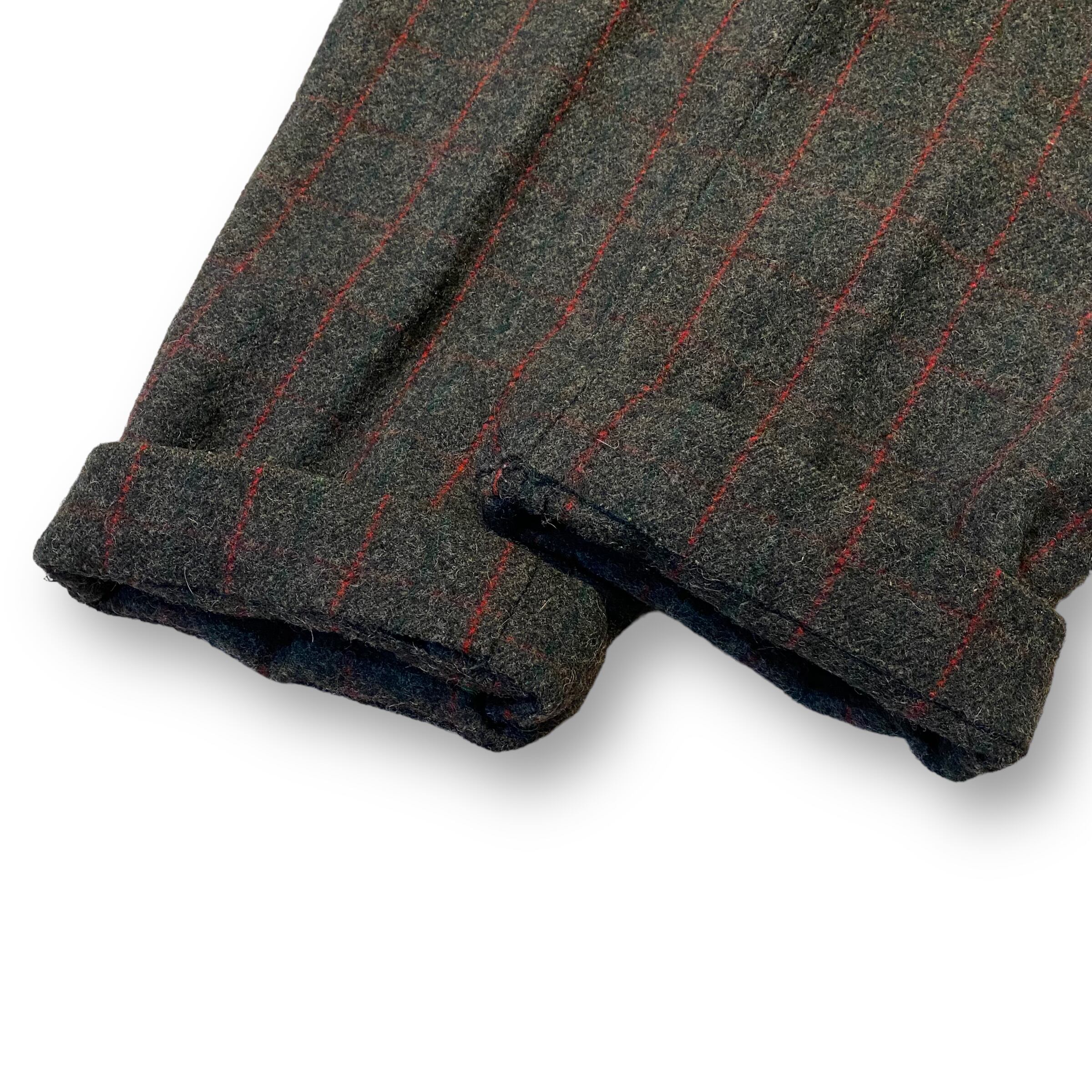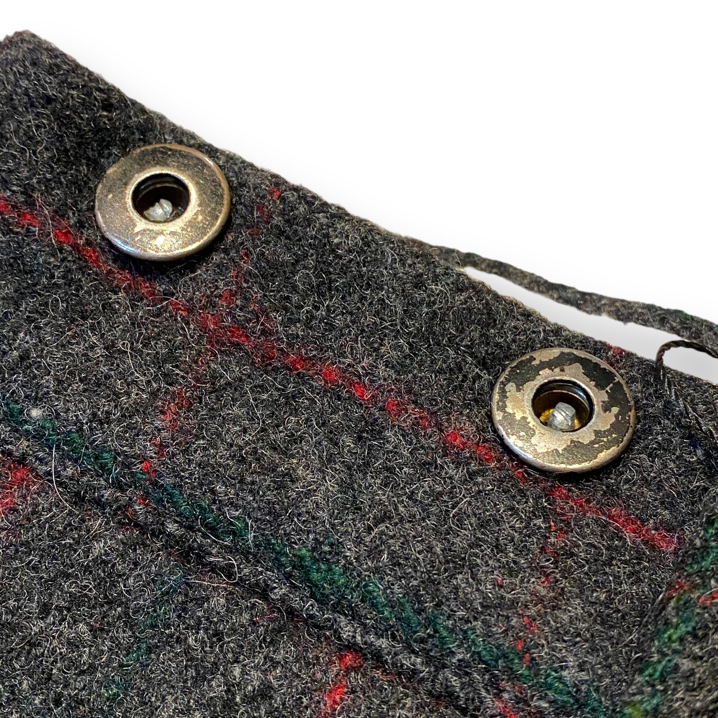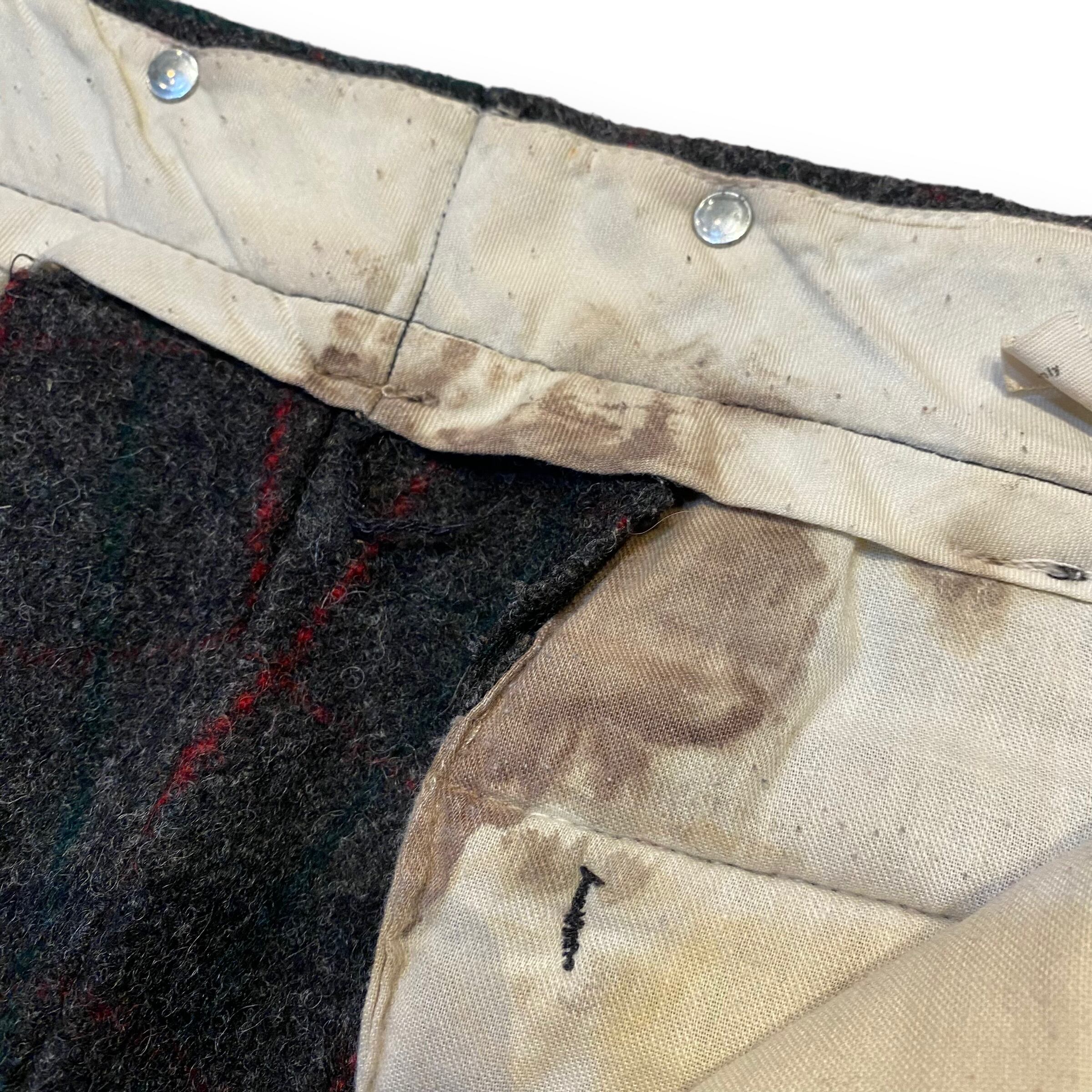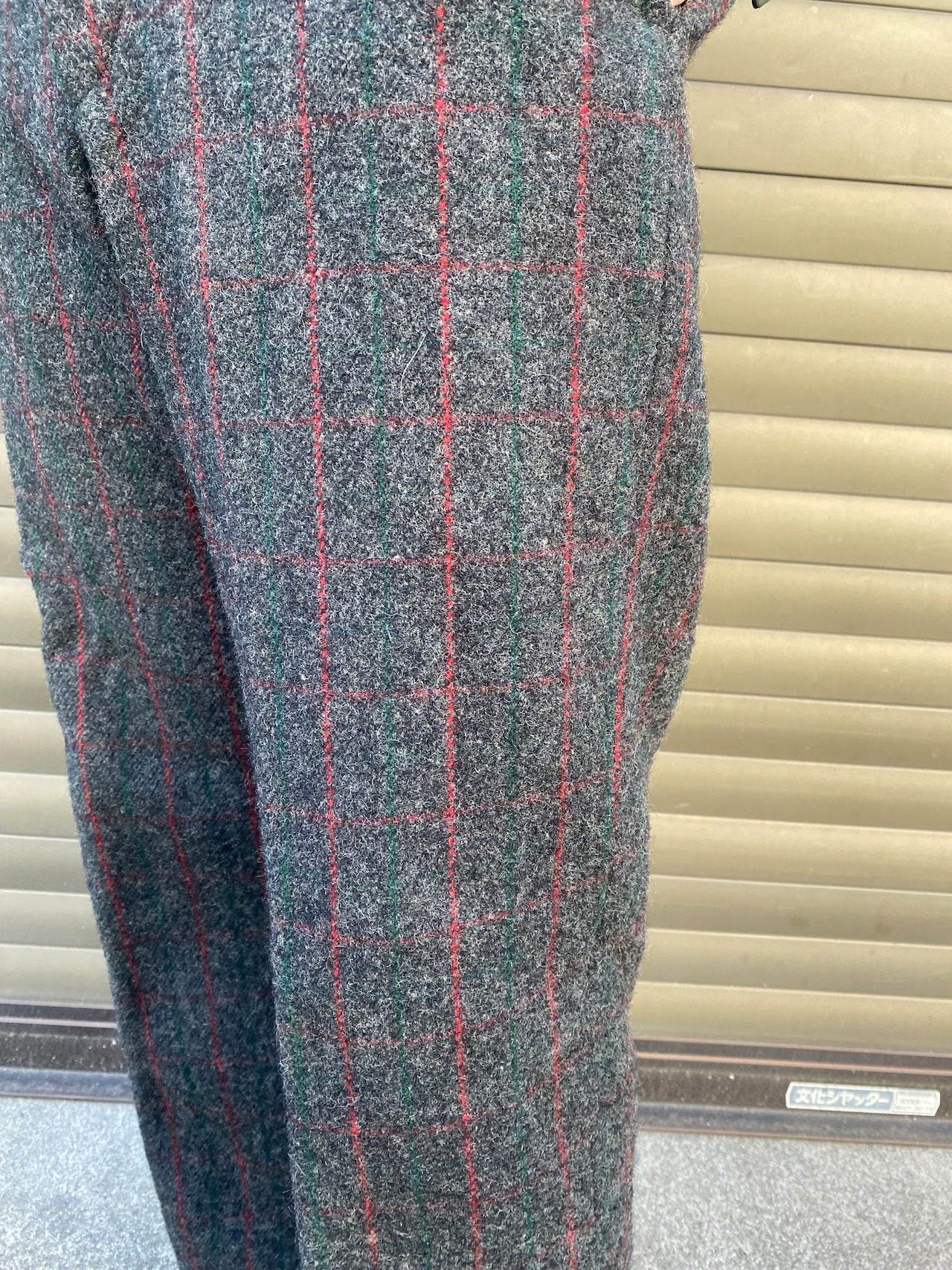 商品説明 :アメリカ製 70年代 ウールリッチの ウールスラックスになります。タグ、42talonジップから70年代と判別可能です。厚手のウール生地で仕立てられており、チャコールグレーにレッド×グリーンのライン走るお馴染みの一本。ウエストバンドには打ち込みの黒ラッカーボタンが付いているため、サスペンダーを使って着用可能です。