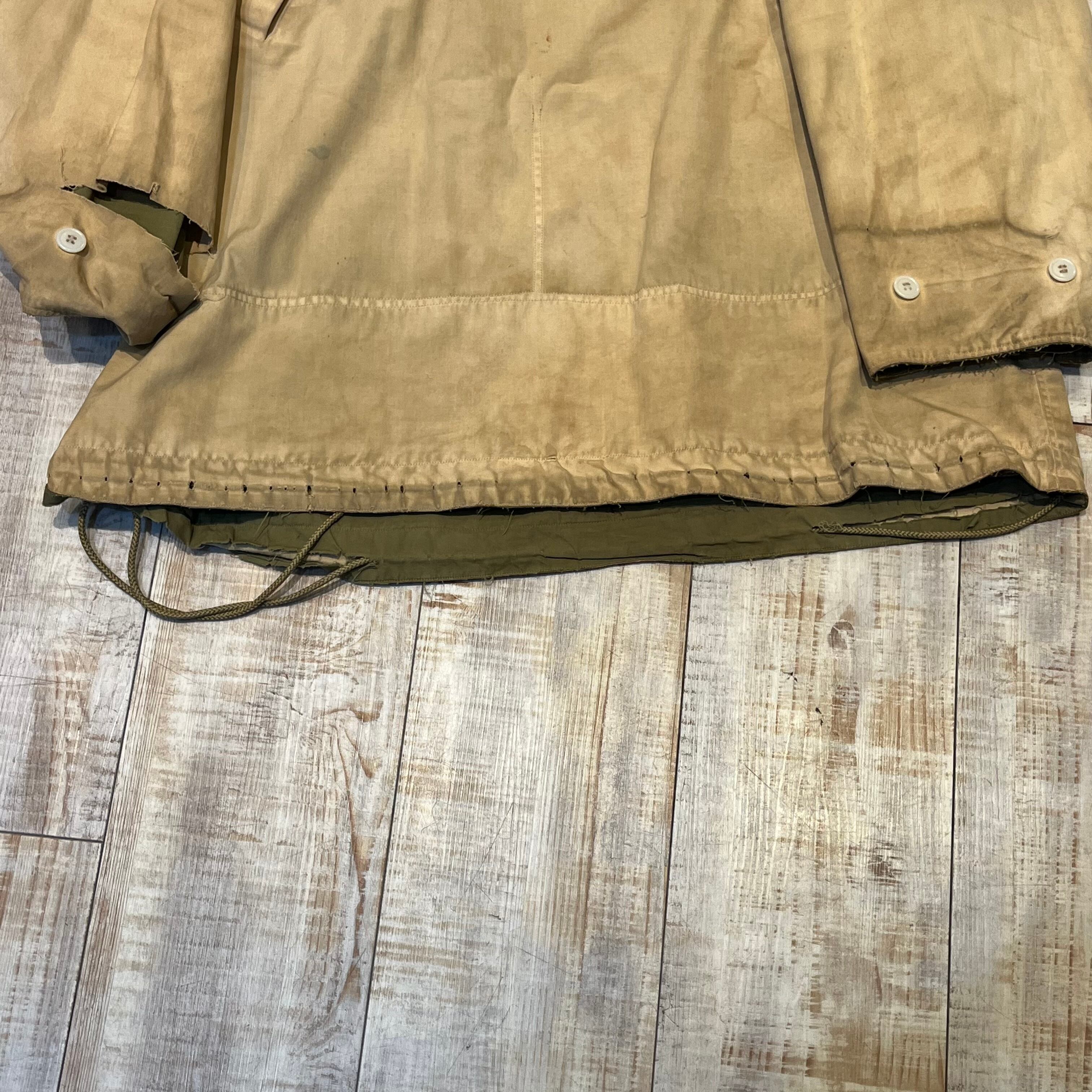 商品説明 :40年代米軍の山岳部隊リバーシブルパーカになります。長い着丈とコヨーテファー、フラップ付きのドラポケが特徴的。ウエストに絞りがなく、ストンと落ちるロング丈でモッズコートのような感覚だが、プルオーバーなので、新鮮な感覚で着用できる一着。