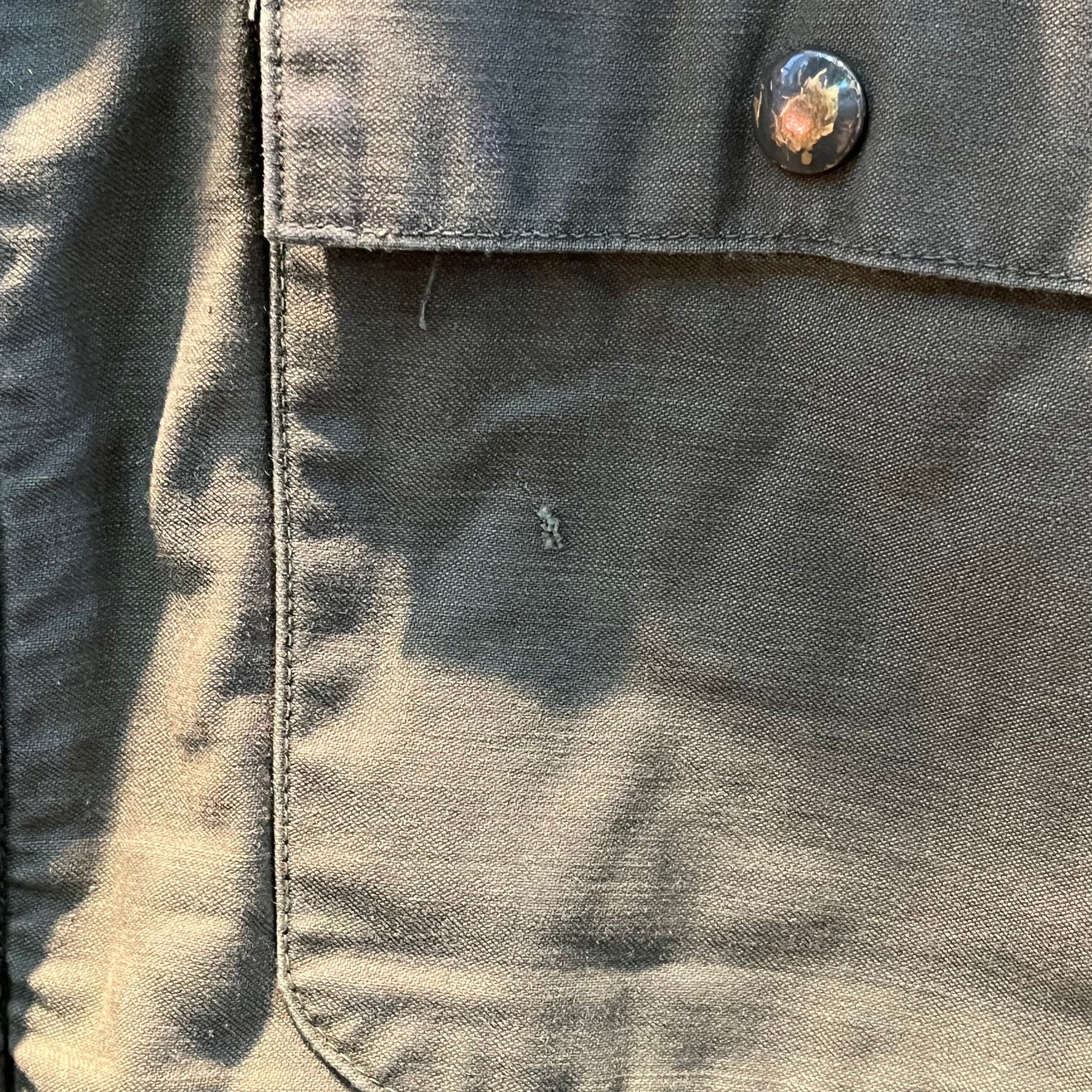 両袖、右フロントポケット付近、背面に汚れ、左胸ポケット付近にペン跡、小穴。