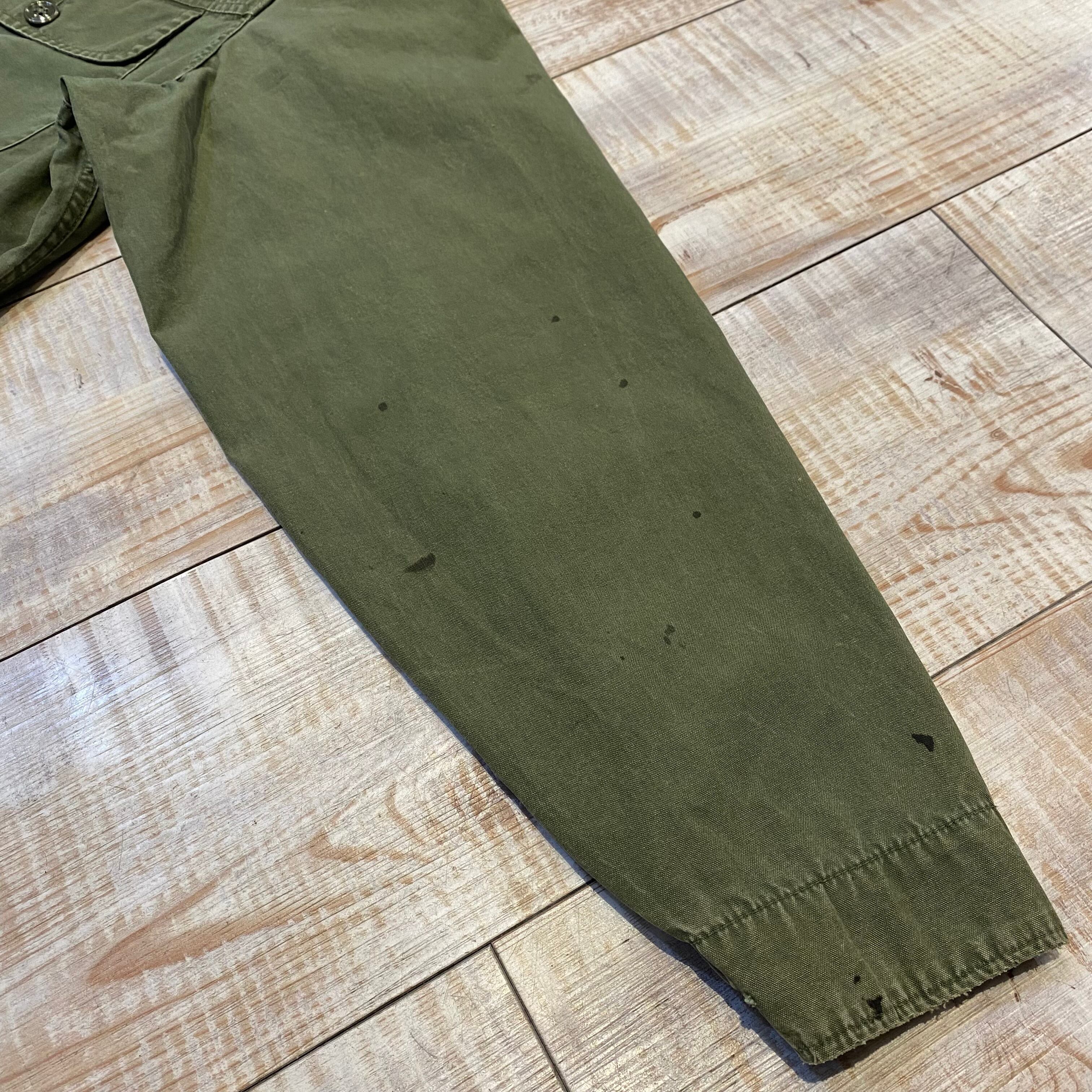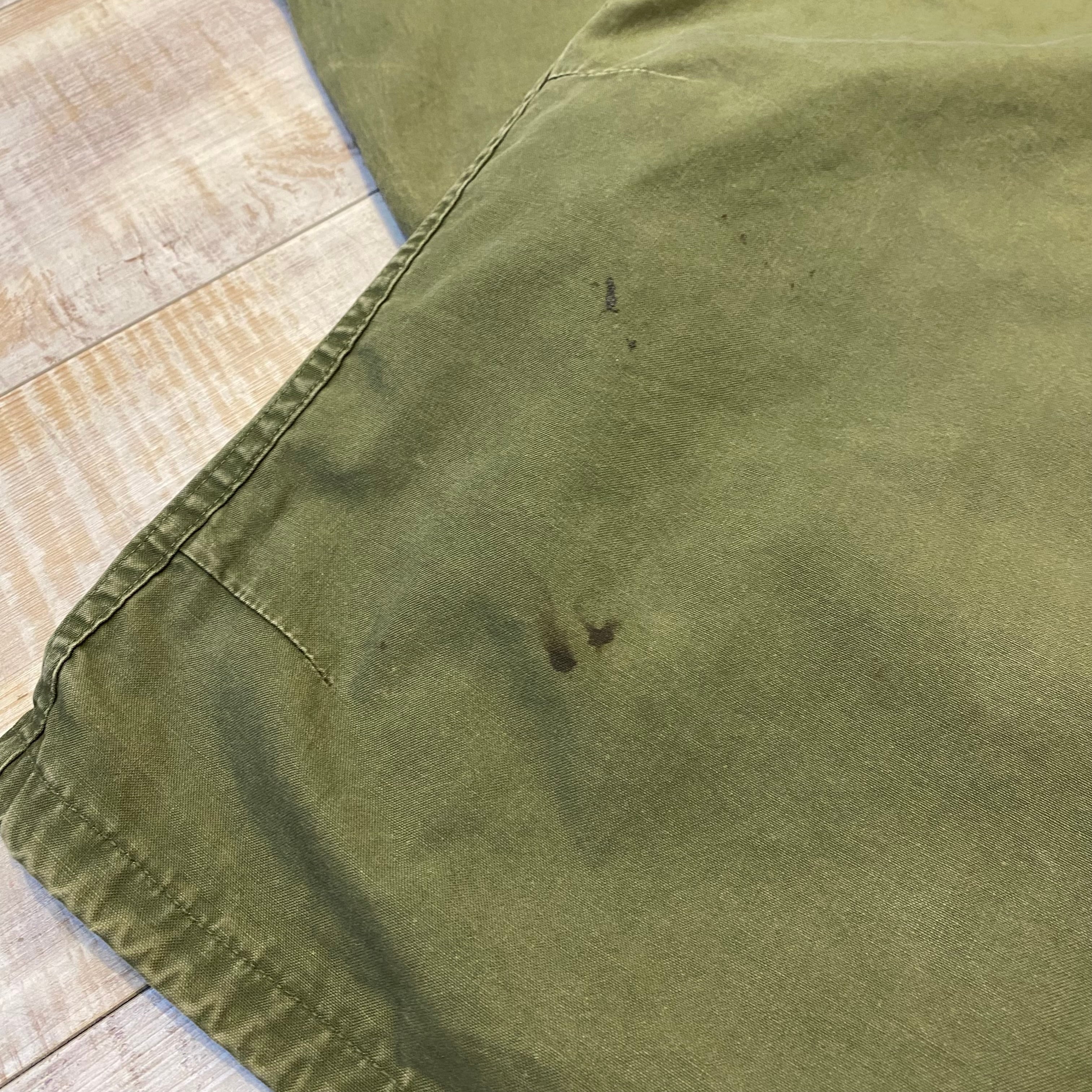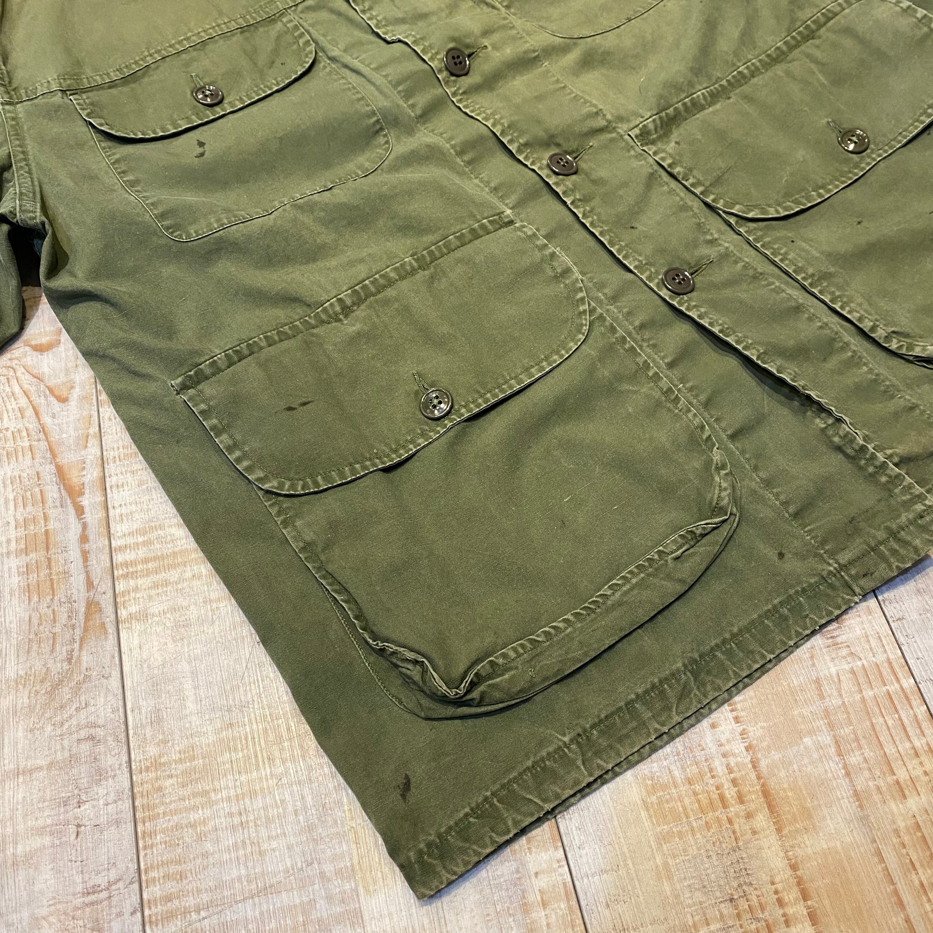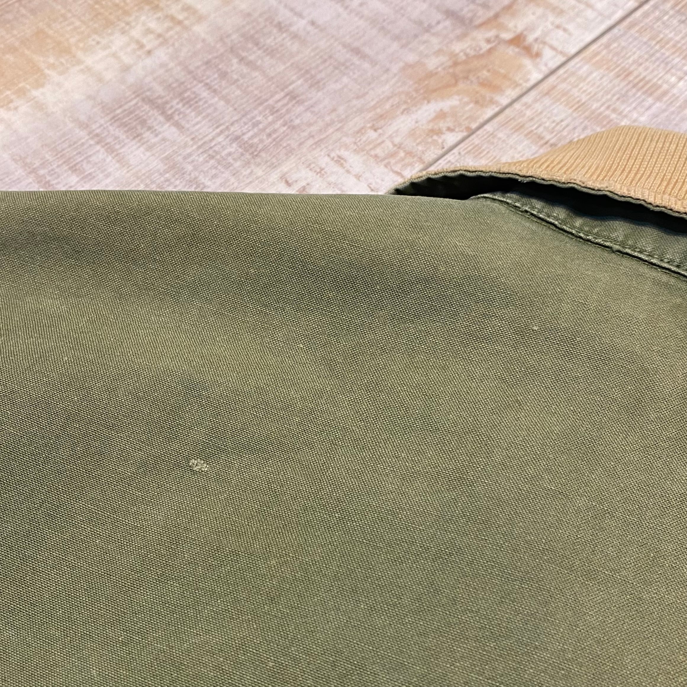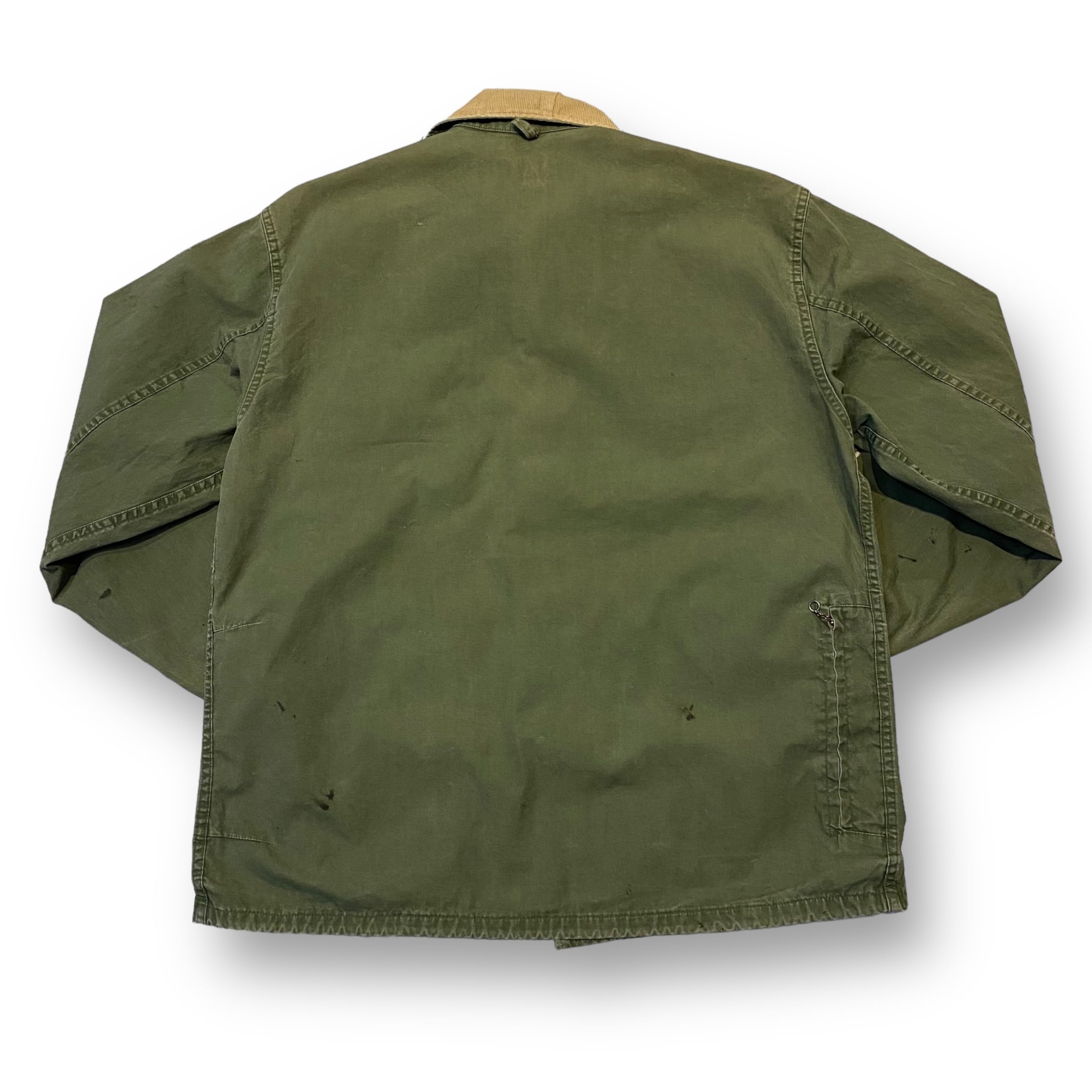 オリーブポプリンの柔らかい生地に左右対称にあしらわれたフロント4つポケットが非常にかっこいい1着。全体に汚れは見られますが、ダメージ等は少なく欠損しがちな首元のストラップも残っている個体。非常に出にくくなったアイテムですがサイズは42とゴールデンサイズになります。この機会に是非。