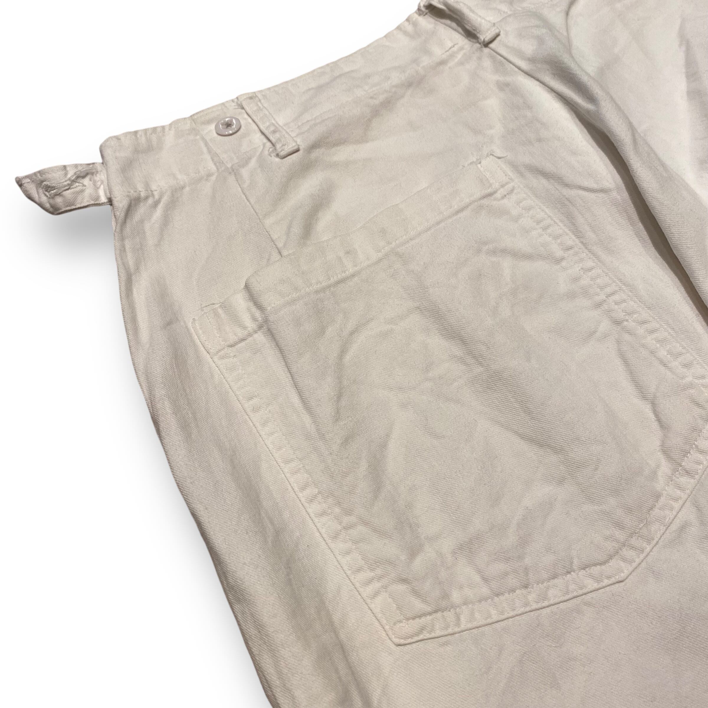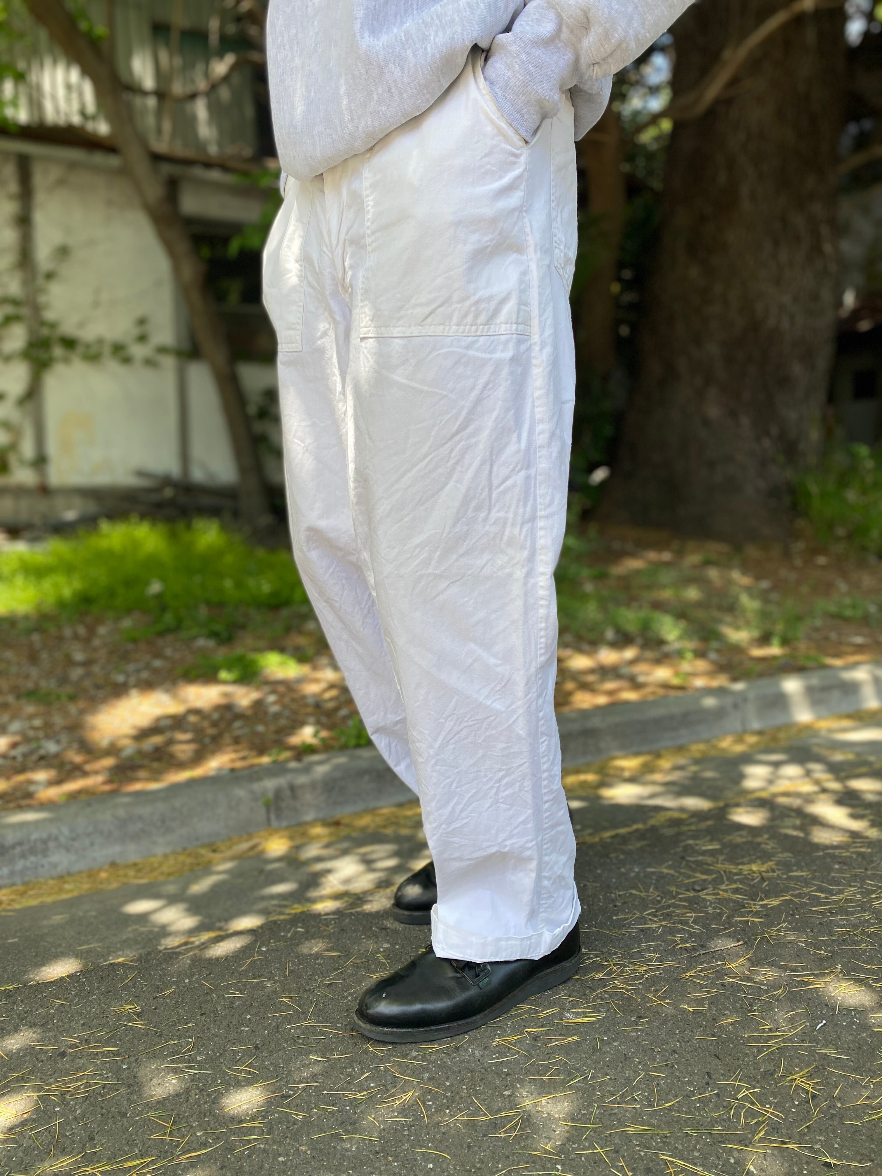 商品説明 :60年代から70年代頃のU.S.ARMYのフードハンドラーパンツになります。通常ミルクパンツやホワイトベイカーとも言われる非常にレアなパンツで、ベイカーパンツ同様にフロントのL字型ポケットやサイドアジャスターが付きます。