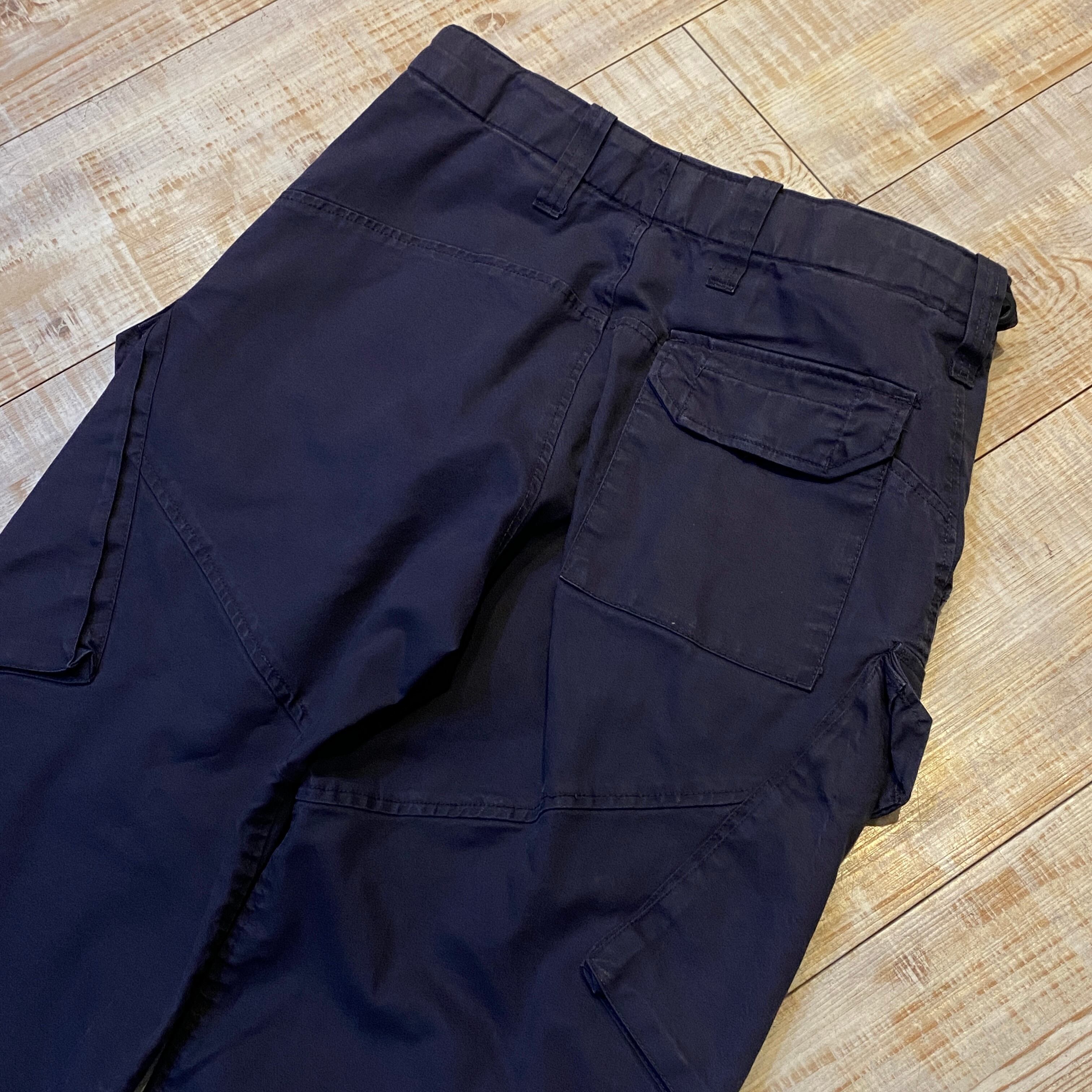 商品説明 : イギリス軍ロイヤルネイビーのコンバットパンツになります。6ポケットのサイドポケットがつく所謂"カーゴパンツ"ですが、ポケットが斜めについている点や、ウエストのタック、ボタンなど米軍物とは一線を画すデザインになっています。バックポケットはフラップ付き、裾はドローコードが着く為ディテールの変化も楽しめます。