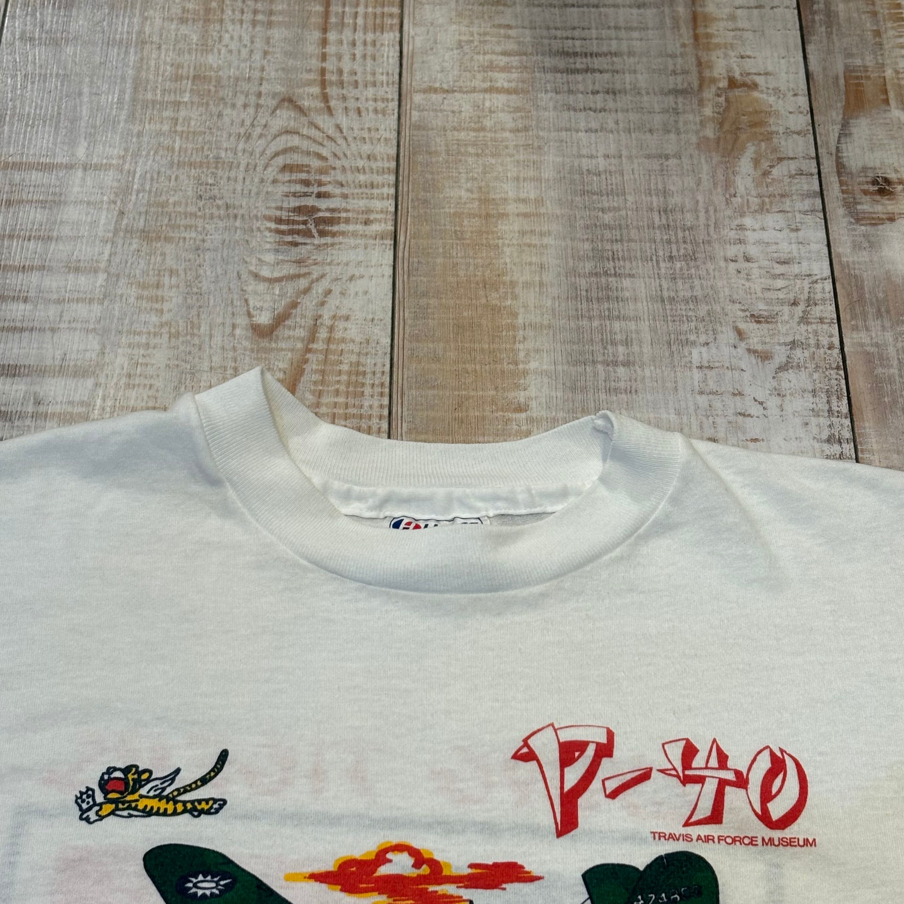 商品説明 :90年代HanesのプリントTシャツになります。フロントにはP-40航空機、バックにはブラッドチットのプリント。TRAVIS AIR FORCE MUSEUMで当時販売されていたTシャツだと思われます。両面共にかっこいいプリントが魅力のおすすめの1着。
