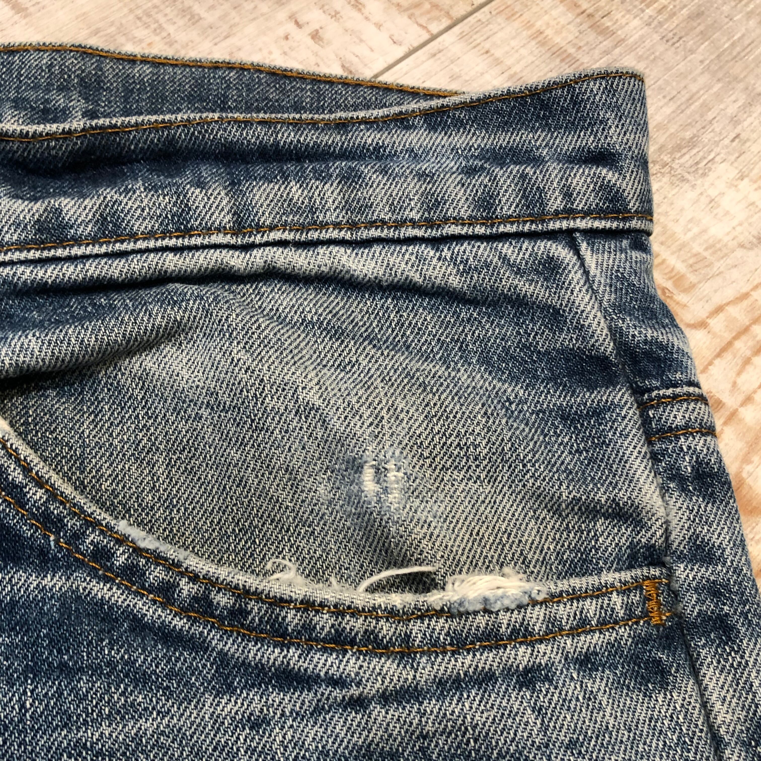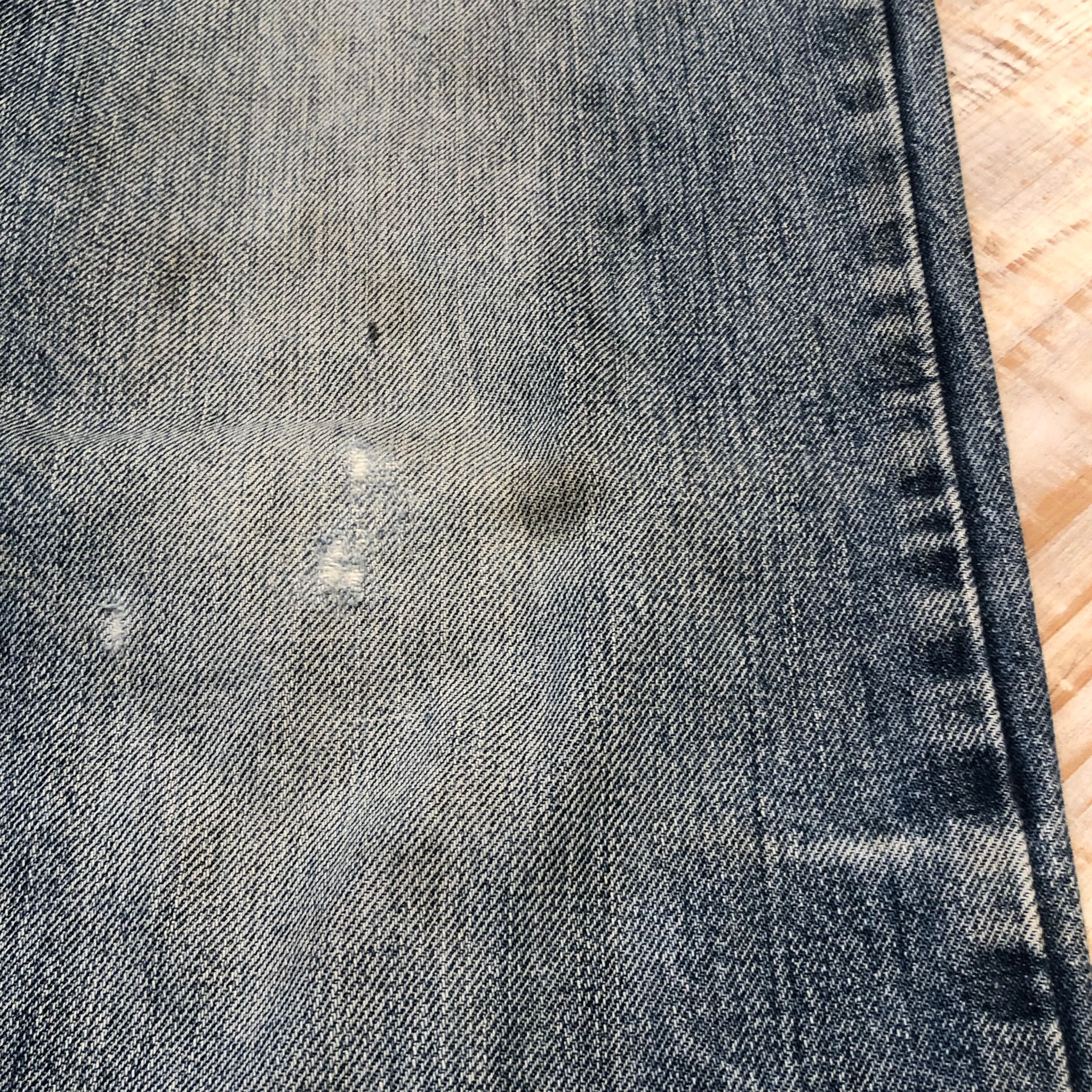 フロントジッパー右横付近、股箇所、左膝箇所に小さくリペアがございます。