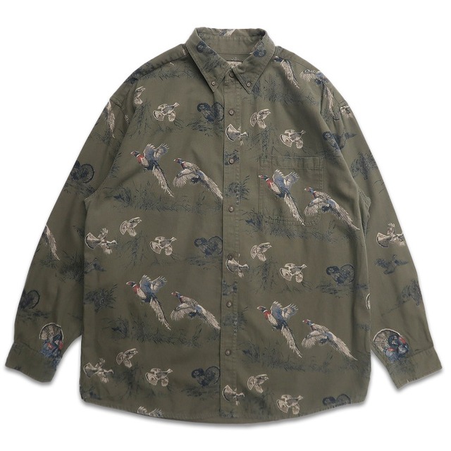 古着 WOODS & WATER 総柄 長袖シャツ キジ柄 アニマル柄 オリーブグリーン 表記:XL gd408476n w60128